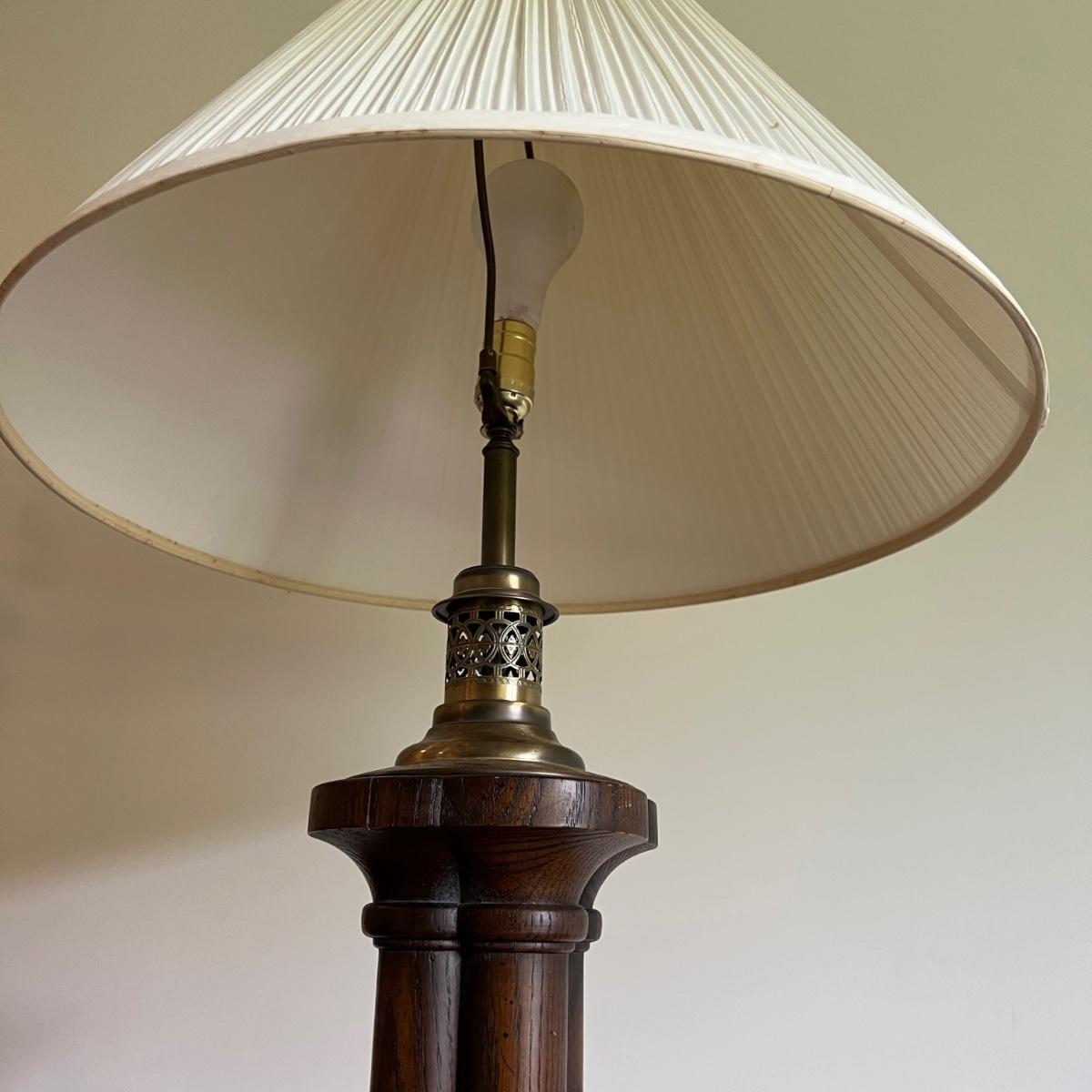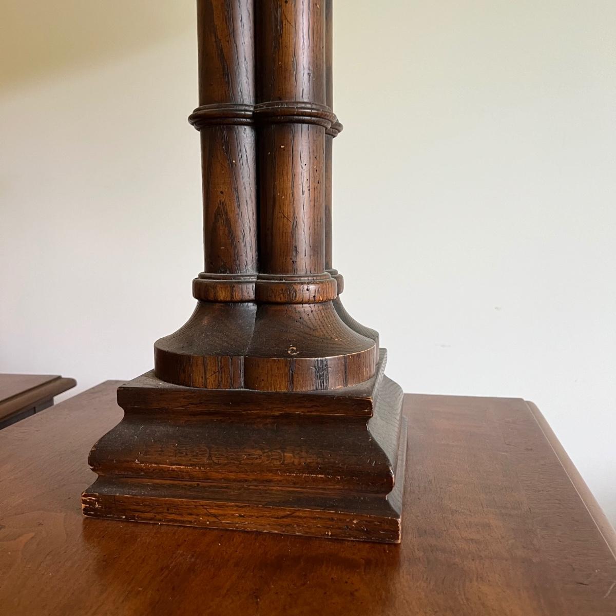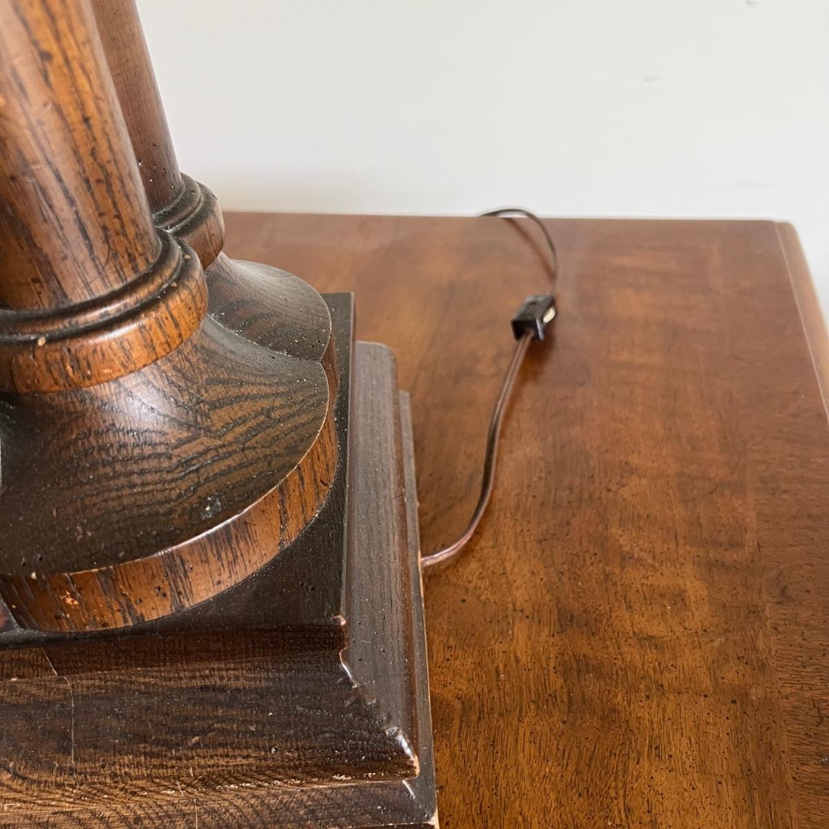 Large wooden table lamp with cream fabric shade. The lamp base measures 8.5” square. The shade measures approximately 22”D x 14” H. The lamp measures 40” H and functions when plugged in. Notice on/off switch on cord.