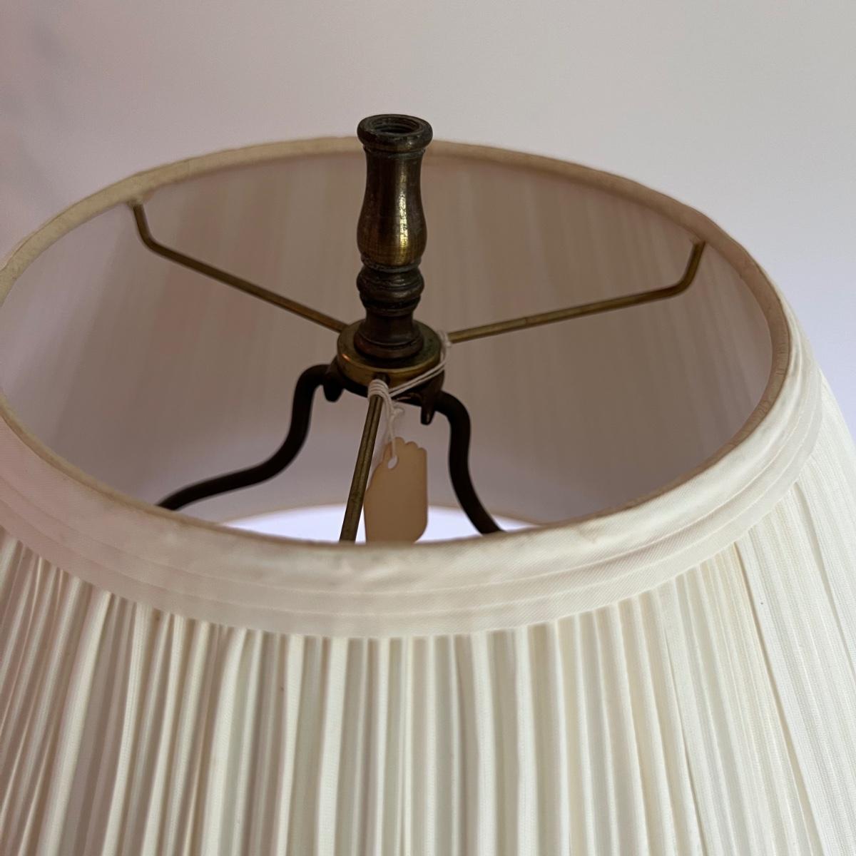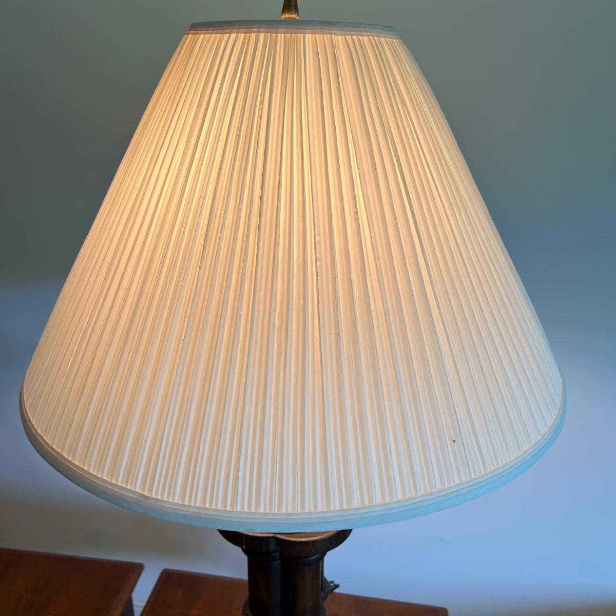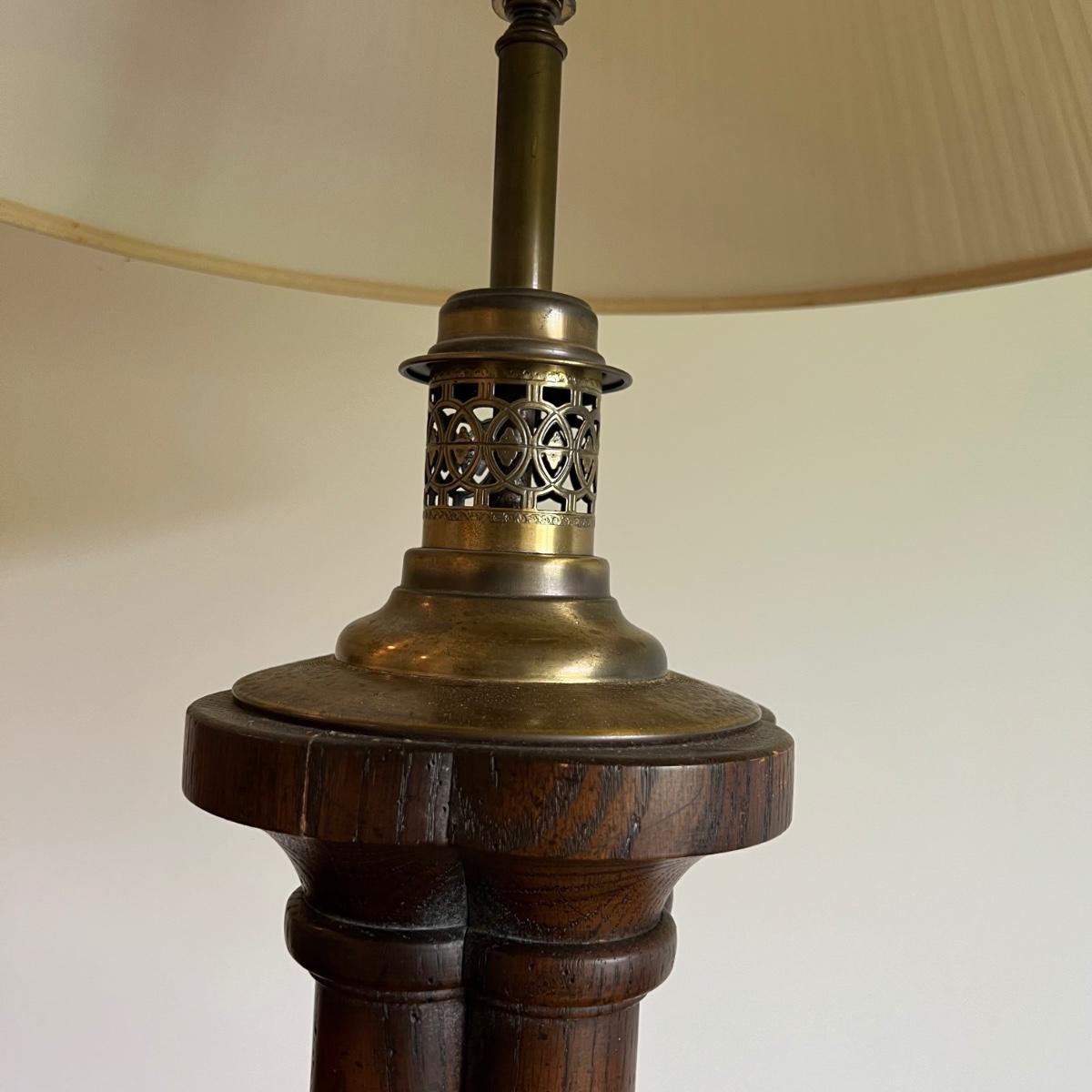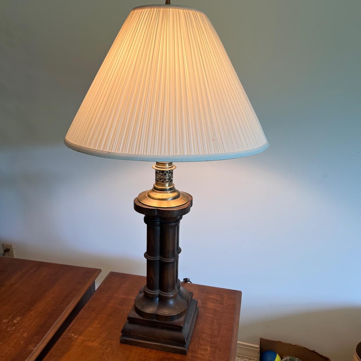 Large wooden table lamp with cream fabric shade. The lamp base measures 8.5” square. The shade measures approximately 22”D x 14” H. The lamp measures 40” H and functions when plugged in. Notice on/off switch on cord.