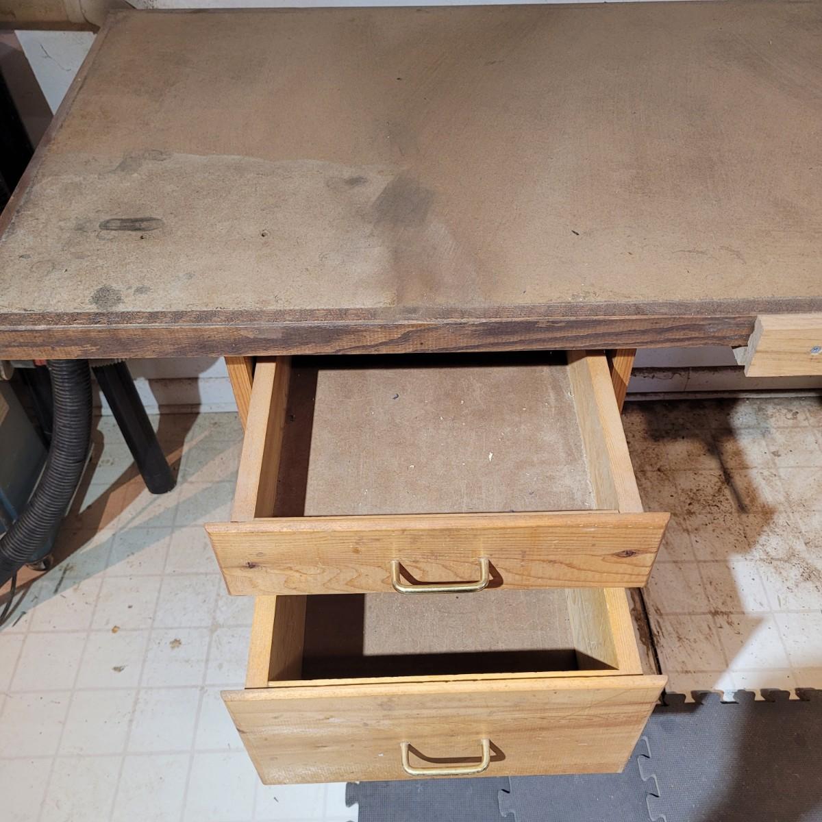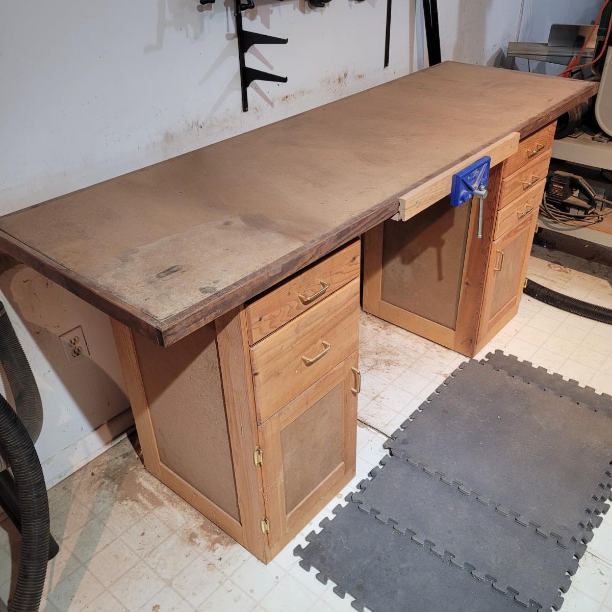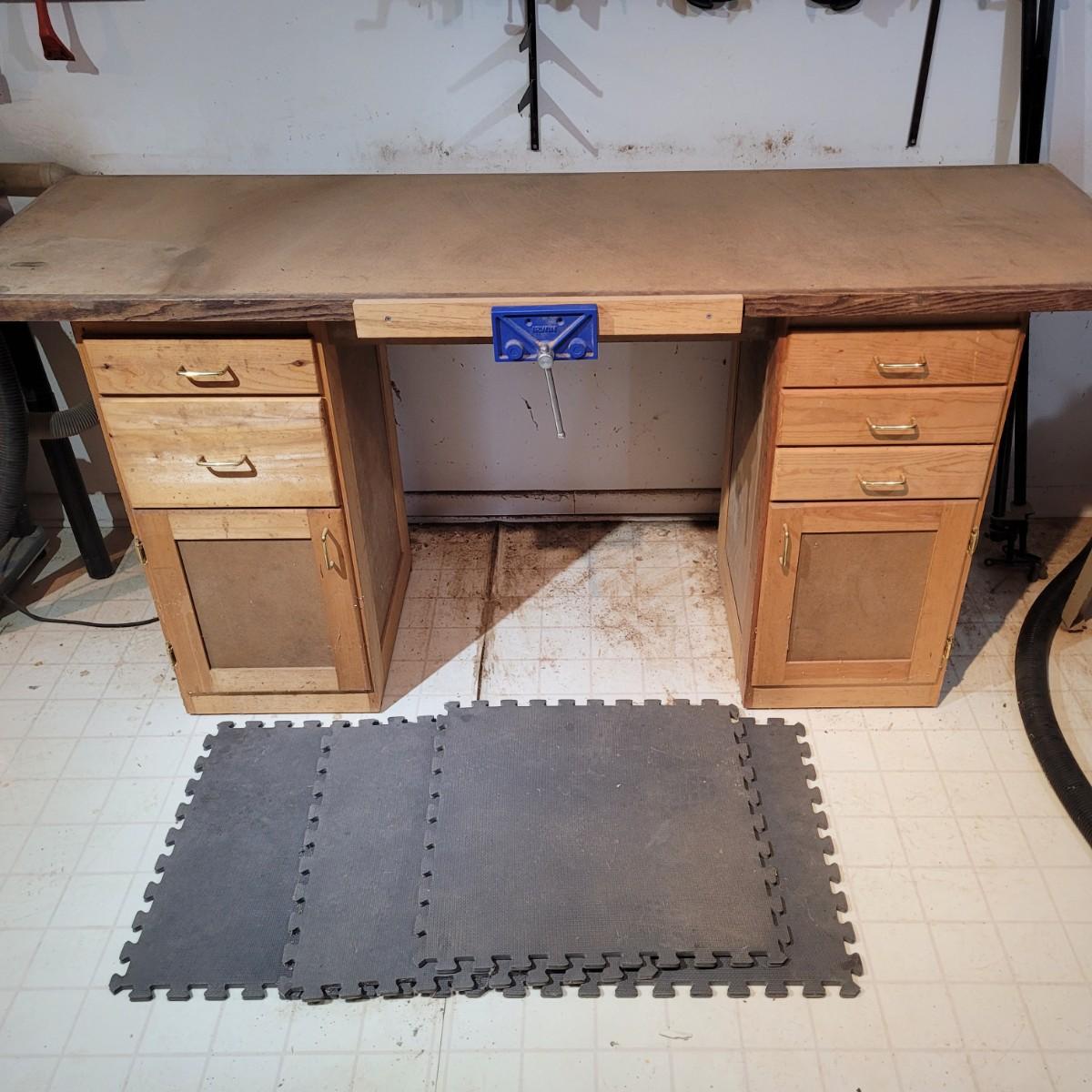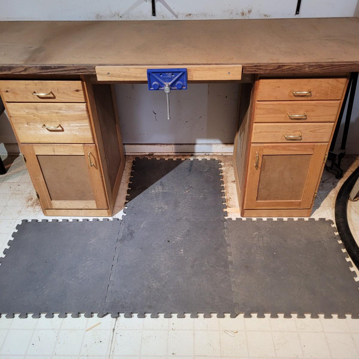 Large wooden workbench featuring five wooden drawers and two cabinets. Includes an attached vice on the front. Included are three interlocking rubber/ foam floor mats. Item measures 79" x 29" x 38"H. Local pickup only. Winning bidder must bring assistance to help move and load this item due to its weight and/or size.