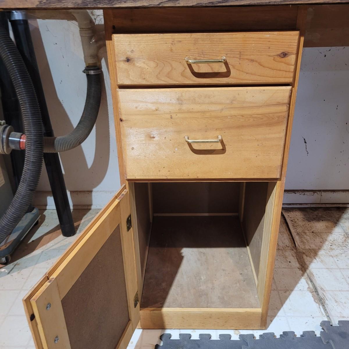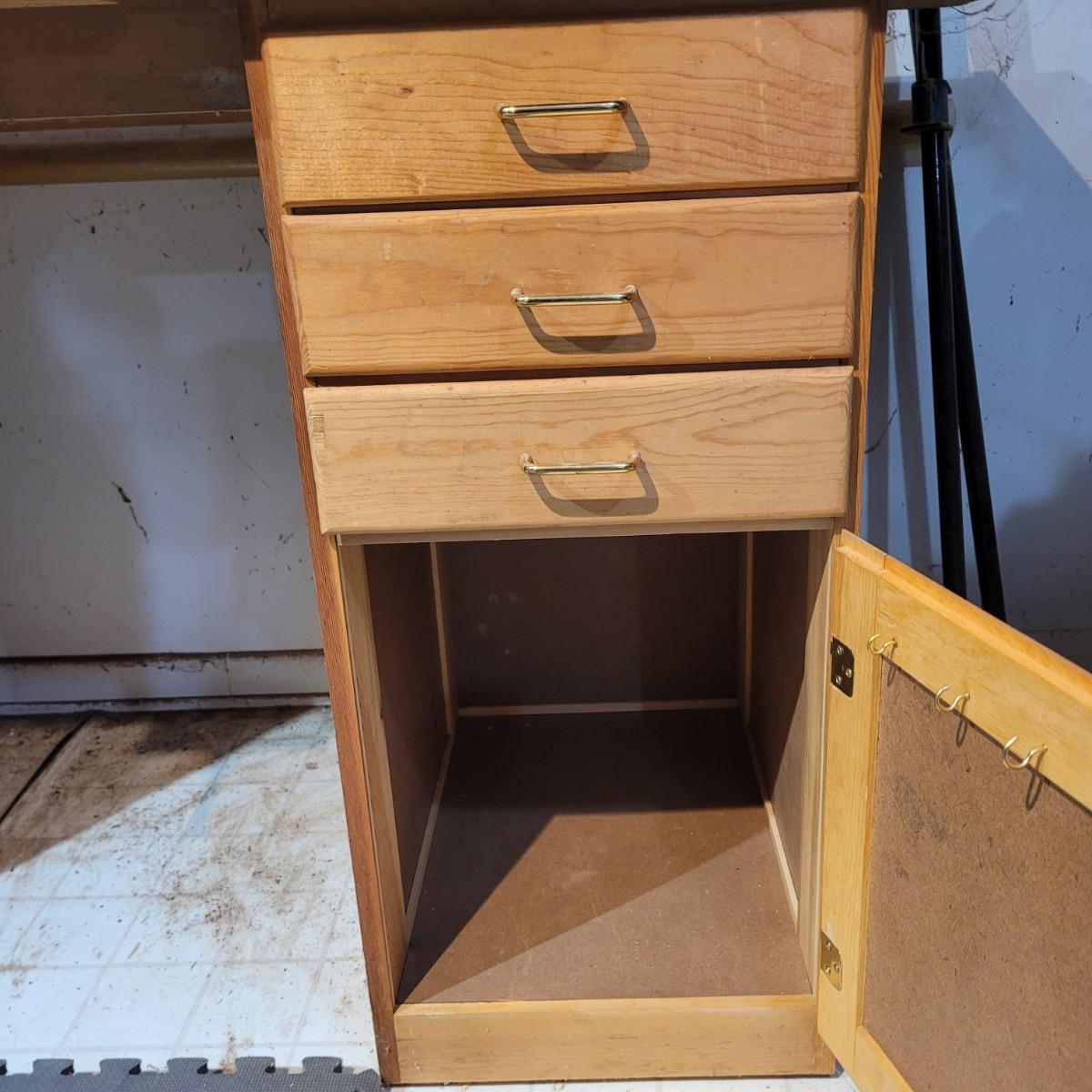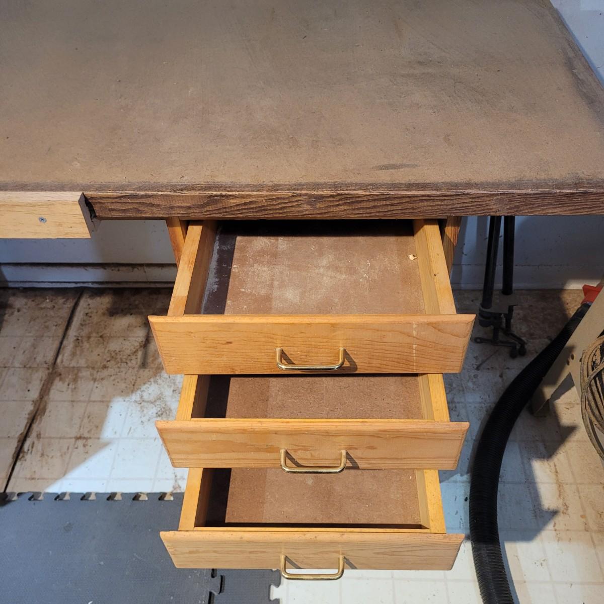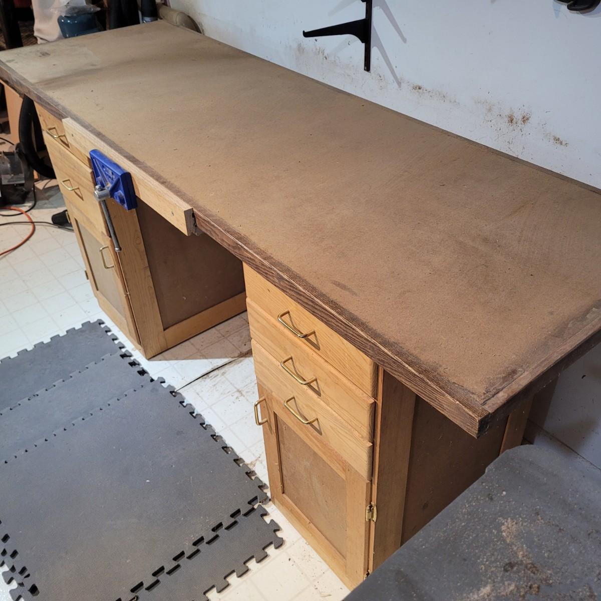 Large wooden workbench featuring five wooden drawers and two cabinets. Includes an attached vice on the front. Included are three interlocking rubber/ foam floor mats. Item measures 79" x 29" x 38"H. Local pickup only. Winning bidder must bring assistance to help move and load this item due to its weight and/or size.