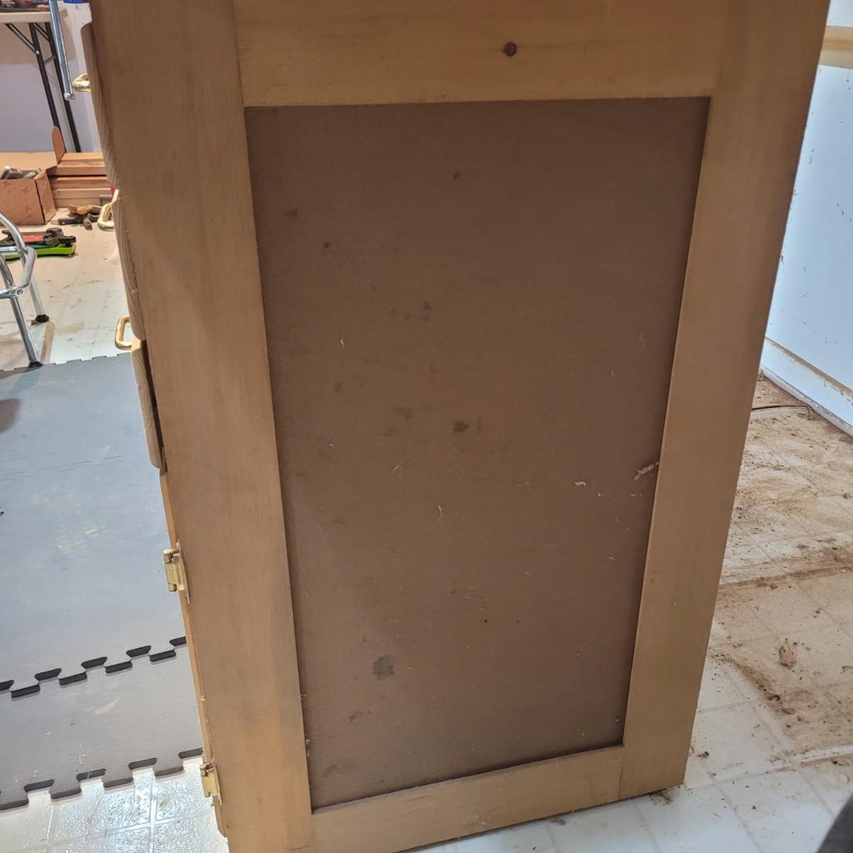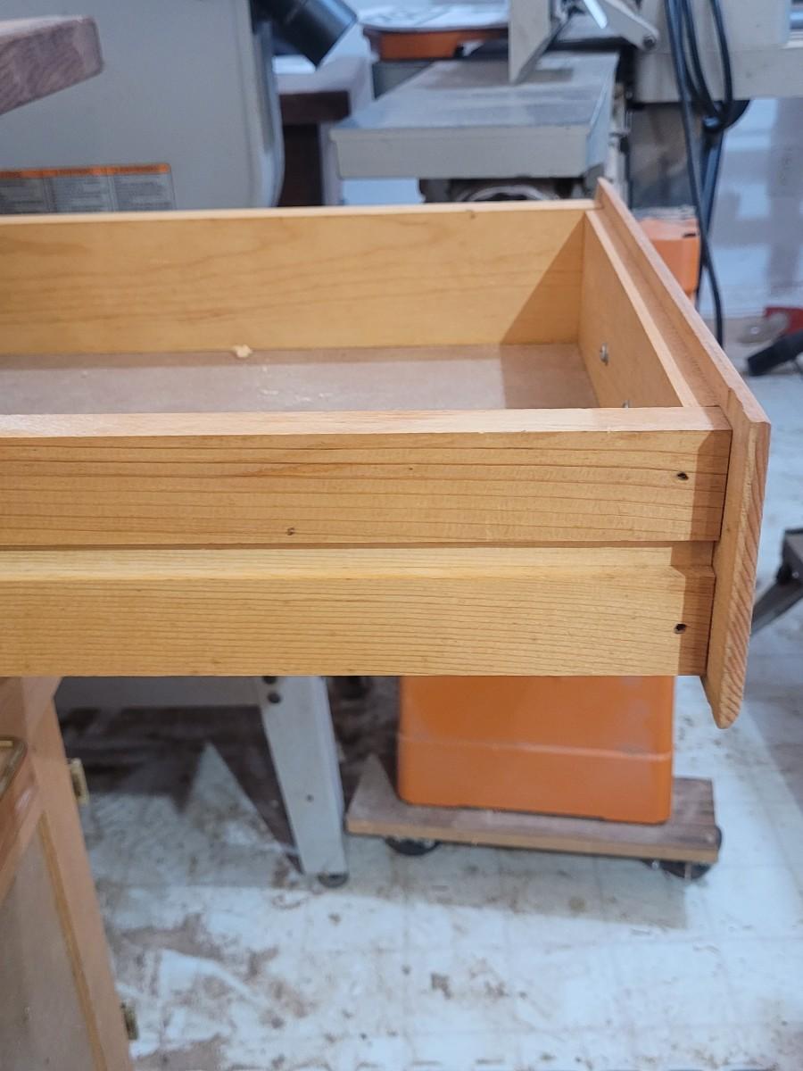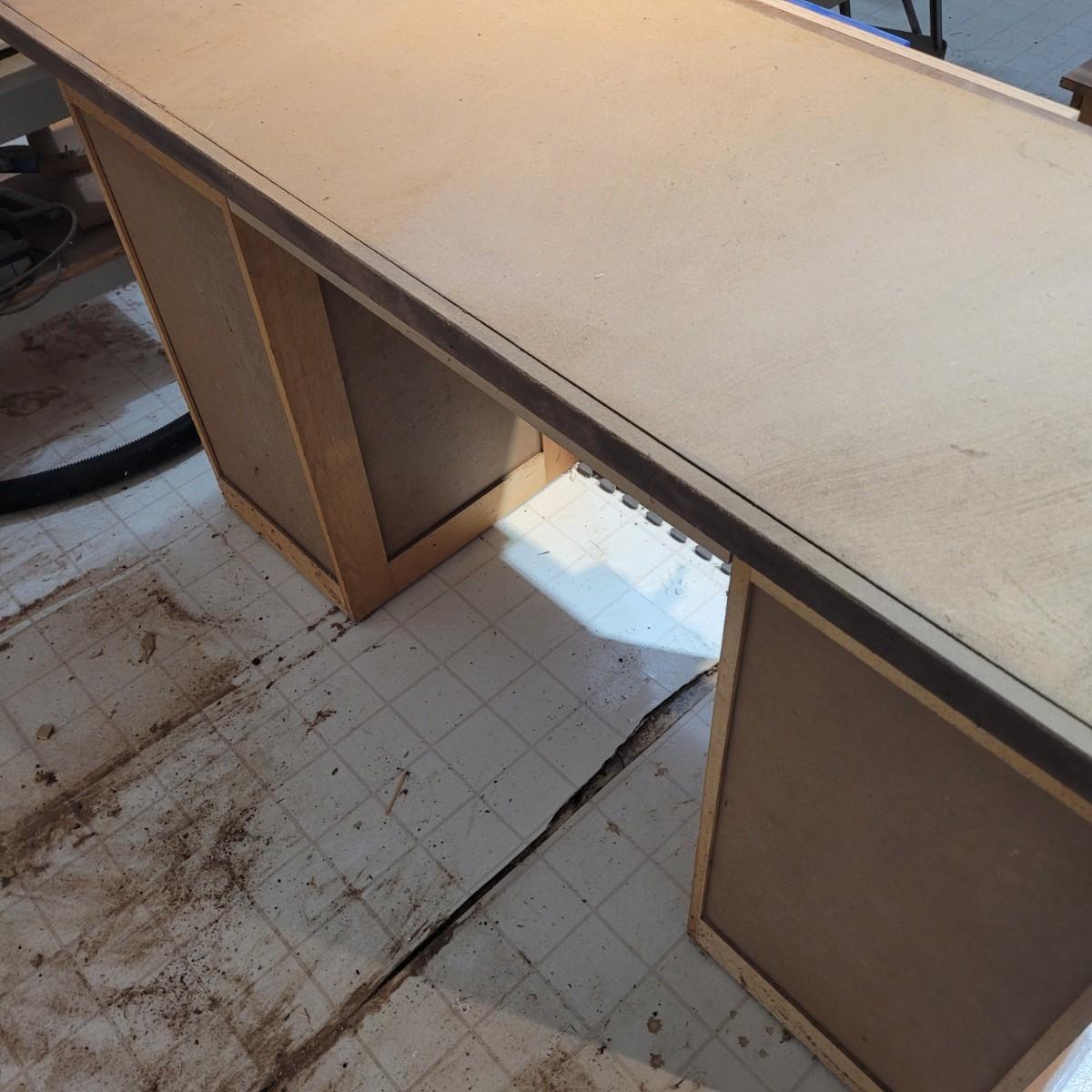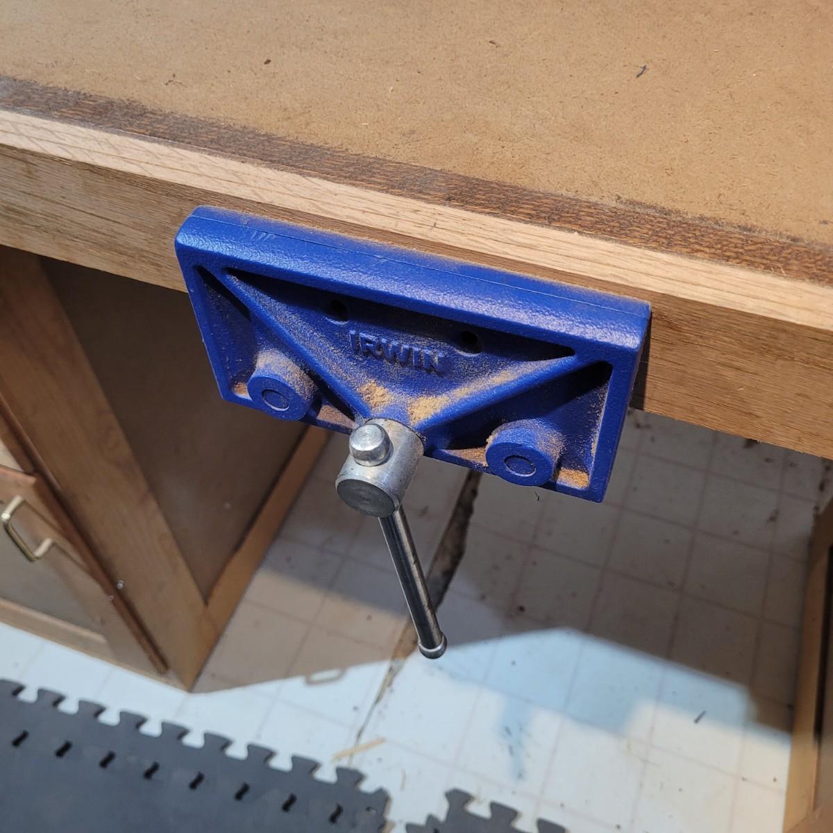 Large wooden workbench featuring five wooden drawers and two cabinets. Includes an attached vice on the front. Included are three interlocking rubber/ foam floor mats. Item measures 79" x 29" x 38"H. Local pickup only. Winning bidder must bring assistance to help move and load this item due to its weight and/or size.