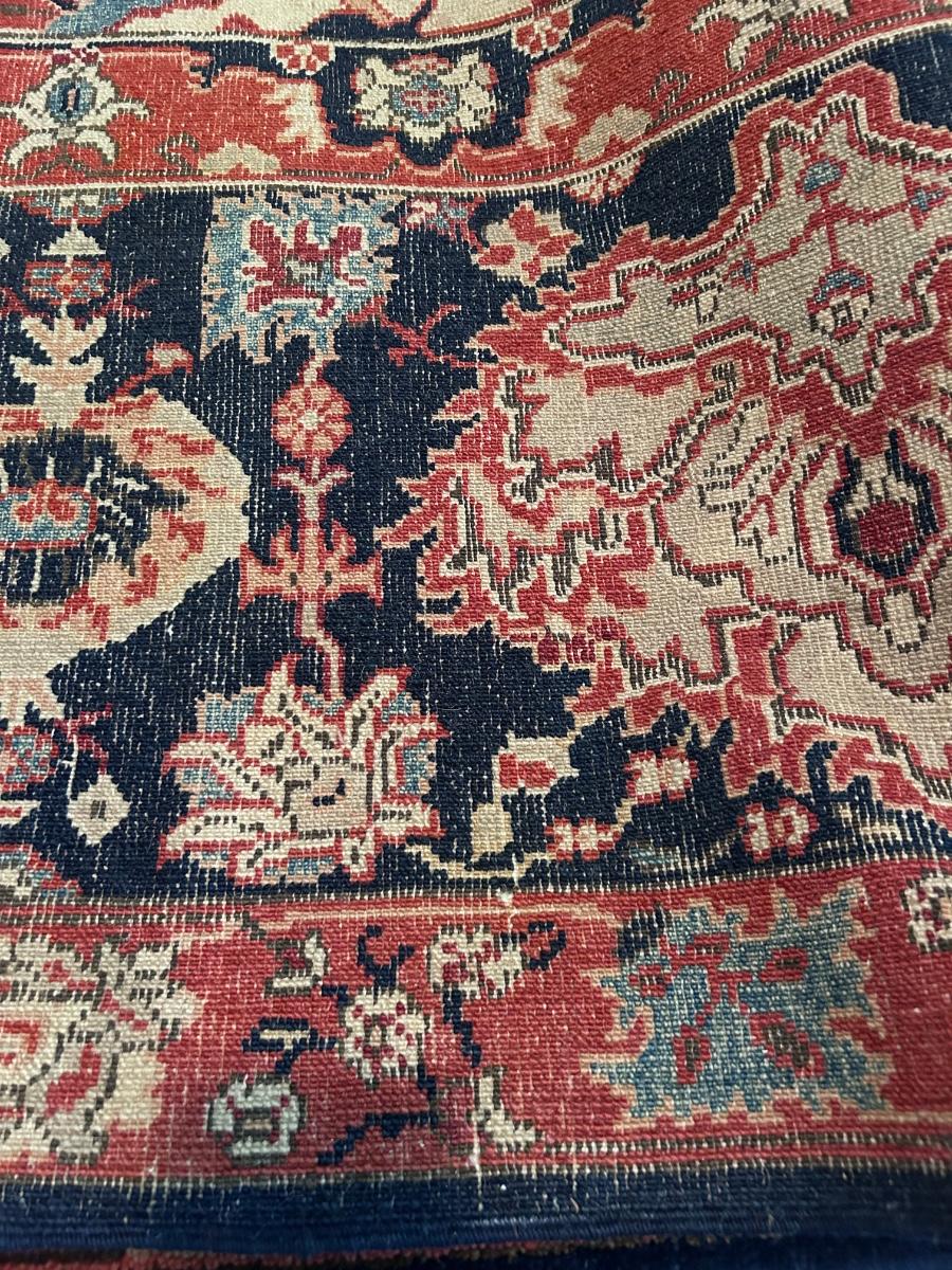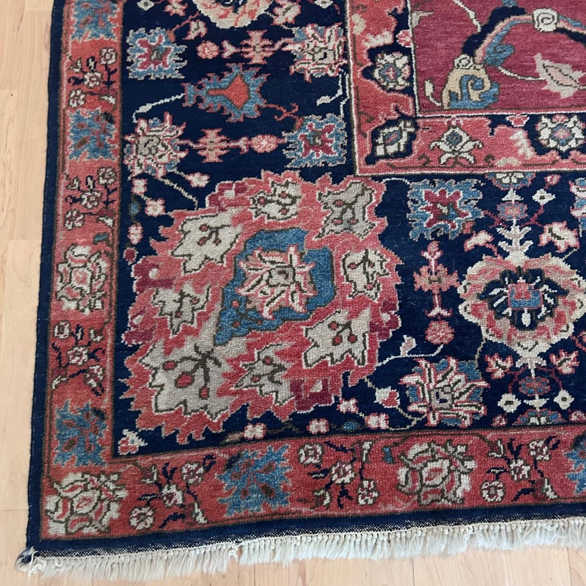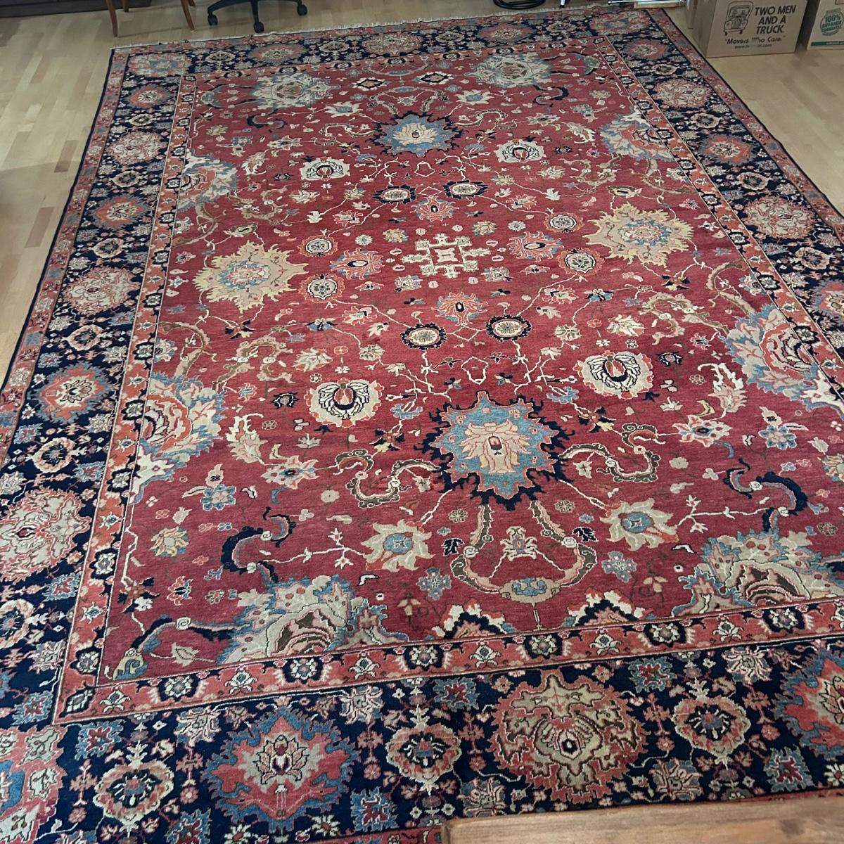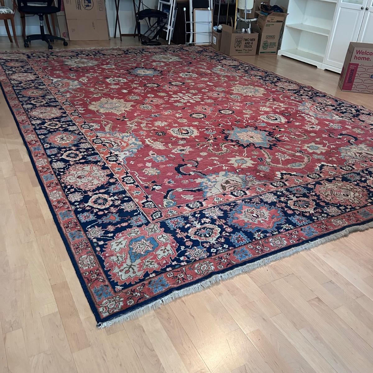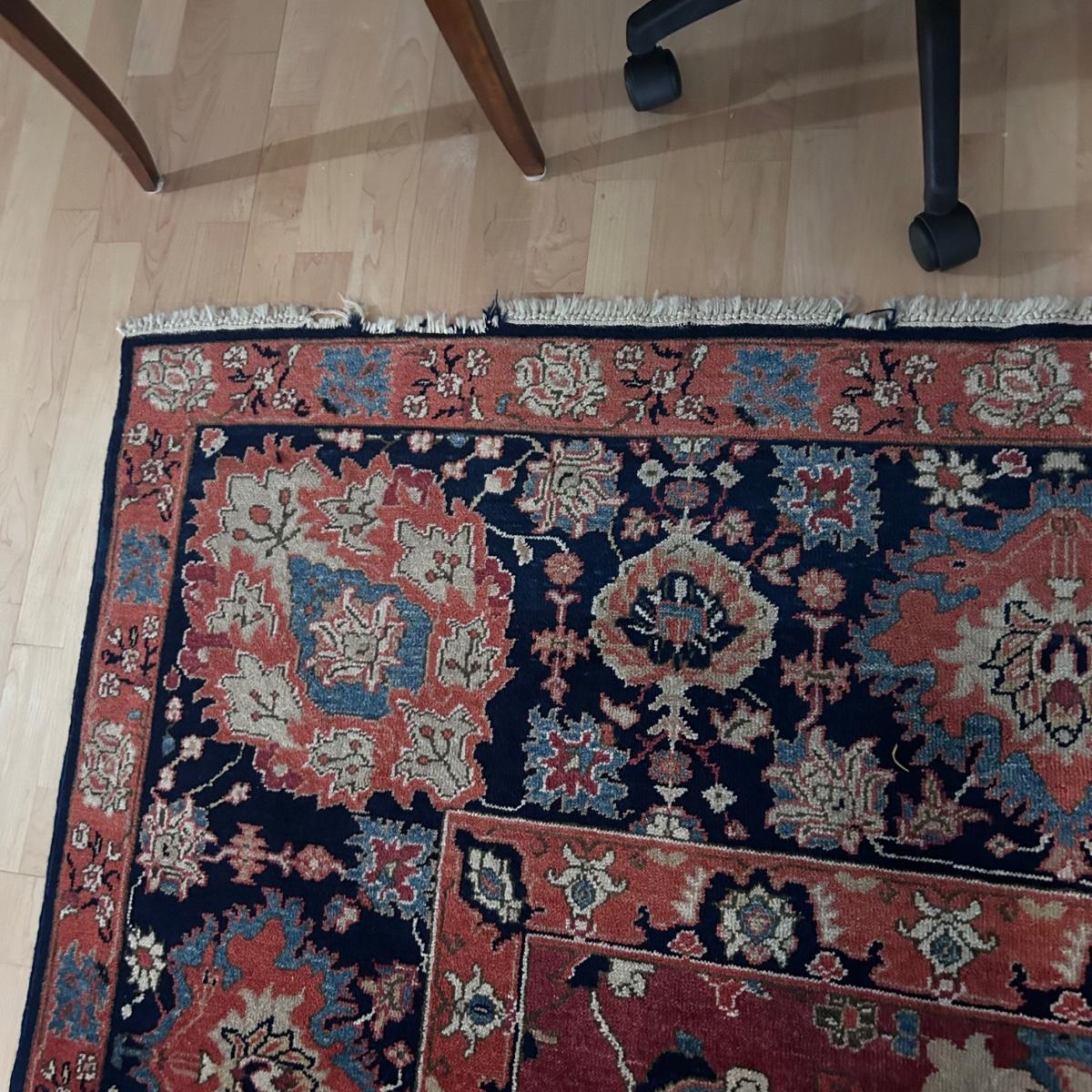 This very large rug with blues, reds, tans, and more colors. It appears to be in good condition with no notable stains but a little fraying on one end of the fringe. See pix. Piece measures 126.6” x 186” (approximately 10.5' x 15.5'). Local pick up only.
