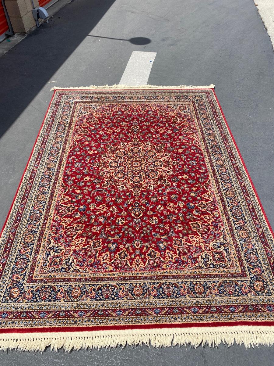 Large Wools of New Zealand Area Rug. Dark red with an ornate detailed pattern. Fringed edge. About 9'x5.5' size. In good condition. May need to be surface cleaned, no major spots or stains.