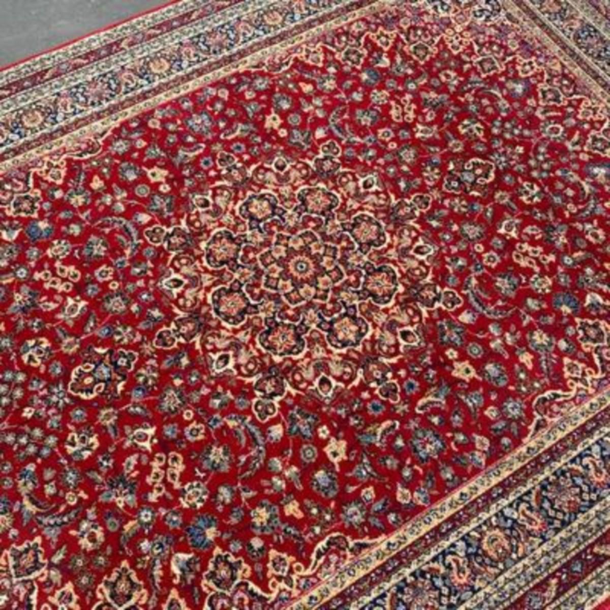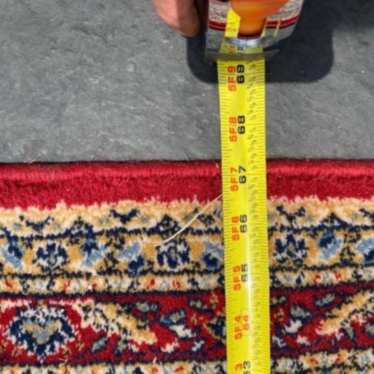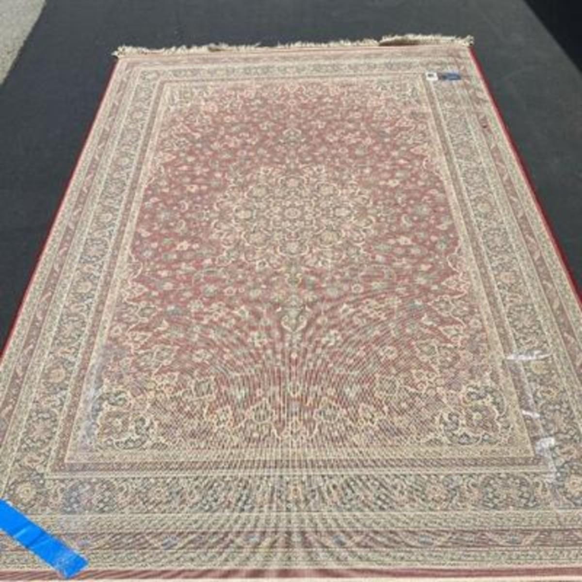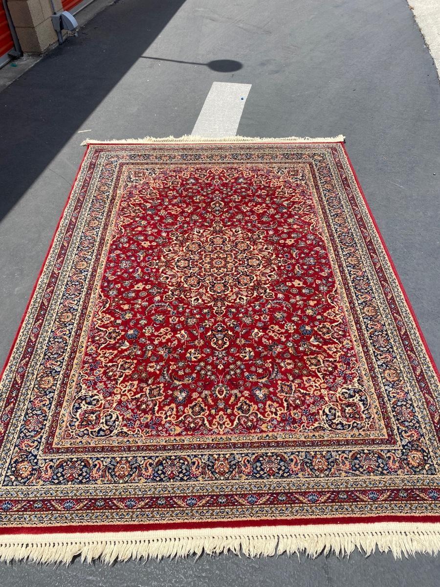 Large Wools of New Zealand Area Rug. Dark red with an ornate detailed pattern. Fringed edge. About 9'x5.5' size. In good condition. May need to be surface cleaned, no major spots or stains. PICK UP AT OUR OFFICE IN BREA.