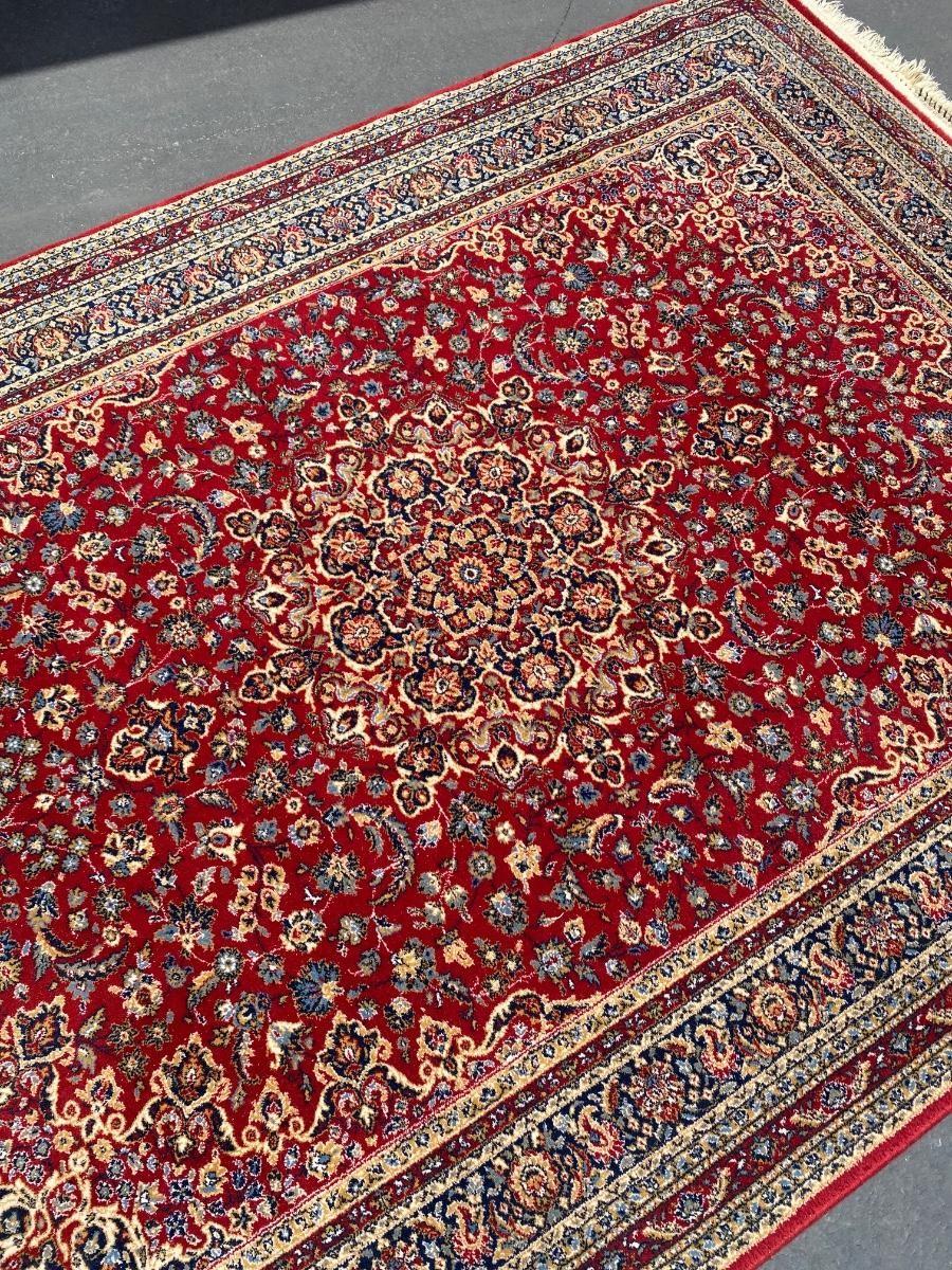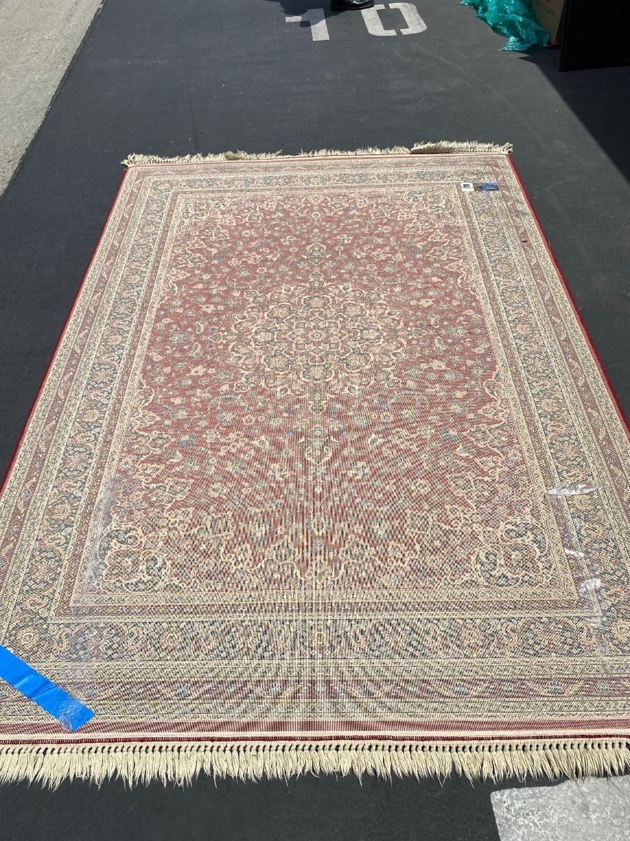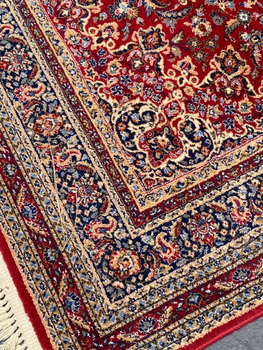Large Wools of New Zealand Area Rug. Dark red with an ornate detailed pattern. Fringed edge. About 9'x5.5' size. In good condition. May need to be surface cleaned, no major spots or stains.