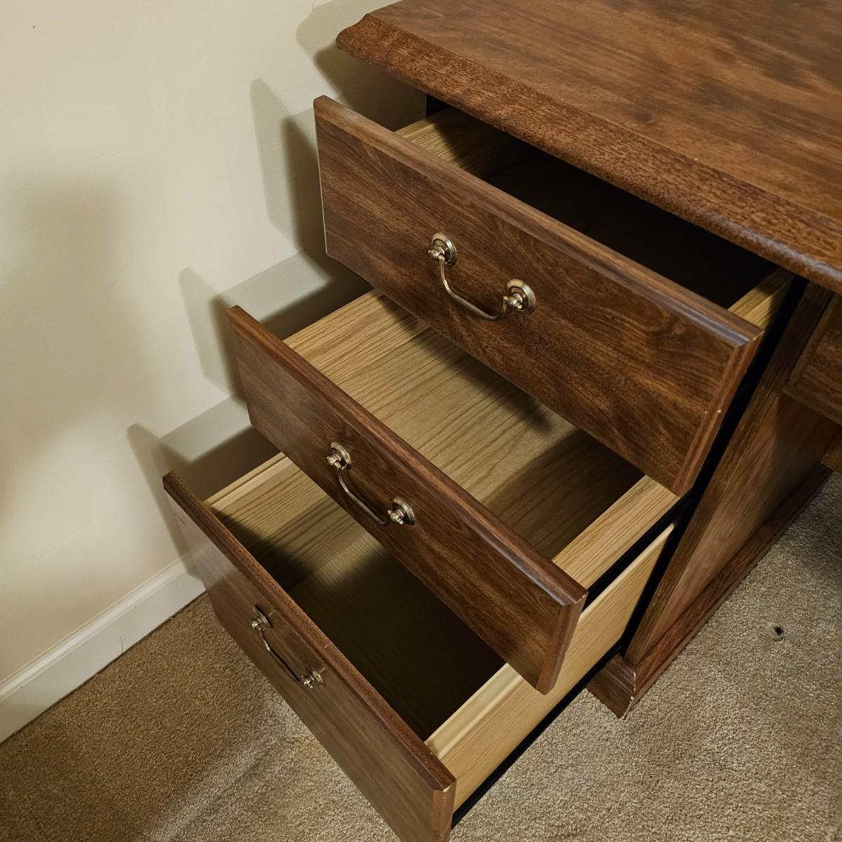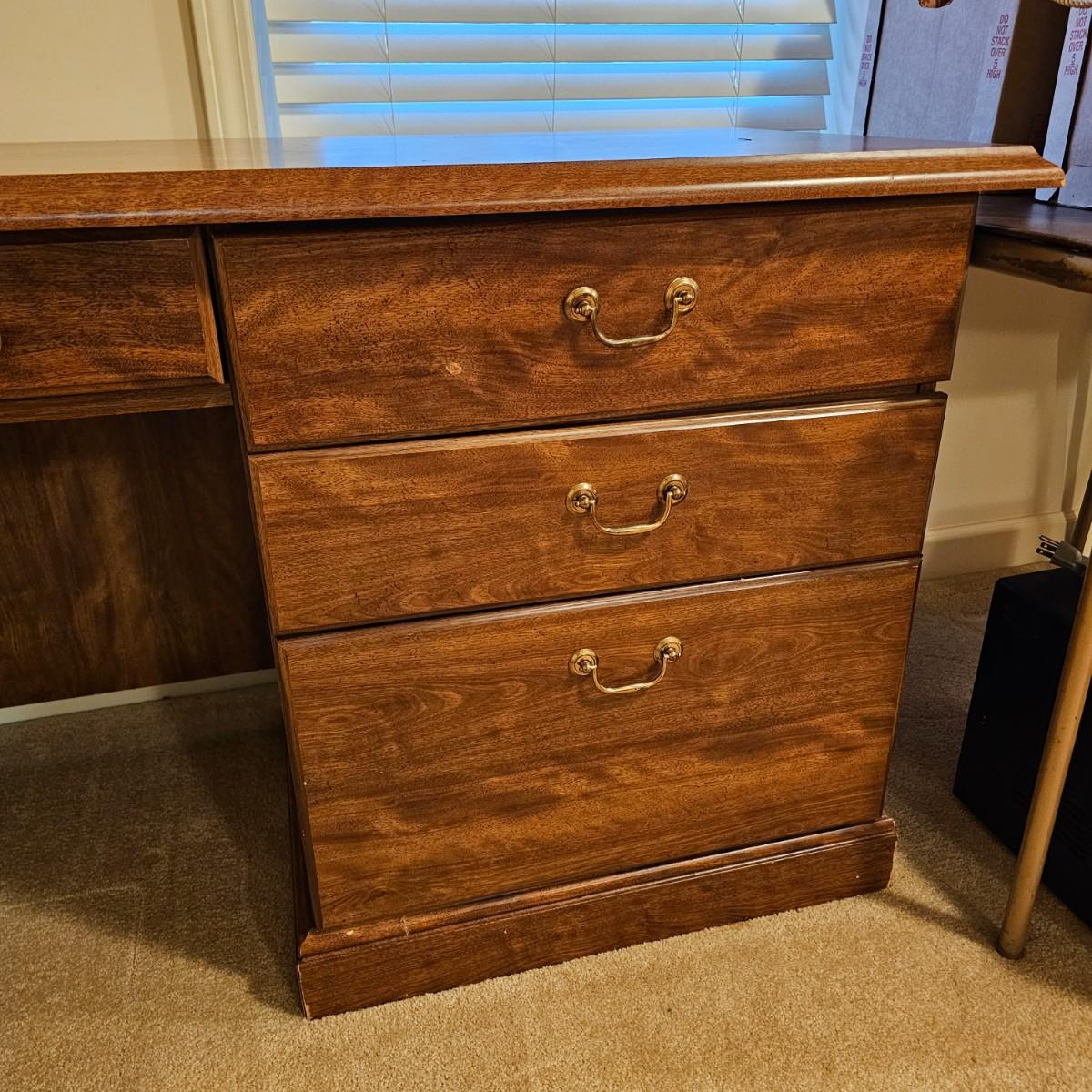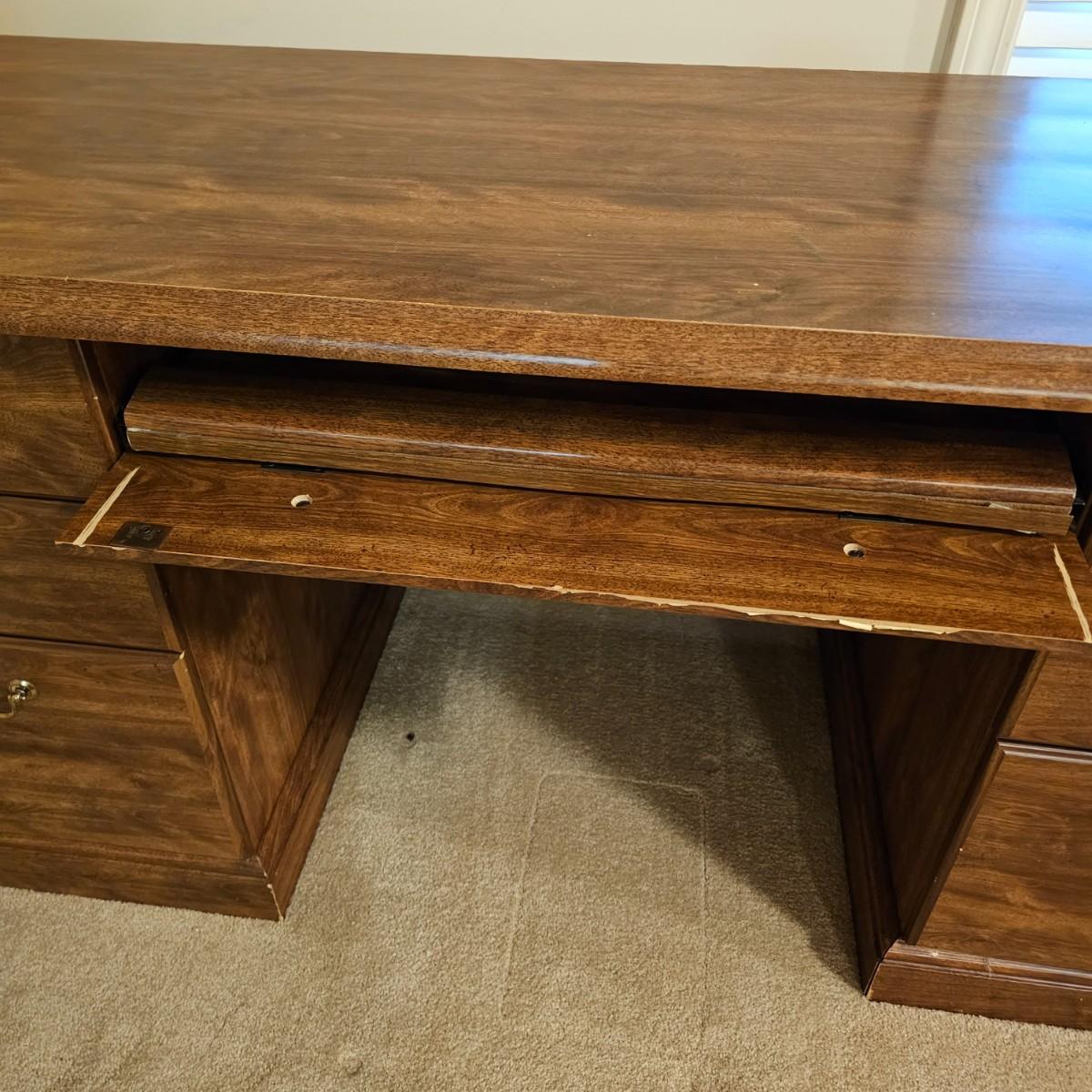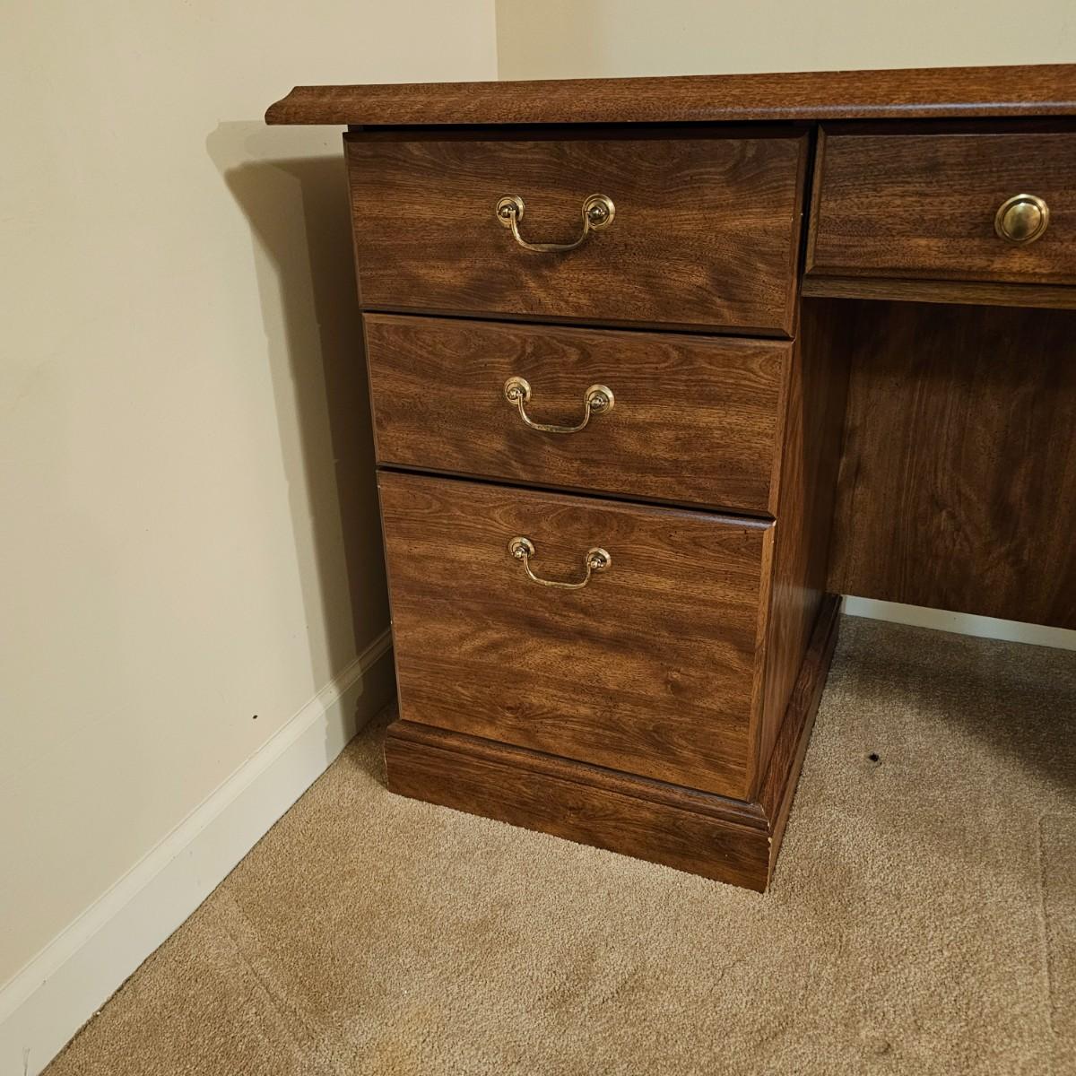 Wide expanse top gives this desk plenty of room to spread projects out. Right side base has three drawers including bottom file drawer. Middle drawer opens for pull-out keyboard tray. Right side opens up all the way, has two adjustable shelves andca pullout rack for cd's or software. This door sticks a bit. Desk measures 65" x 21.5" x 29"H. See photos for details. Local pickup only. Winning bidder must bring assistance to help move and load this item due to its weight and/or size. Item is located in basement with access out through garage.
