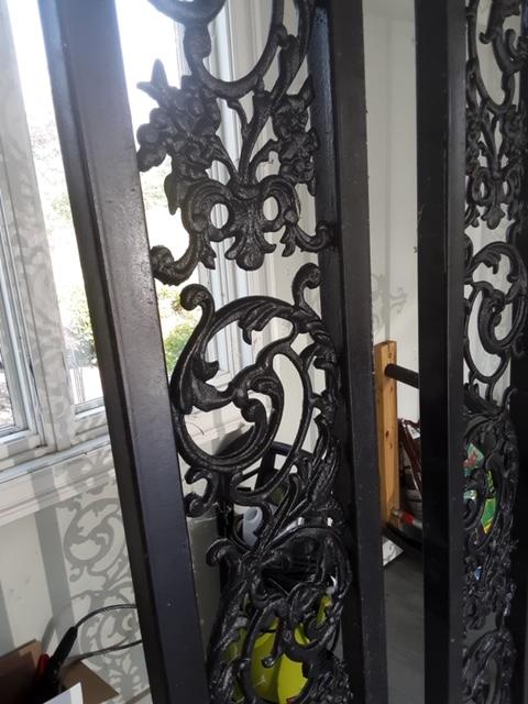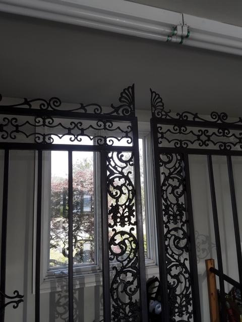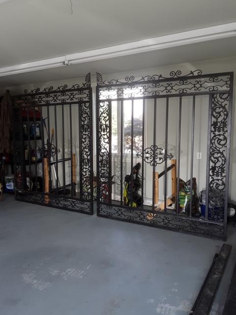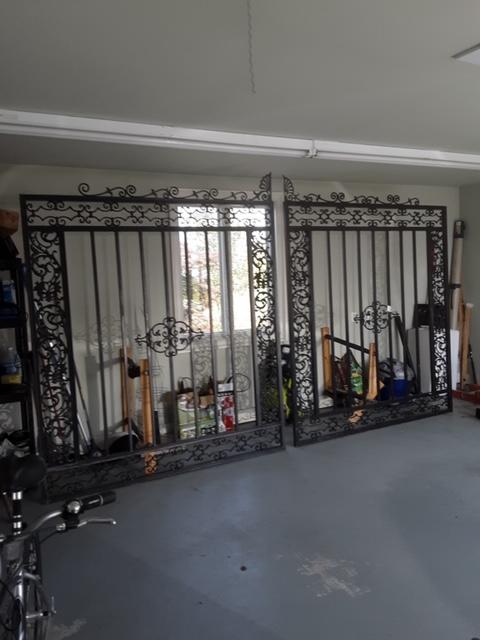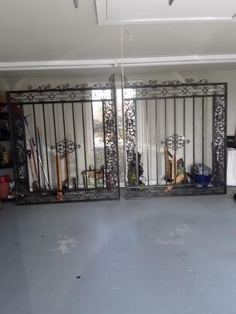 Large Wrought Iron Entrance Gates, each measuring 7ft wide, 14ft total. top bar is 7.5' high decor on top adds 9 inches. There are two wrought iron posts made to go with them. They are 4" square and 7'5" high. These gates are new and were never installed.