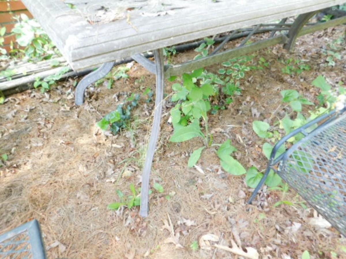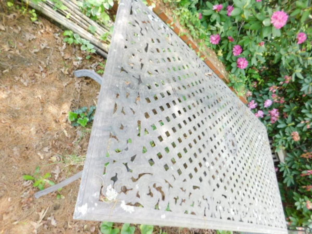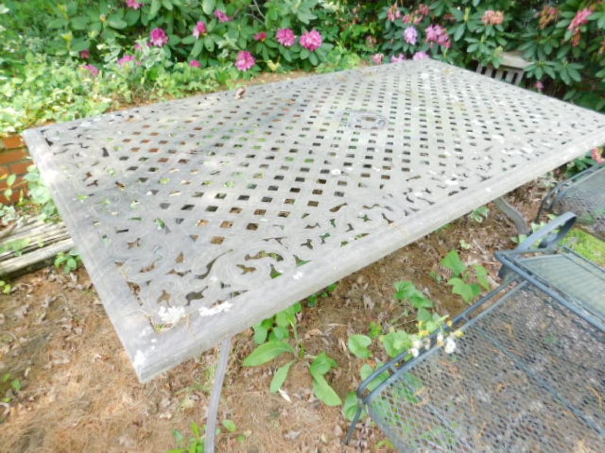 Large Wrought Metal Garden or Patio Table Will need to bring help removing from yard. Expect weathering and color fade.