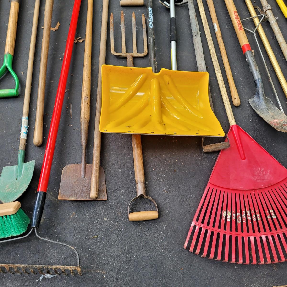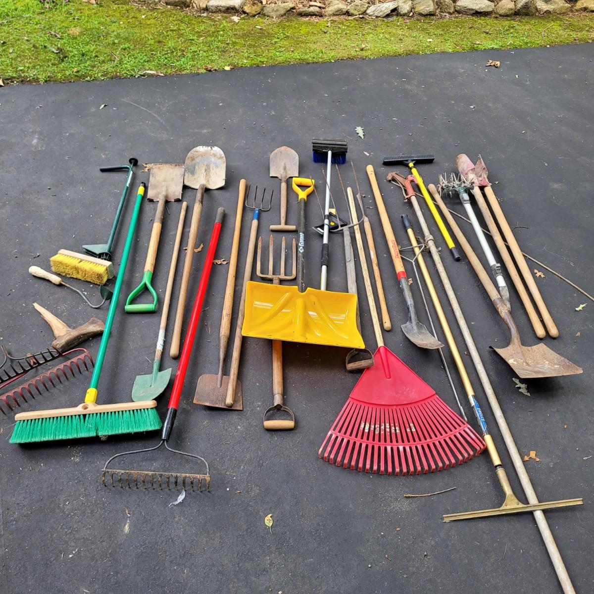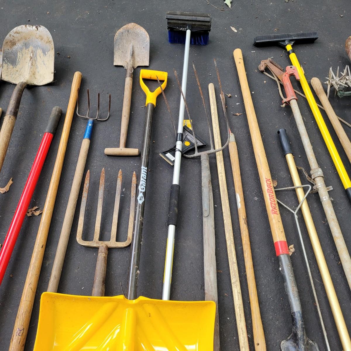 This lot includes a large variety of hand powered yard tools. Items include rakes, shovels, tillers, pitchforks, hoes, brooms, post hole diggers, scrapers, and squeegee. Brands include Razorback, Garant, and Ettore. The axe handle needs to be replaced.