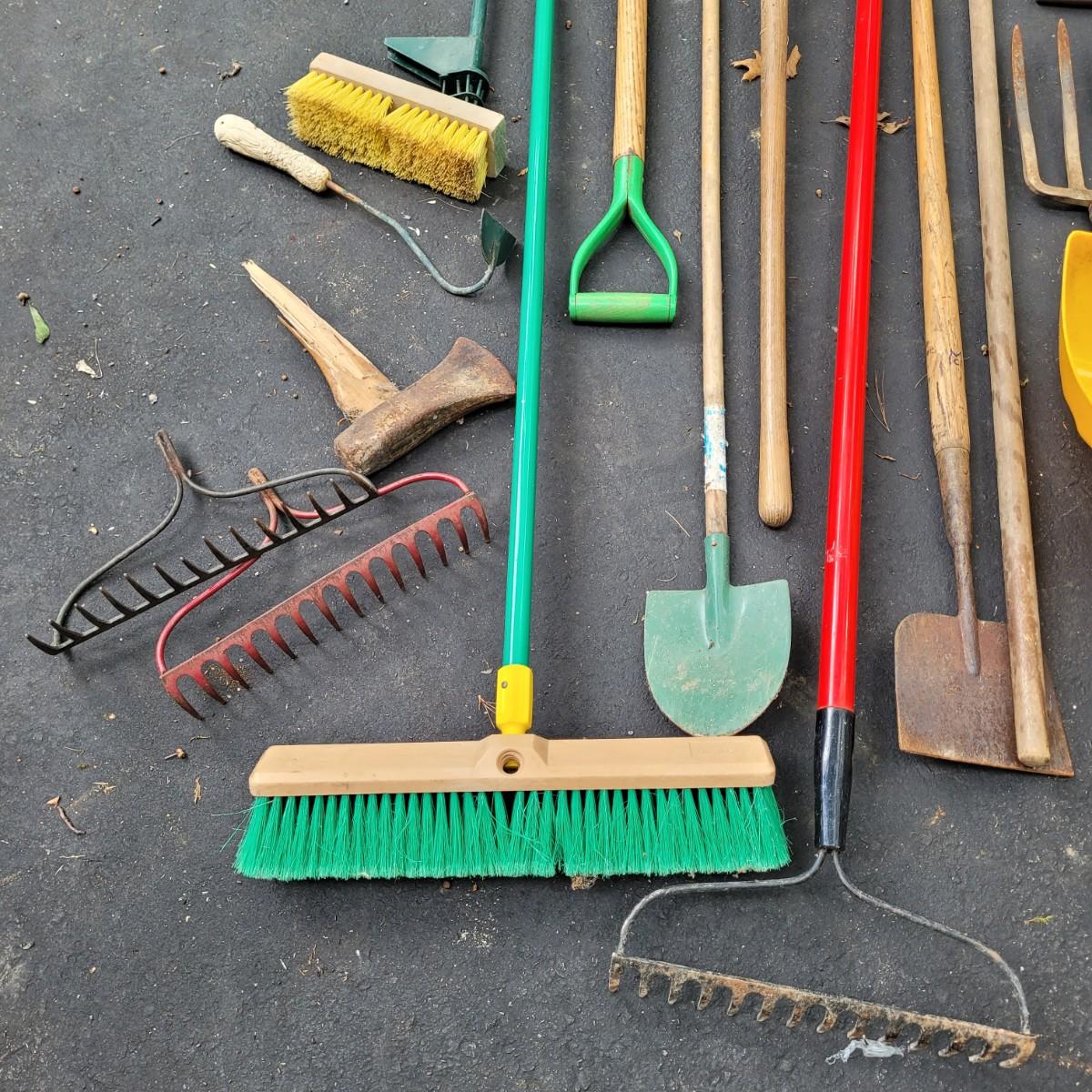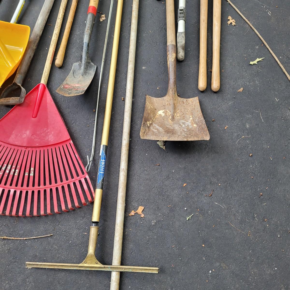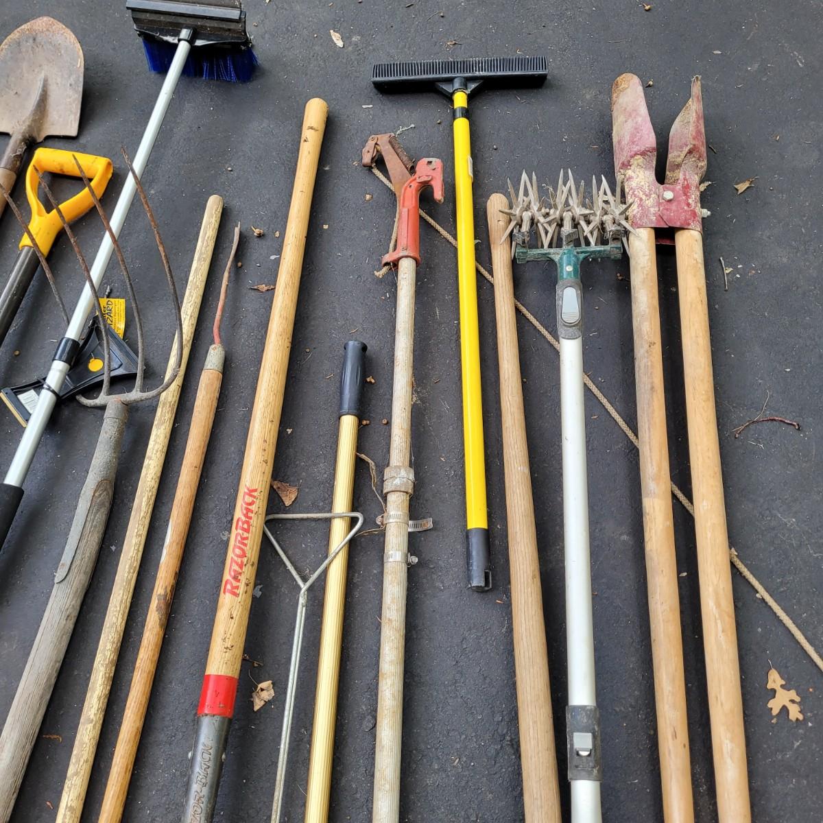 This lot includes a large variety of hand powered yard tools. Items include rakes, shovels, tillers, pitchforks, hoes, brooms, post hole diggers, scrapers, and squeegee. Brands include Razorback, Garant, and Ettore. The axe handle needs to be replaced.