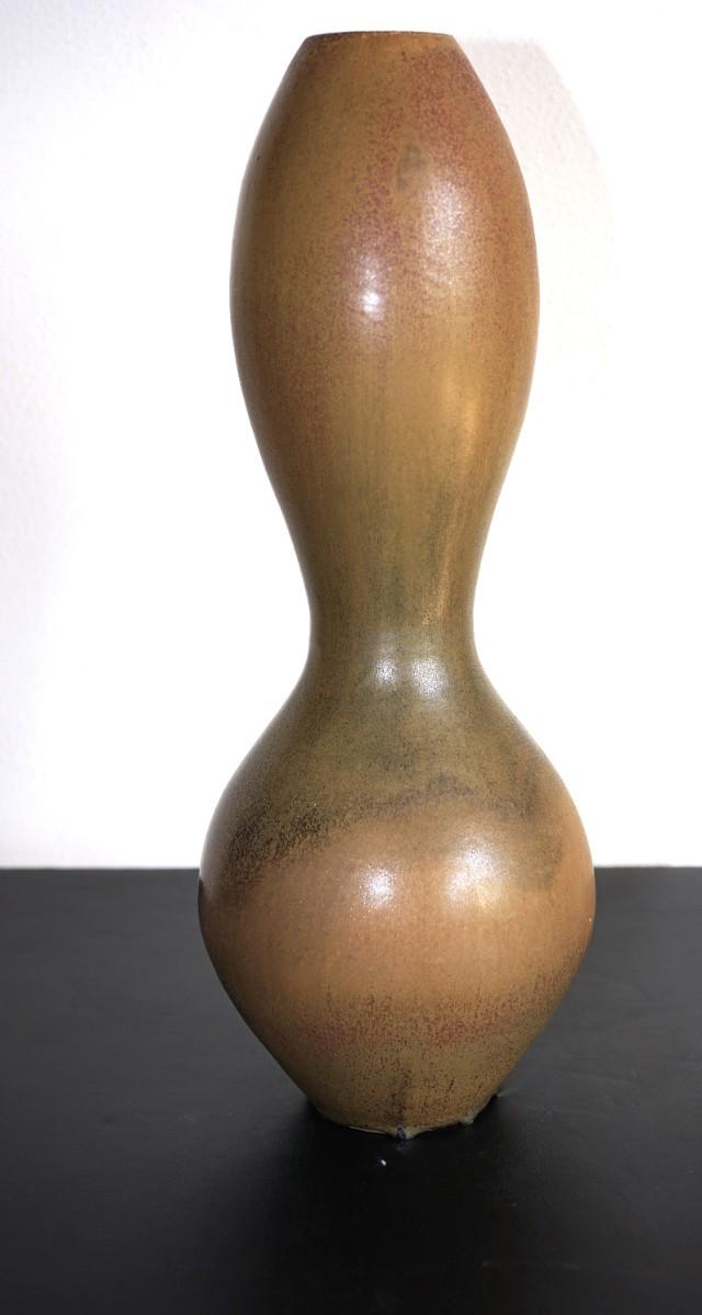LARGER TALL POTTERY VASE GOURD SHAPE W/MATT GLAZE OF BROWNS /DARK GREEN