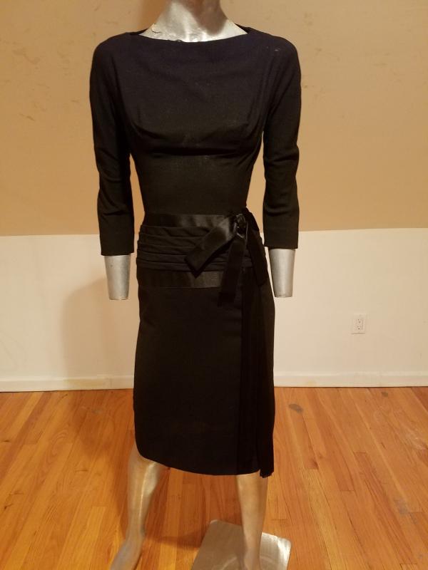Amazing dress by famous Couturier Larry Aldrich. Stunning classic look with satin ribbon embellishment with bow and plats at sash waist extending towards the back in a waterfall drop that is exquisite. Beautiful all around.