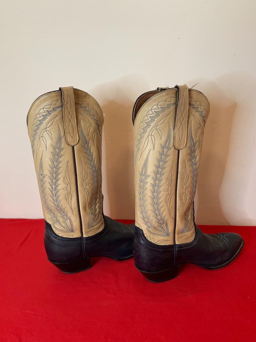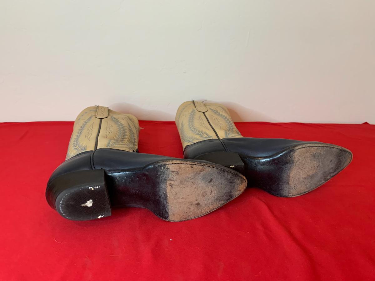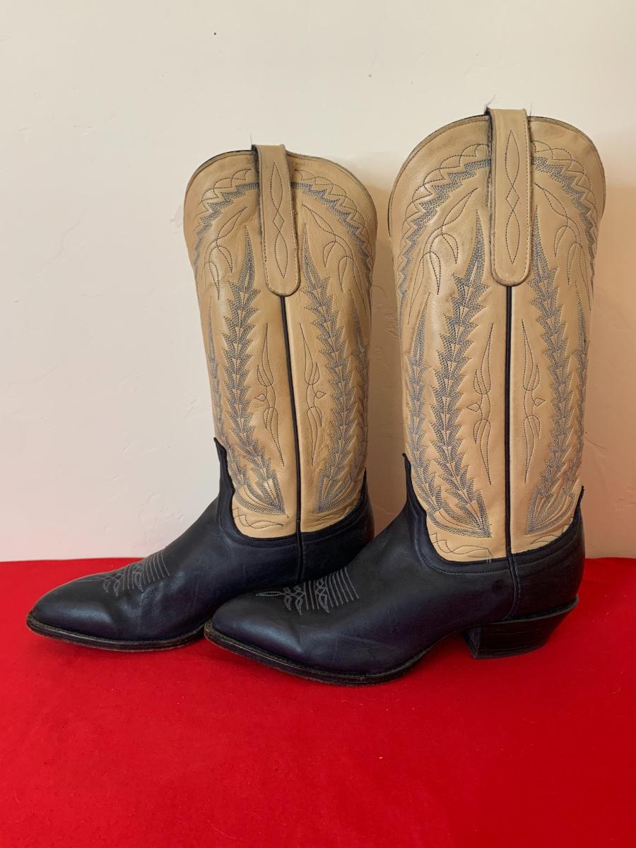 Pair of very nice women’s Larry Mahan El Paso, leather books, Black bottom with cream colored embroidered uppers. Size 8M. Made in the USA.