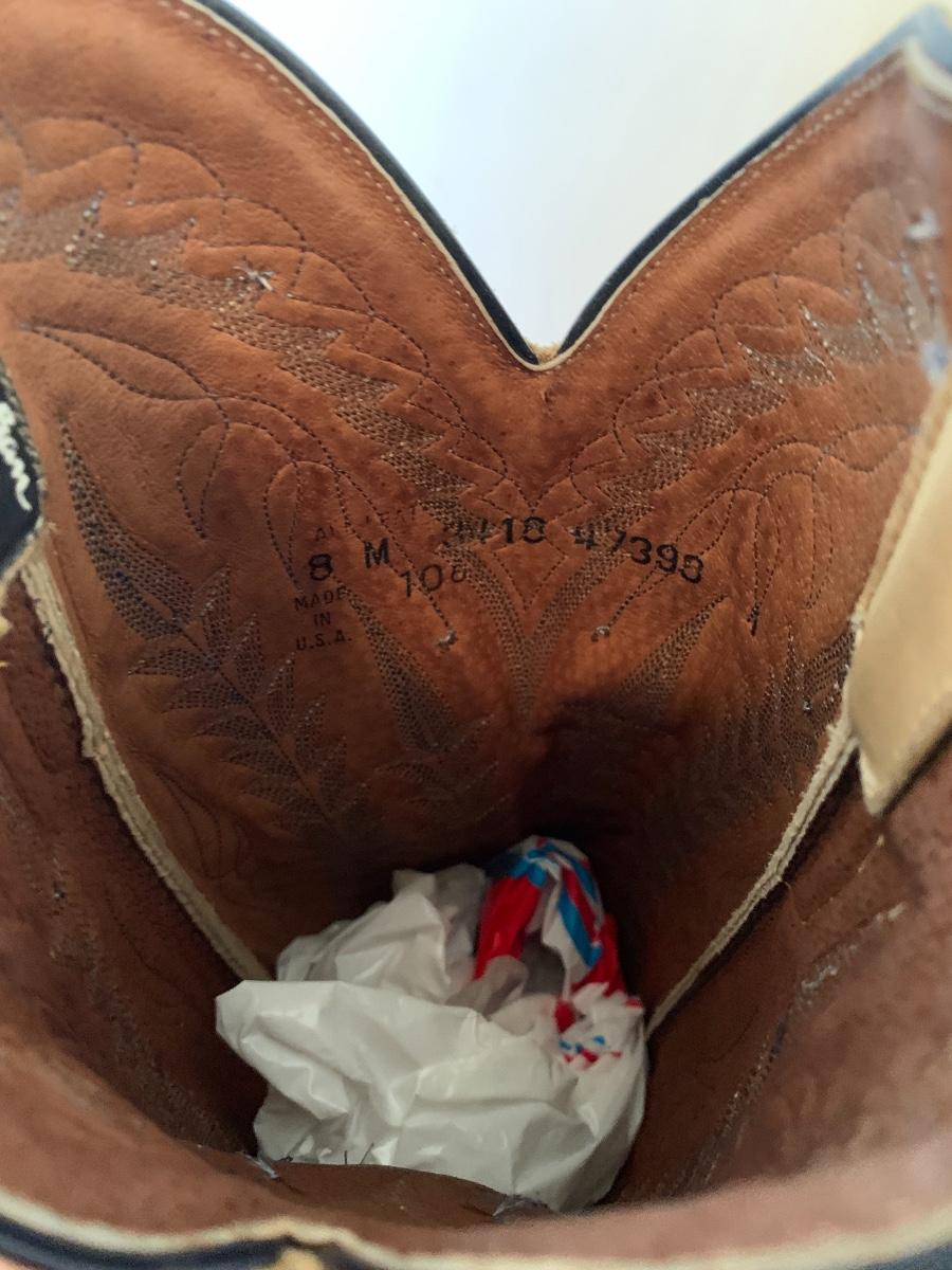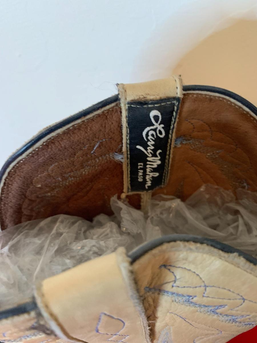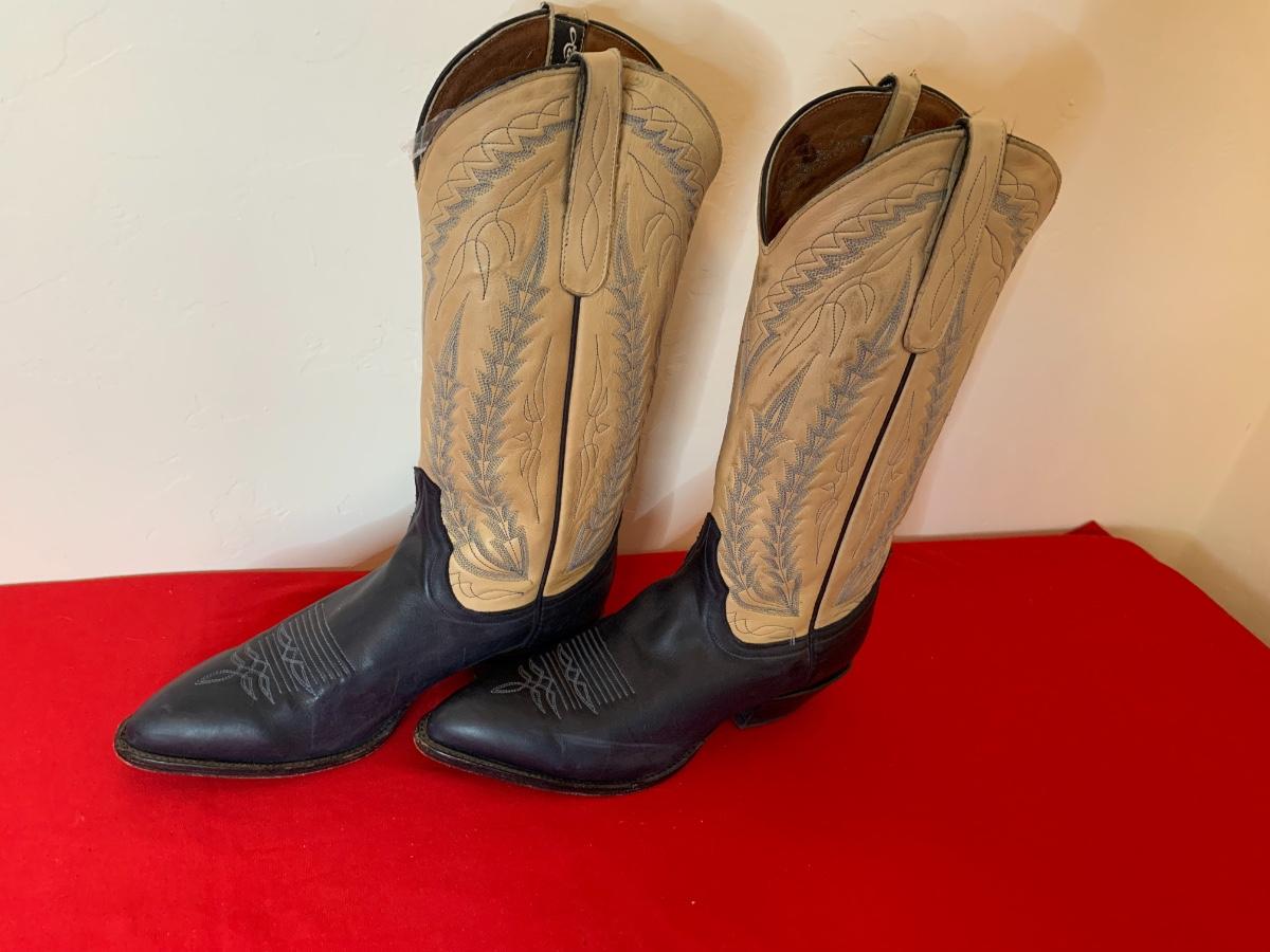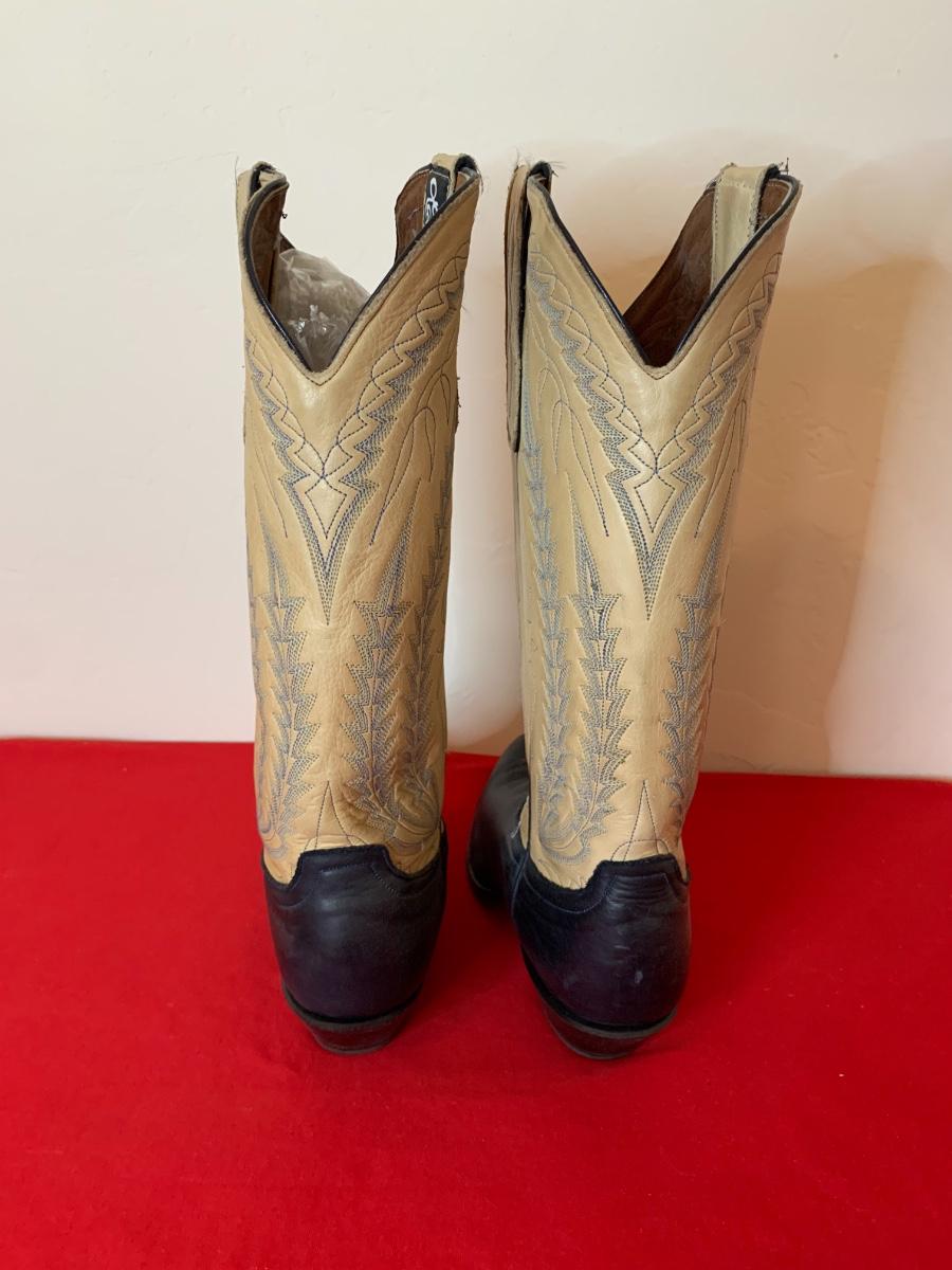 Pair of very nice women’s Larry Mahan El Paso, leather books, Black bottom with cream colored embroidered uppers. Size 8M. Made in the USA.