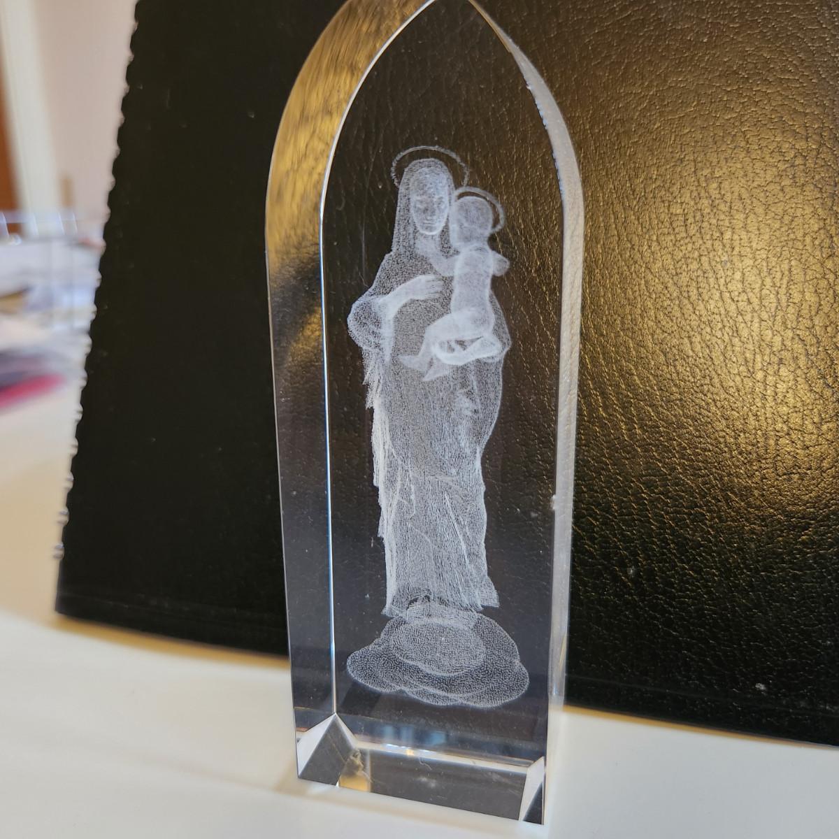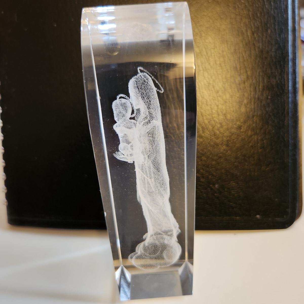 This auction lot is for a beautiful Laser Etched Madonna & Child in Glass. This item is heavy for its size and appears to be in good condition. Wonderful addition to any home looking to house religious icons.