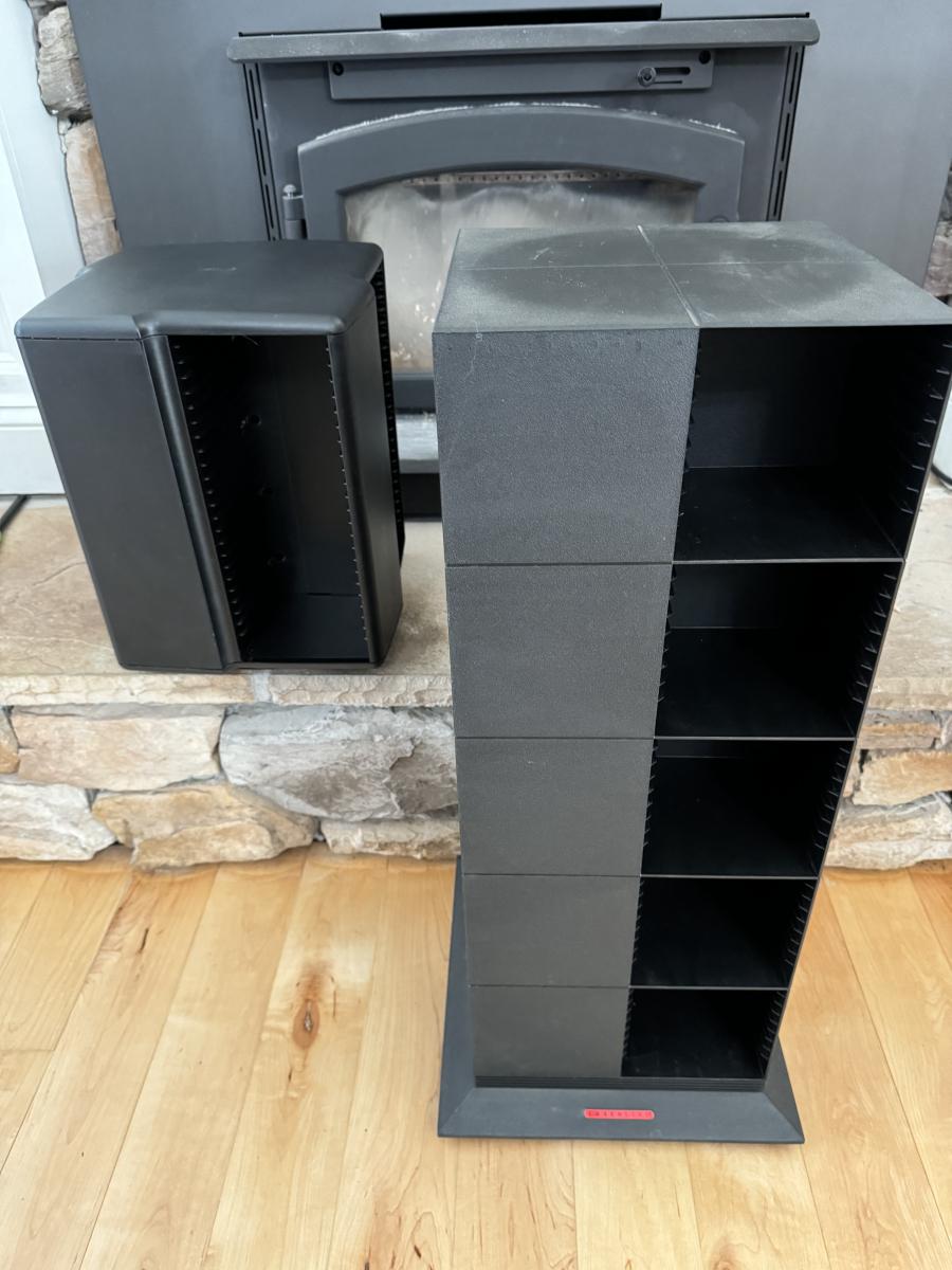 Buying as is, as found in this wonderful estate. See MANY PHOTOS for content, condition and dimensions. Never a Buyers Premiums or Credit Card Fee. All lots start at just $10 and sell with No Reserve to the highest bidder. Two pieces, both rotate and have four sides to hold CDs.