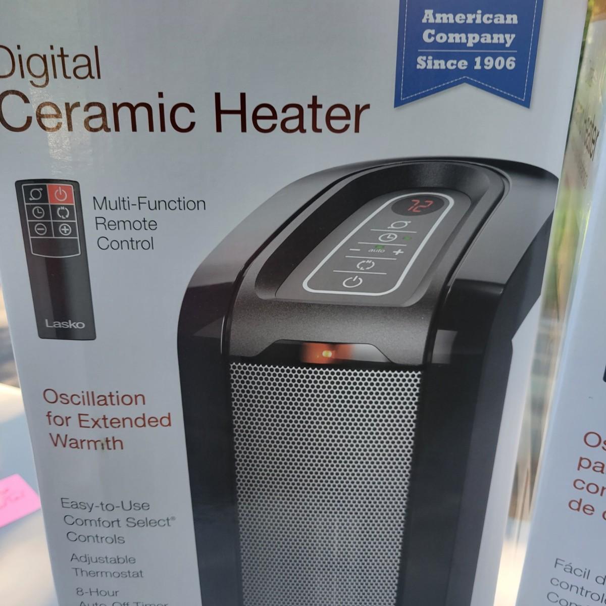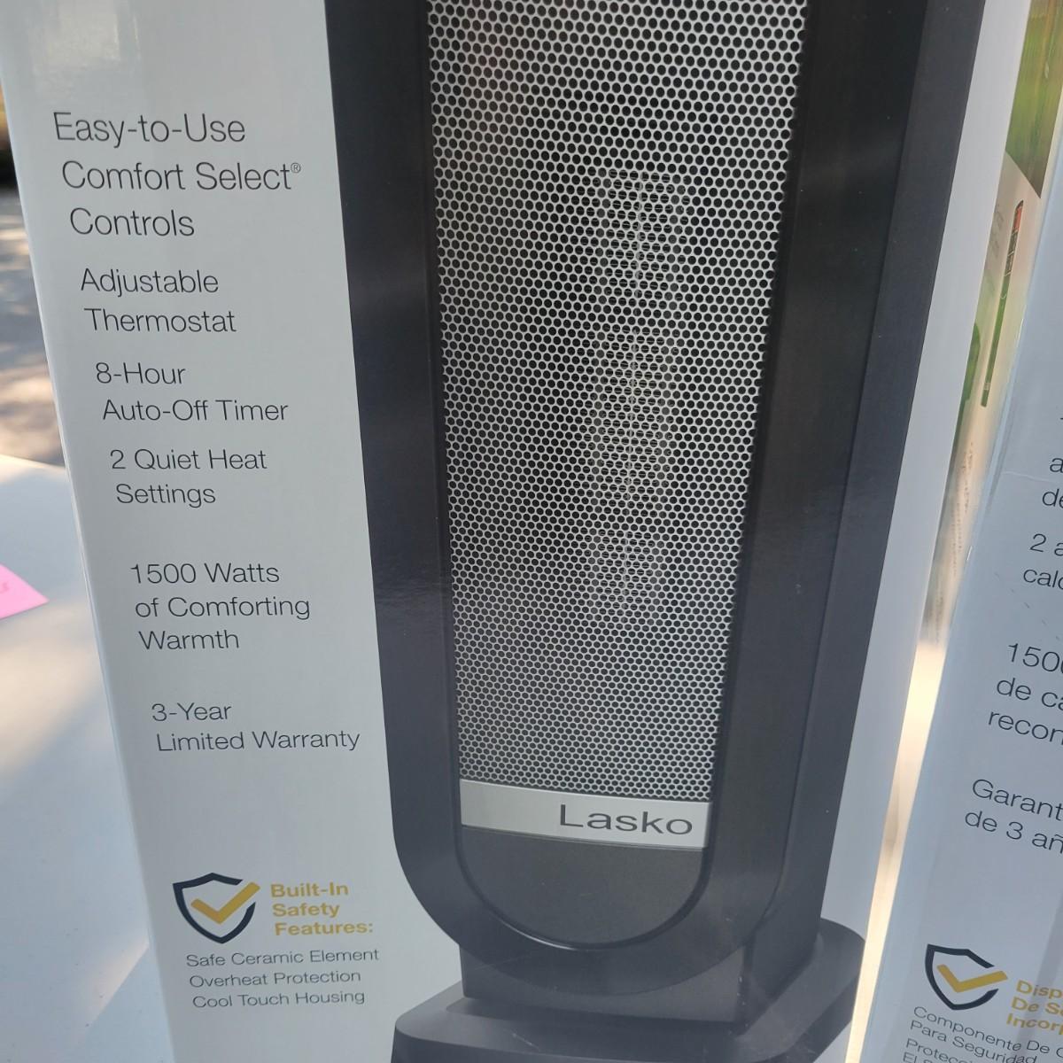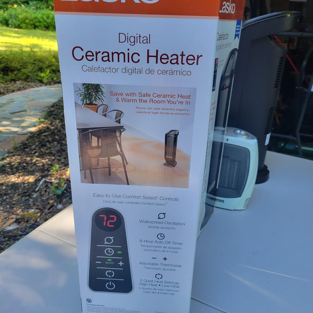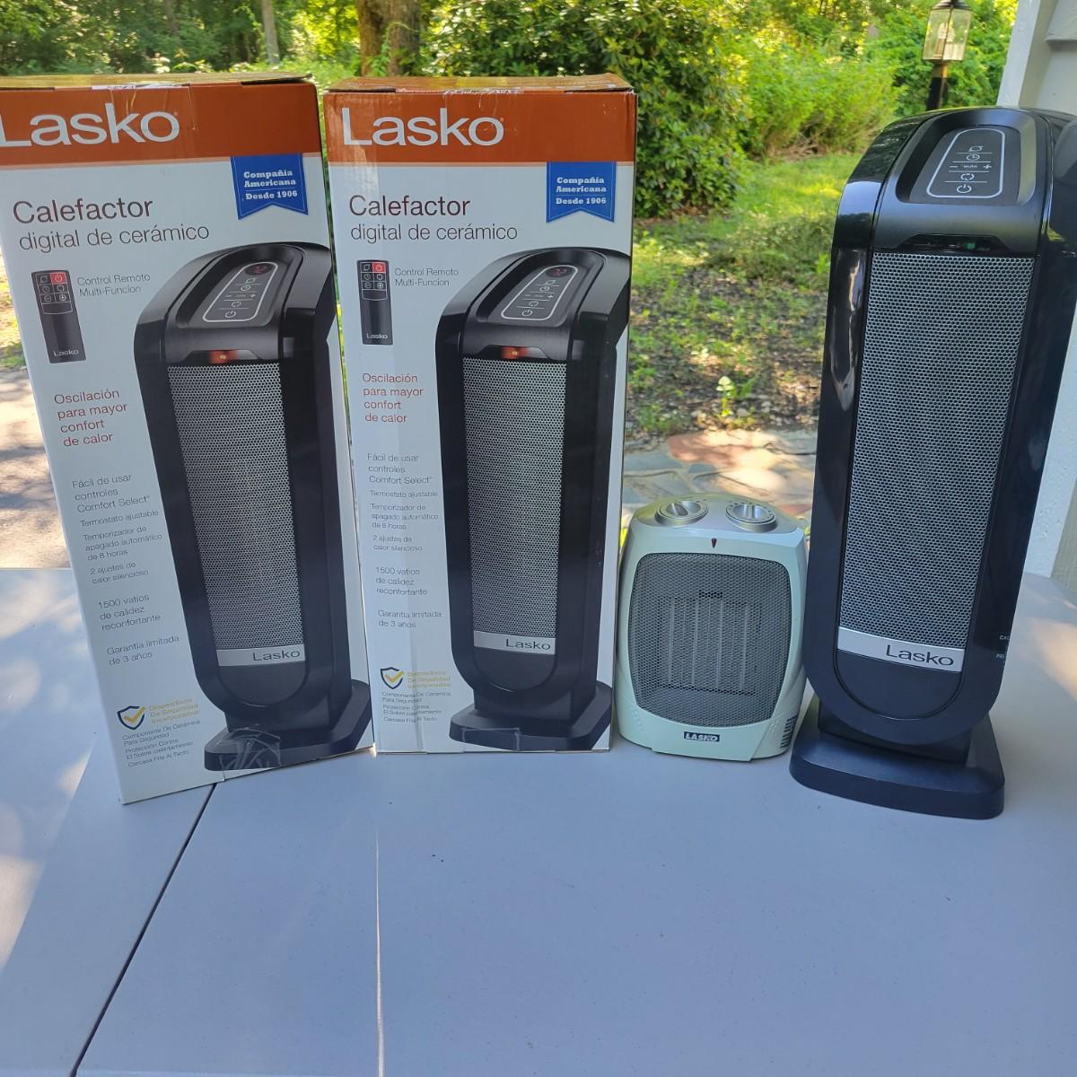 3 Lasko digital ceramic heaters. 2 are new and in original packing, 1 has been tested and works. Smaller Lasko 1500watt heater used but tested and works. Local pickup only