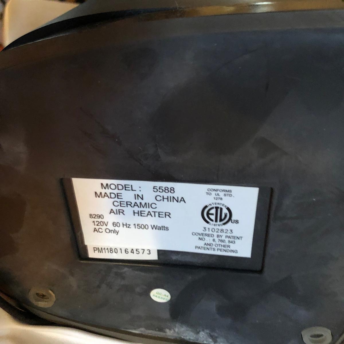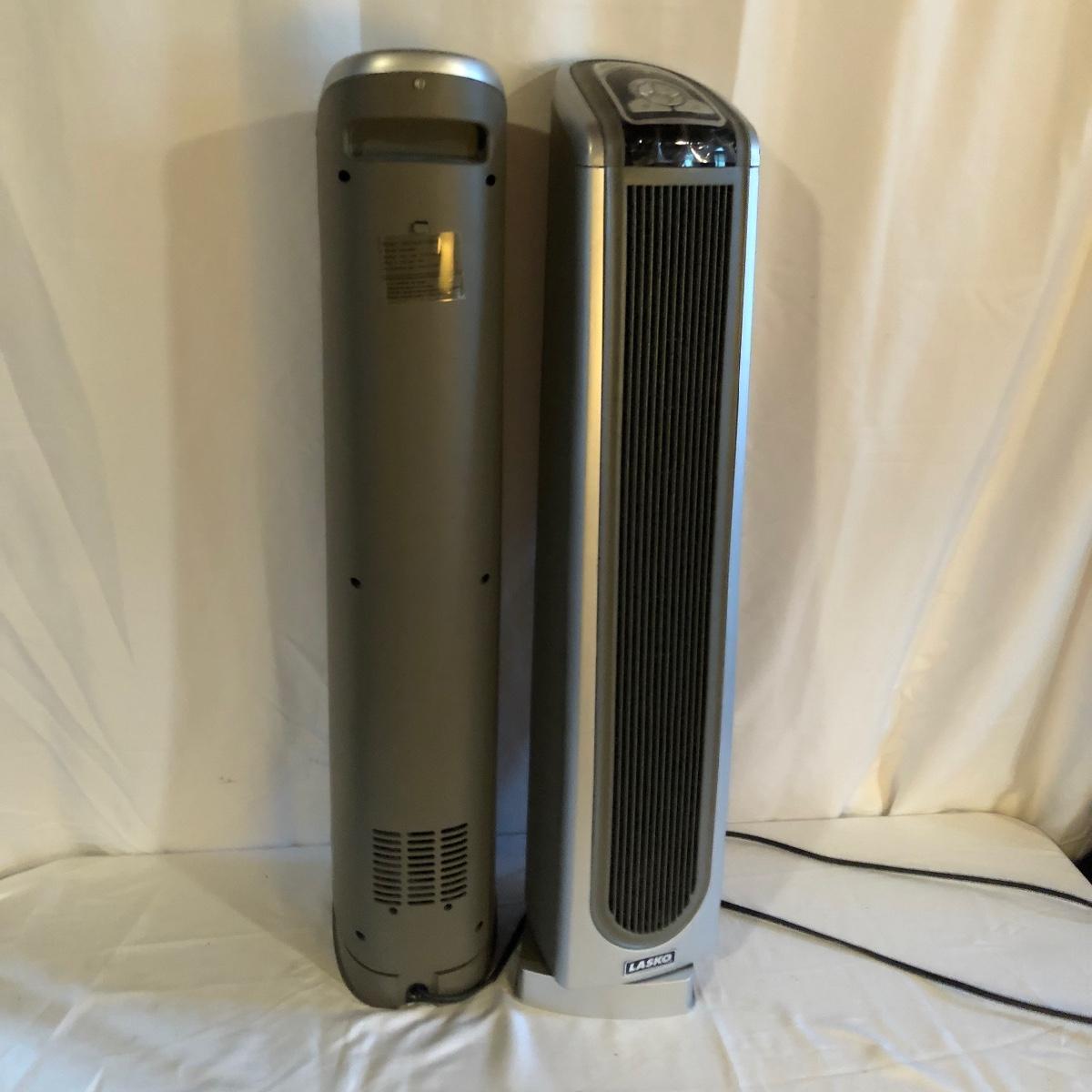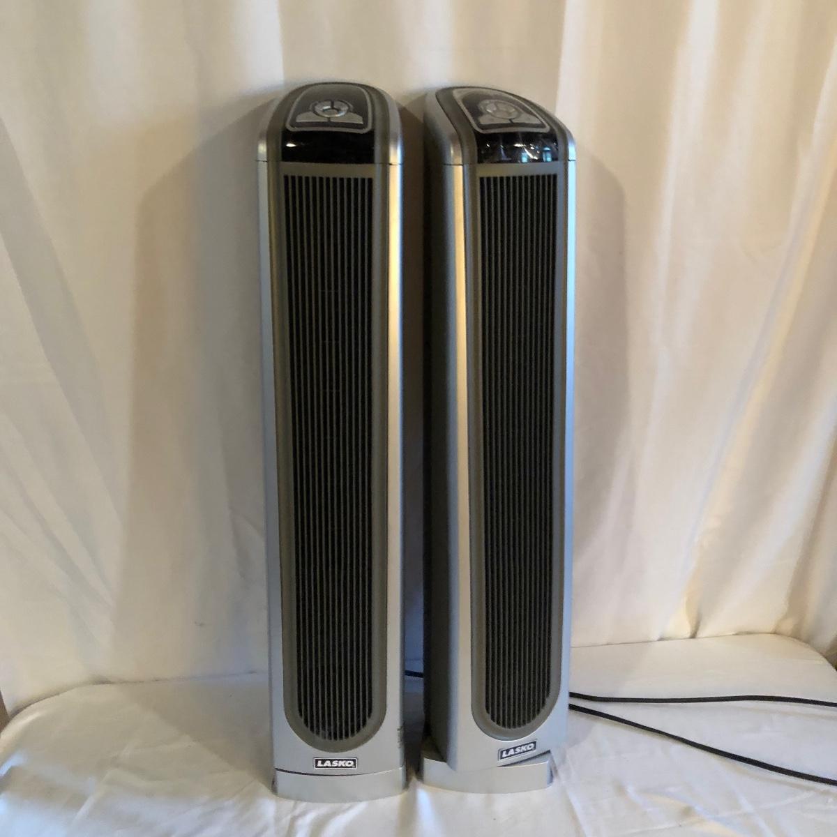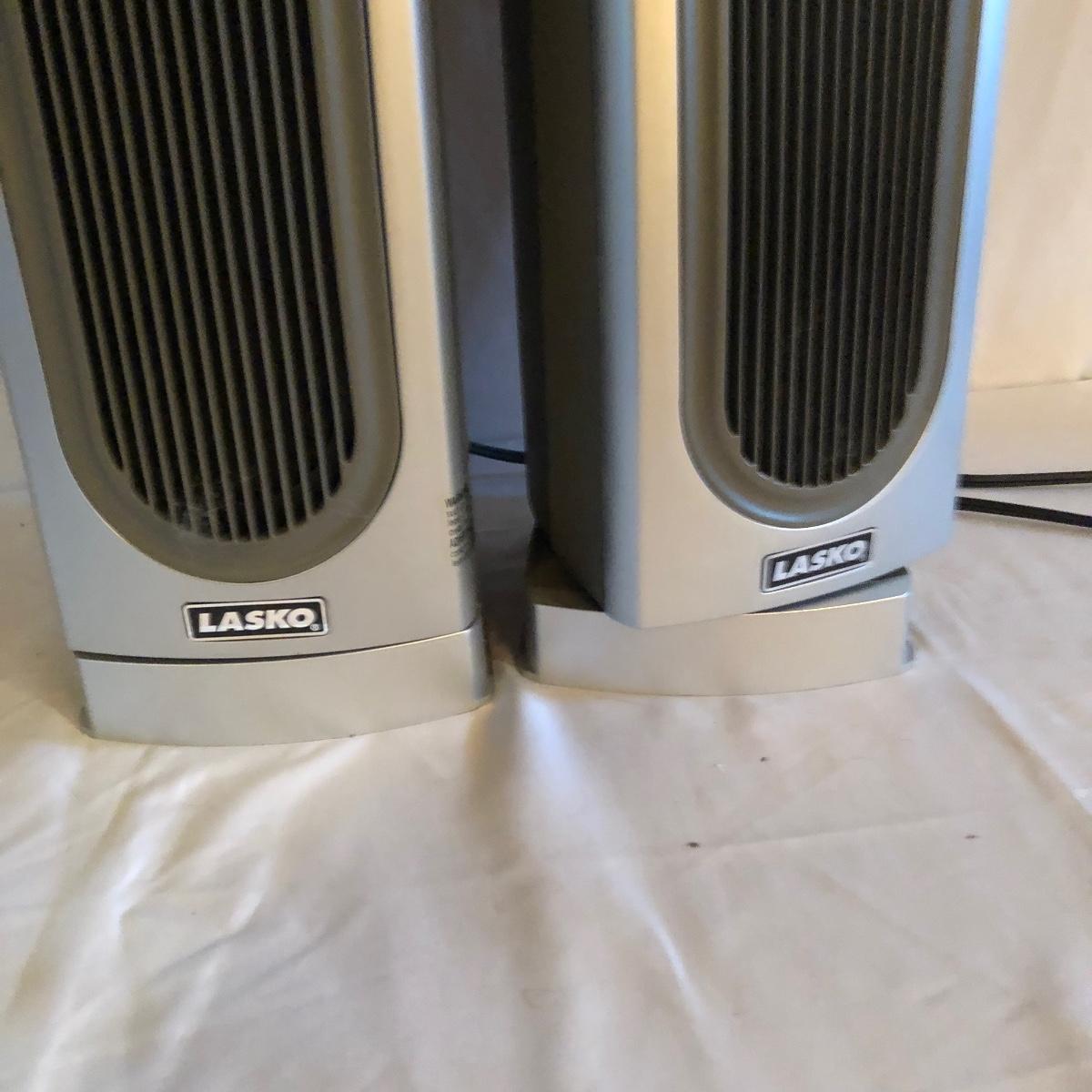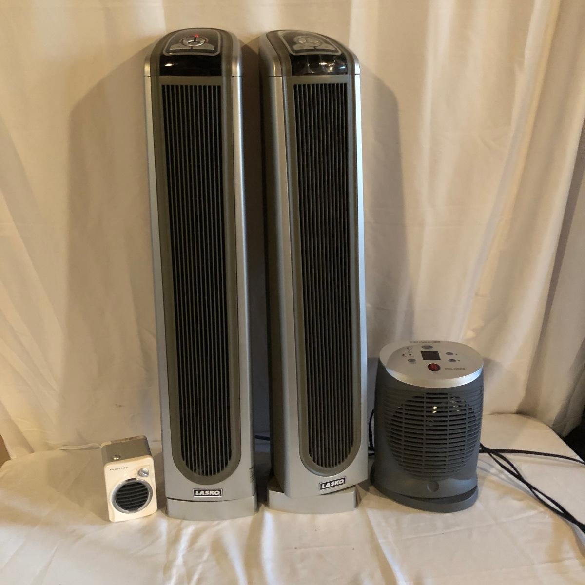 Lot includes two Lasko model # 5588 oscillating heaters, Pelonis model # HF-0034 oscillating heater and a Sharper Image model # VX351 heater. All heaters worked when tested. Lasko heaters measure 7” x 8” x 33”.