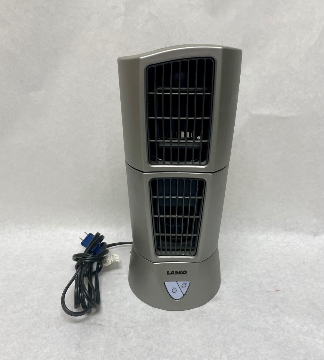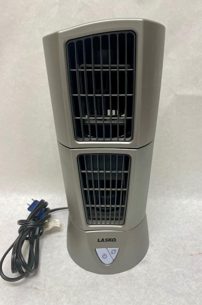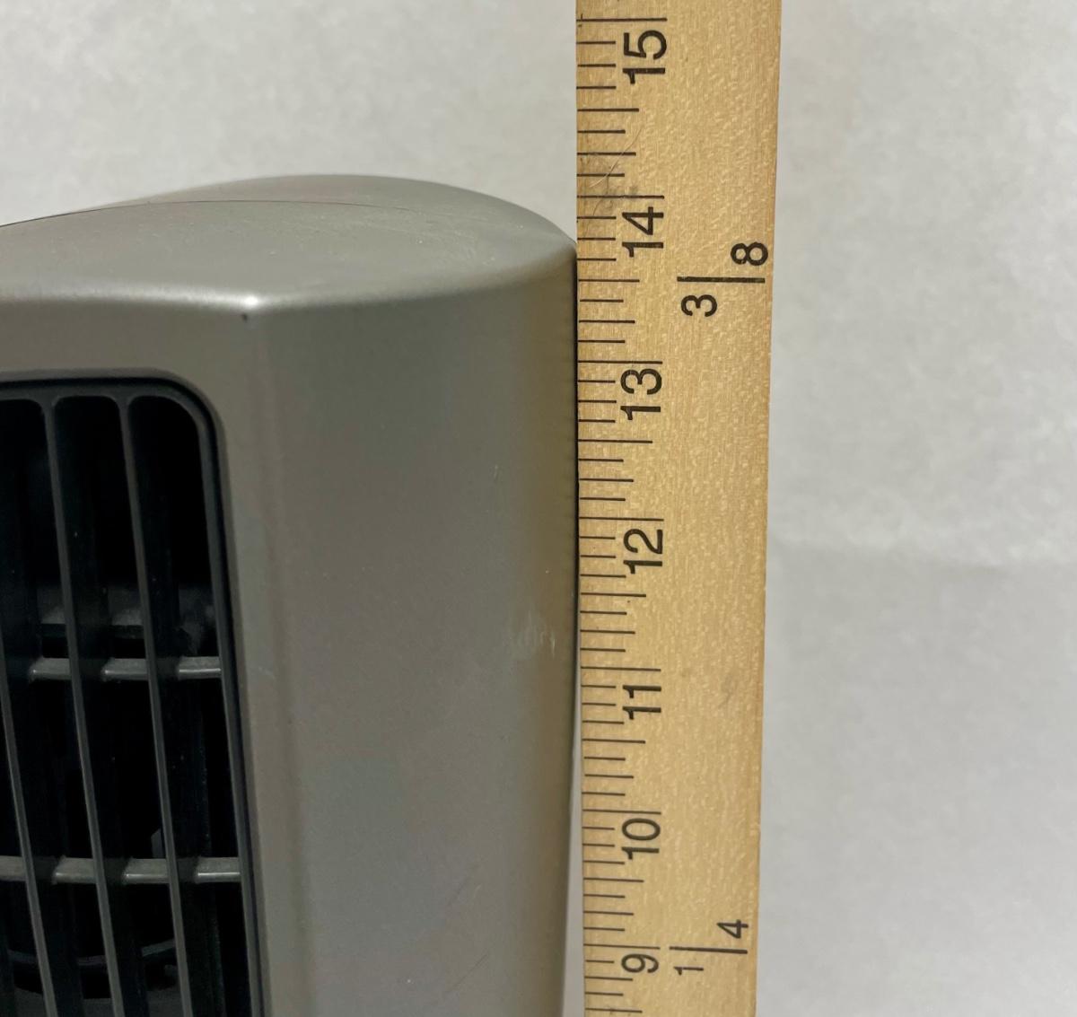 Model DTB. Approx. 14" tall. Upper and lower fan section can be independently positioned to point in different directions. Oscillating function can be switched on or off independent of the fan. Tested, works as expected, runs quiet.