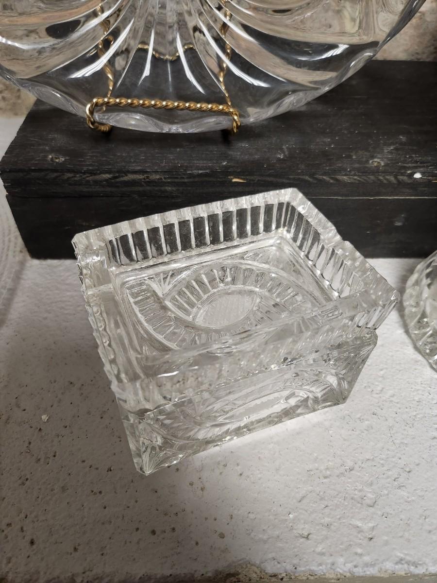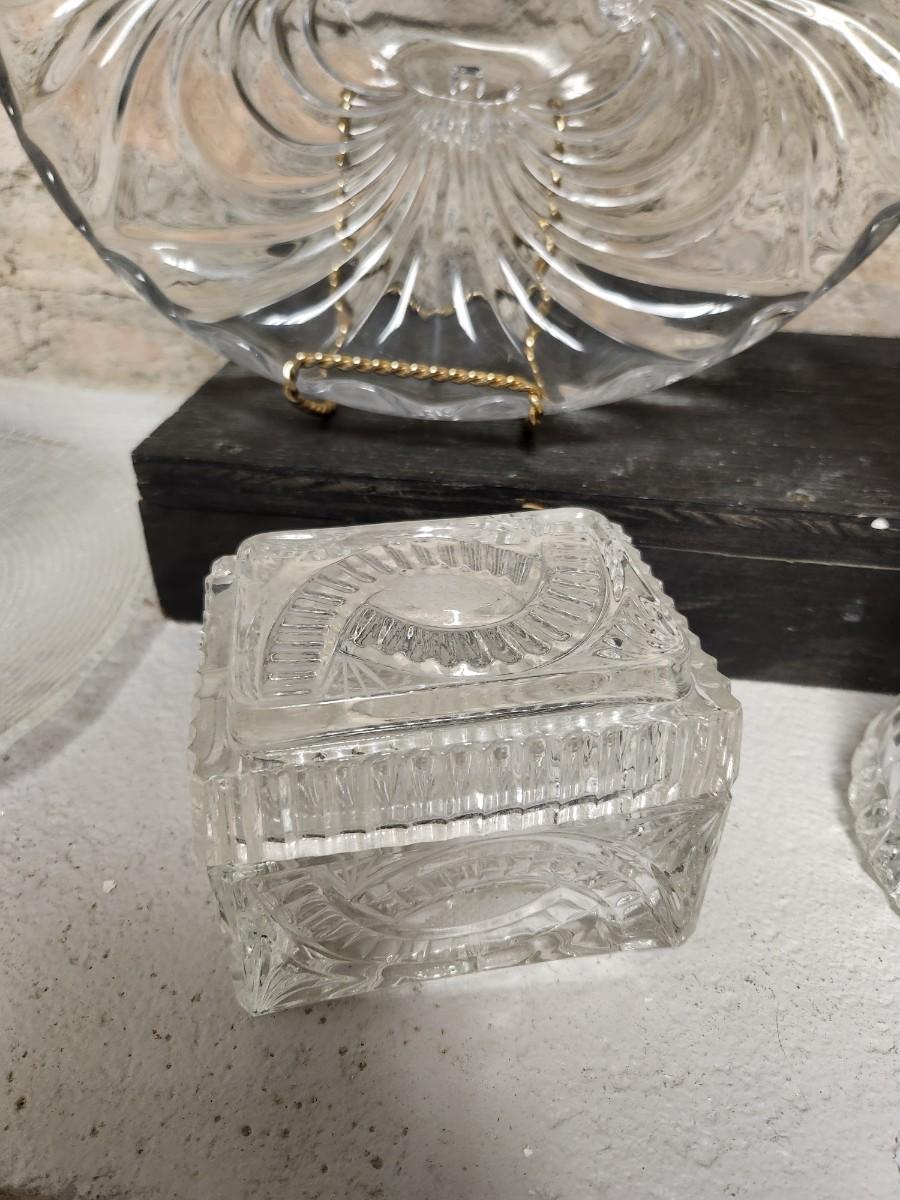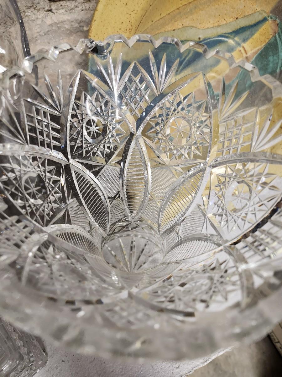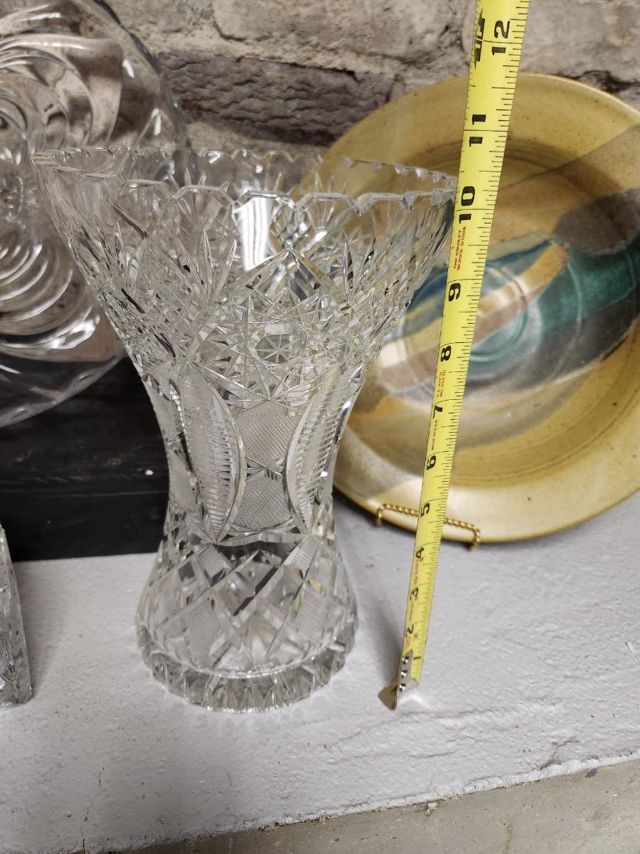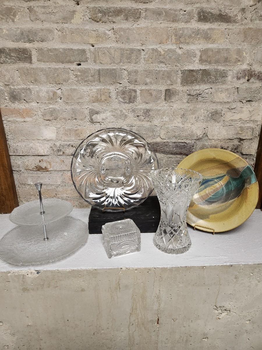 Huge 4 footed Caprice platter, awesome 2 tiered tidbit, huge crystal vase..notice the damage. That little box is a cigarette holder and ashtray and a beautiful flanged potter bowl.