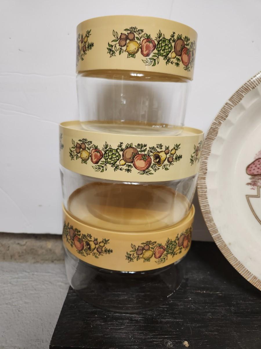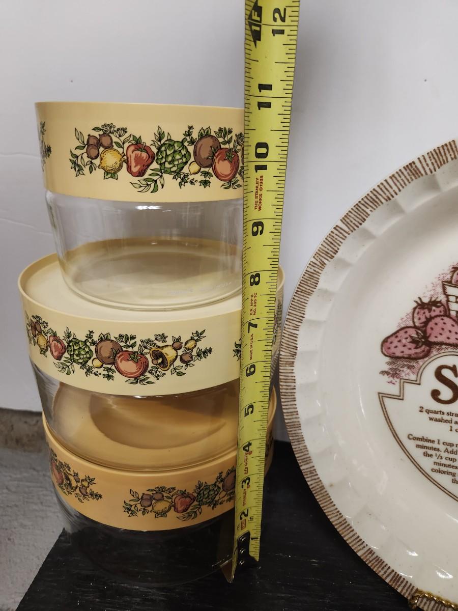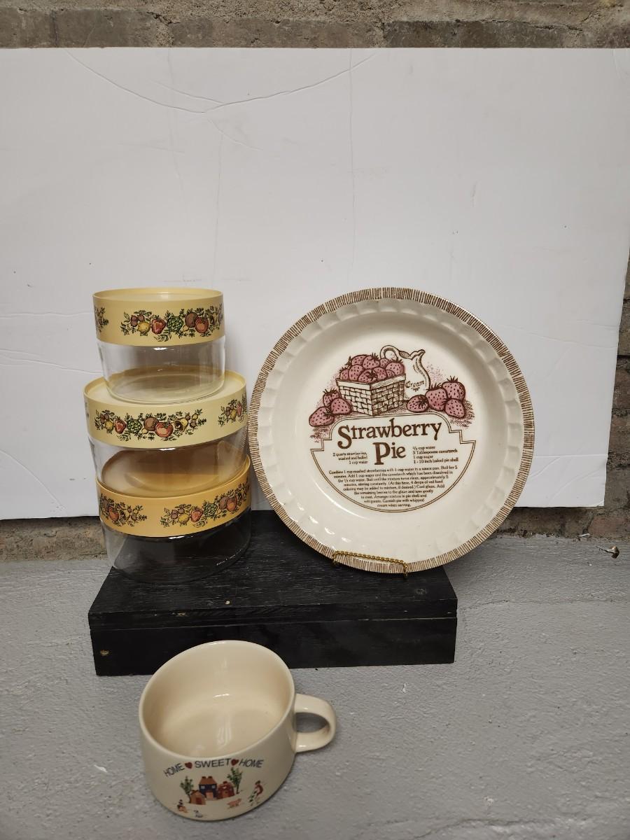 Sweet vintage lot...3 spice of life canisters (missing rubber seals), soup cup and awesome Jeanette Strawberry Pie Plate