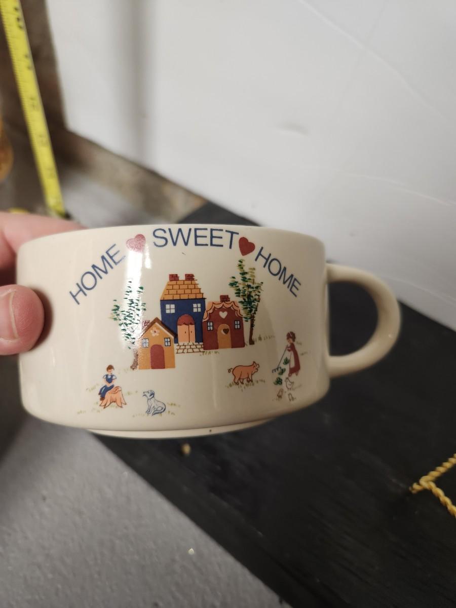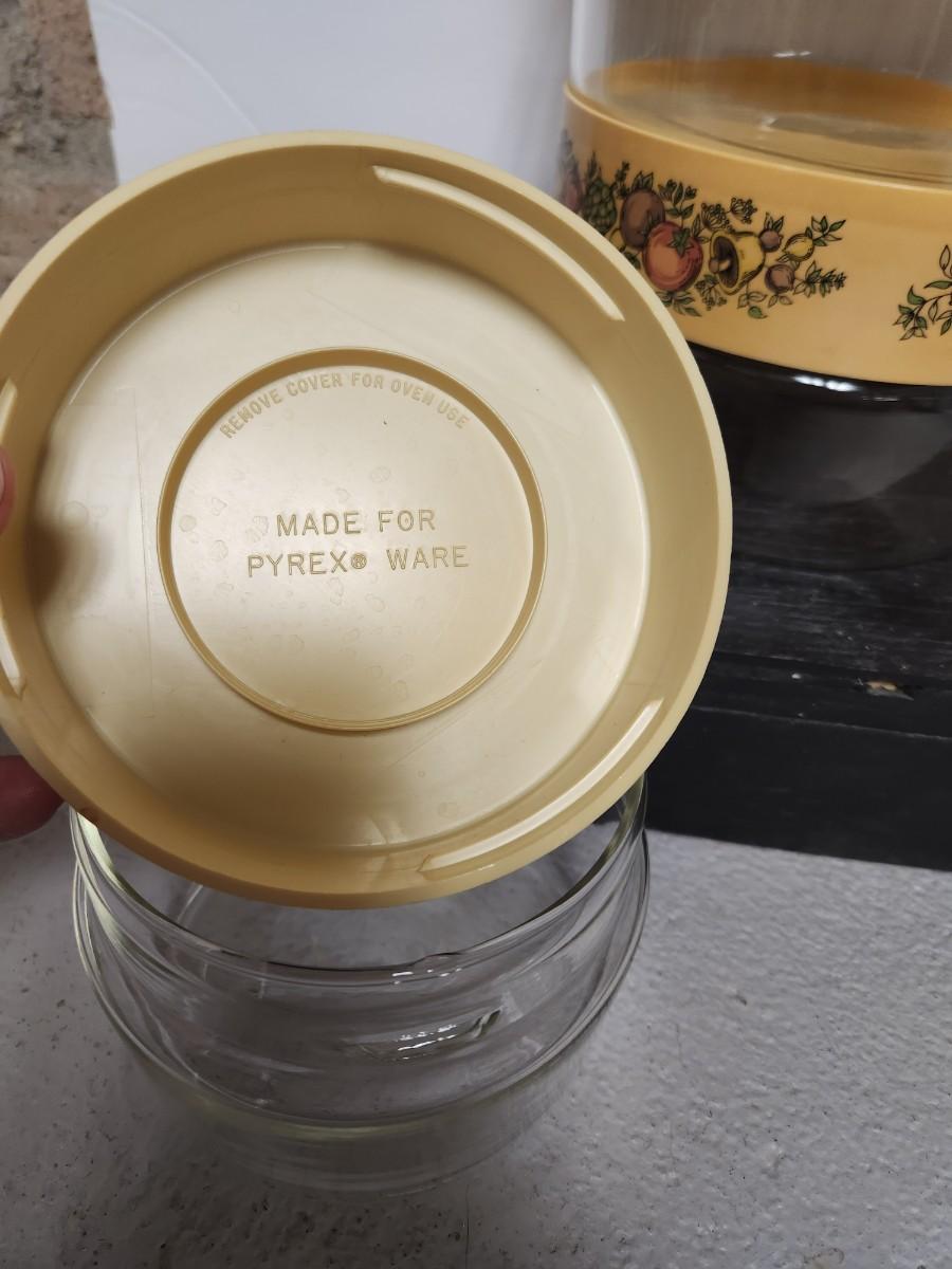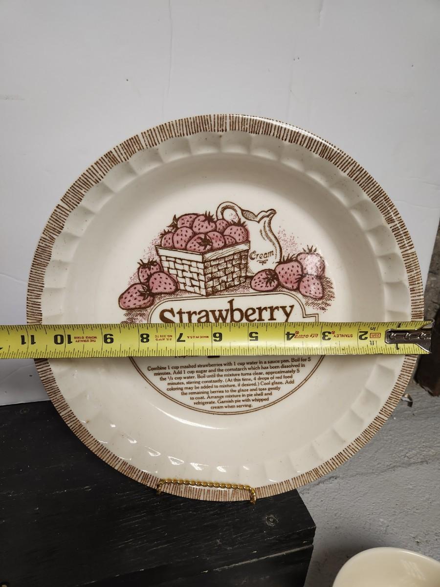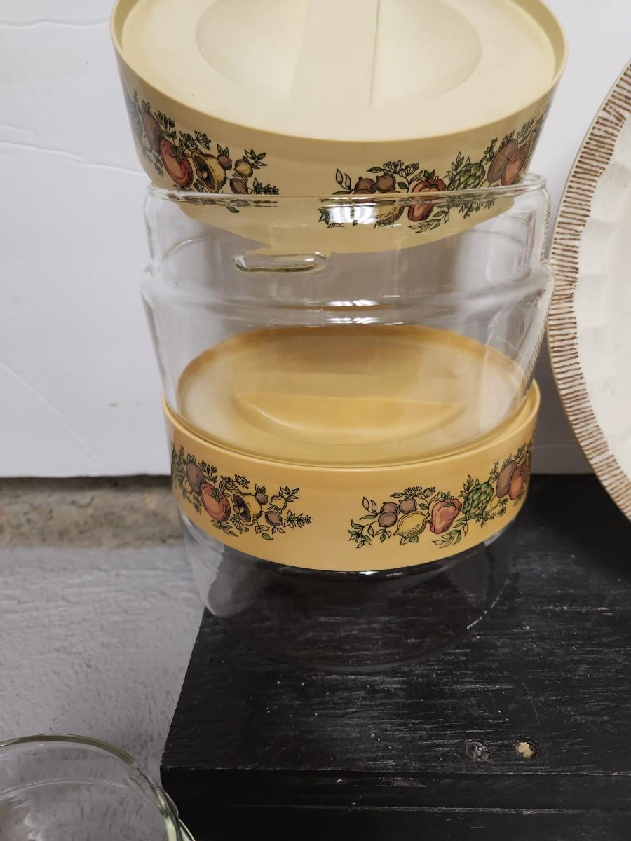 Sweet vintage lot...3 spice of life canisters (missing rubber seals), soup cup and awesome Jeanette Strawberry Pie Plate