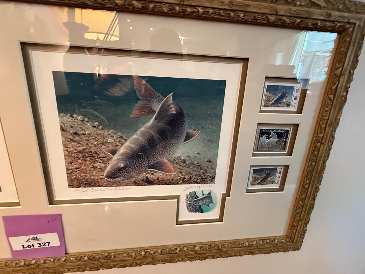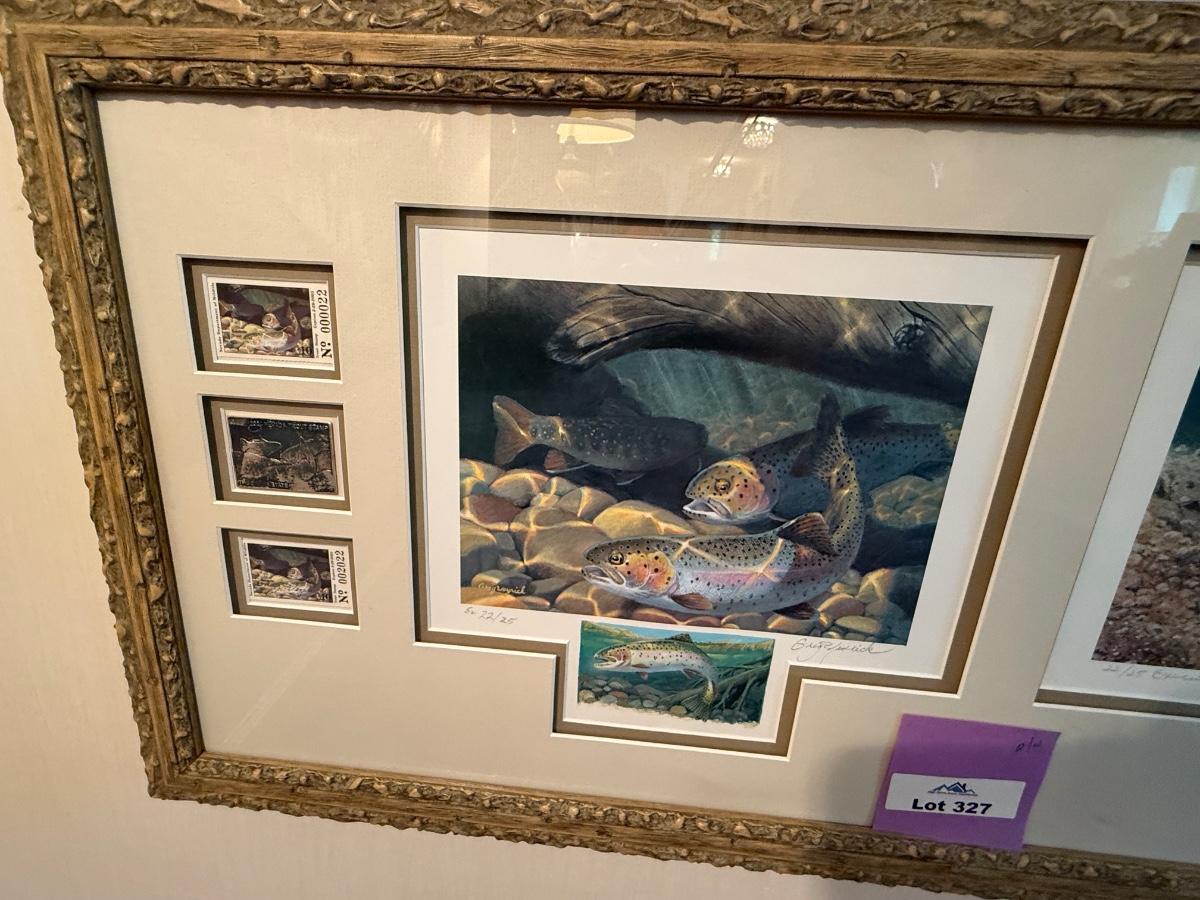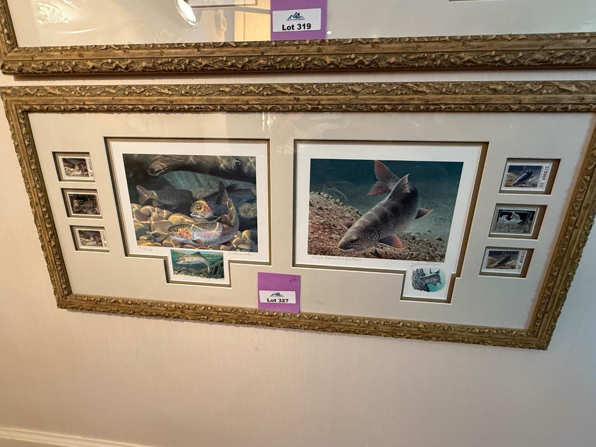 long framed NV Trout Dbl. print w/4 stamps & 2 silver