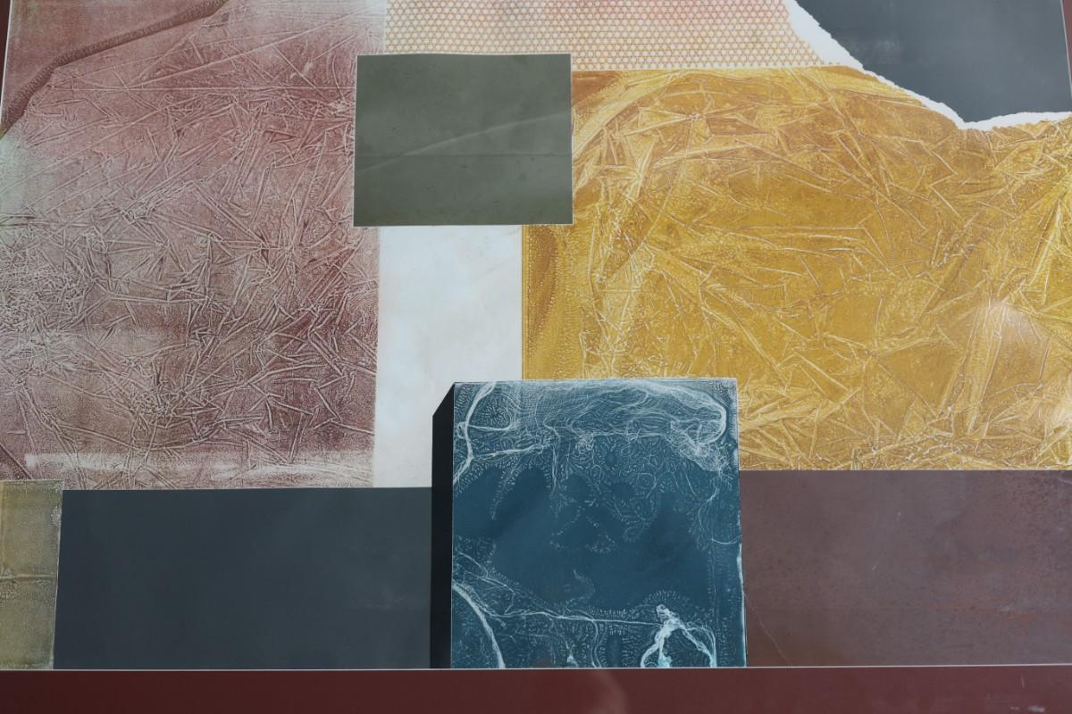 Original abstract monotype by Laszlo Dus, titled Untitled. Mixed abstract composition with layered geometric forms and textured color fields. Professionally framed.