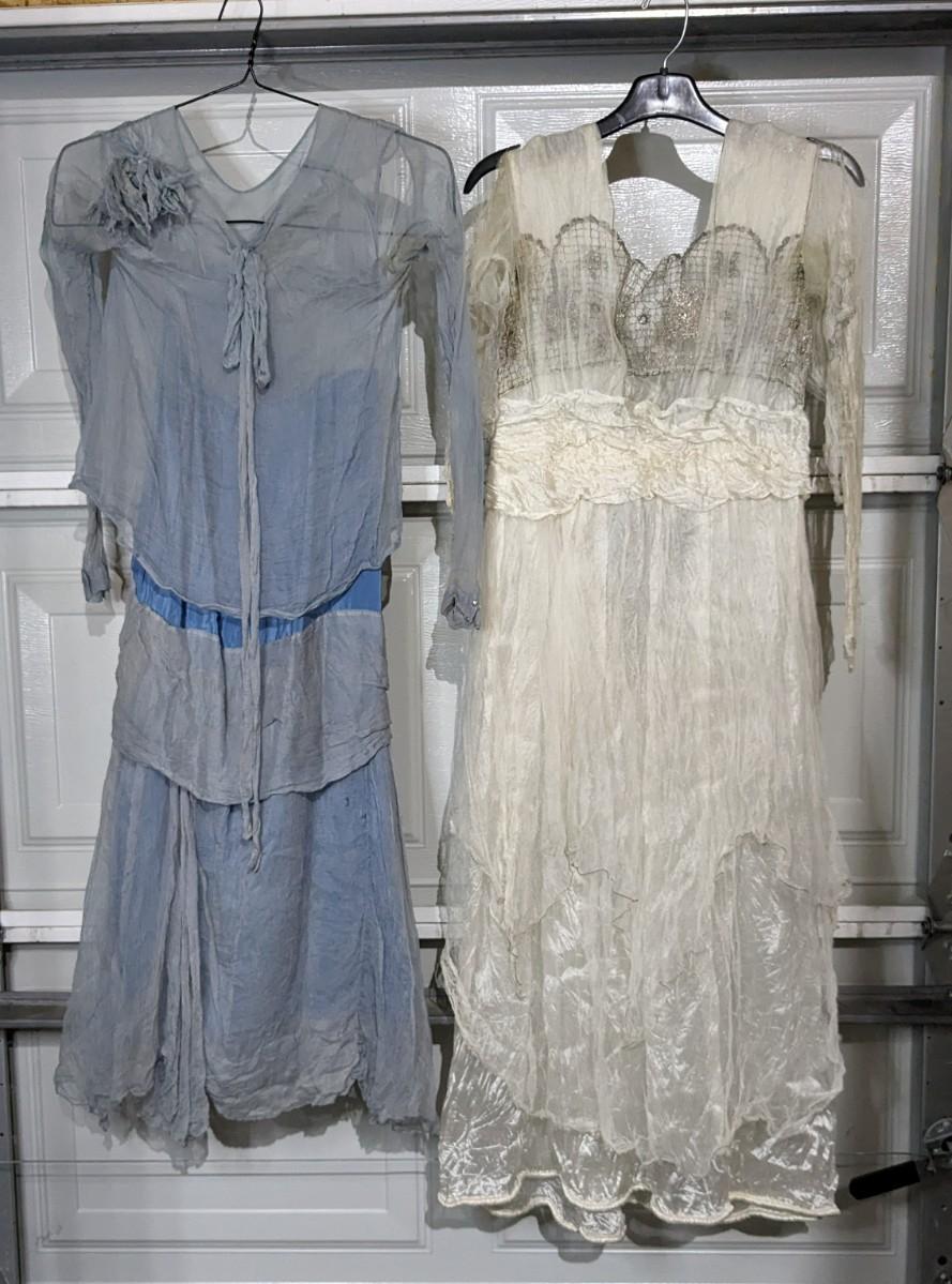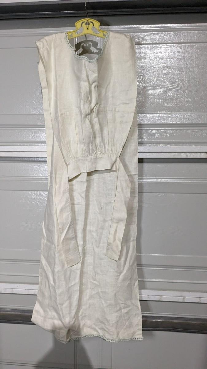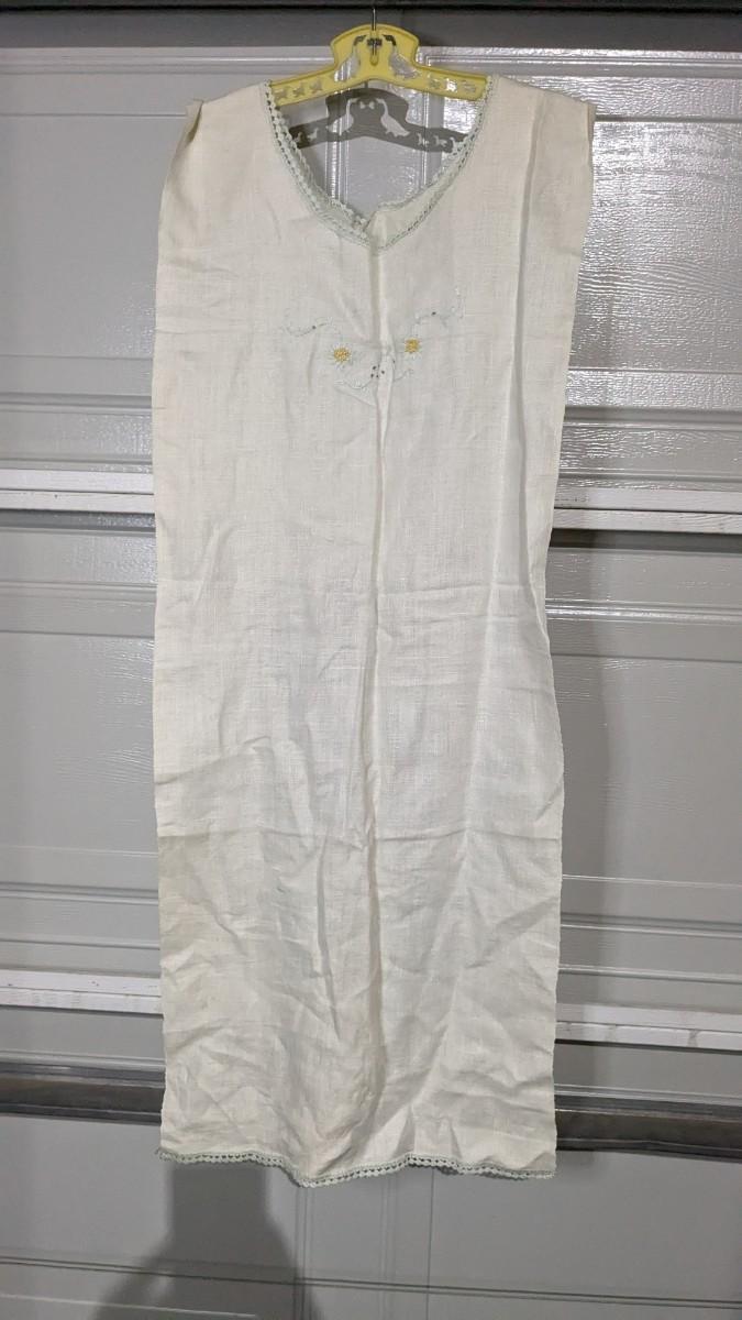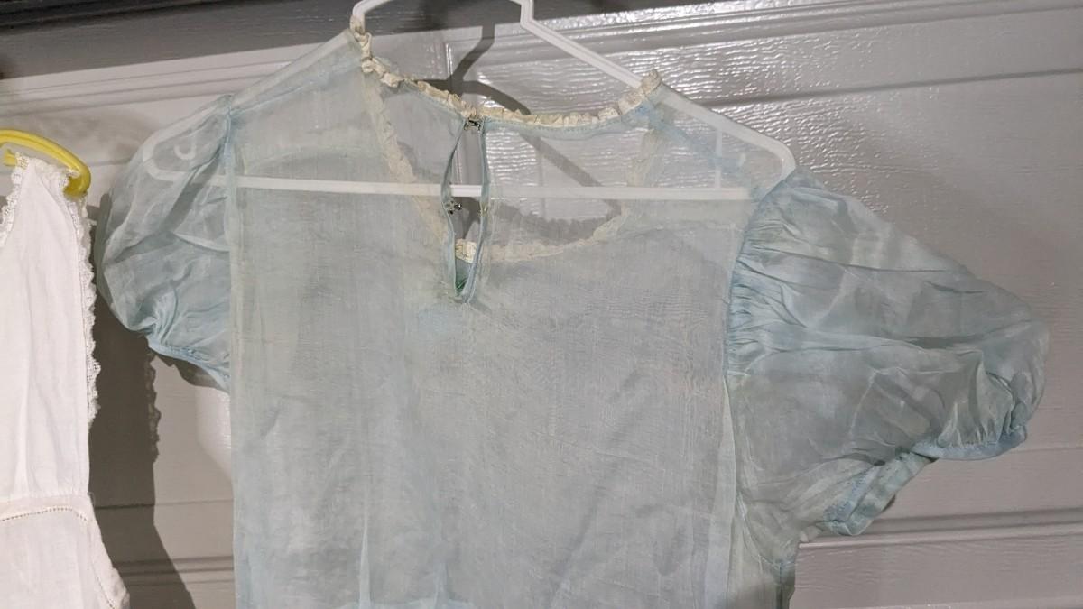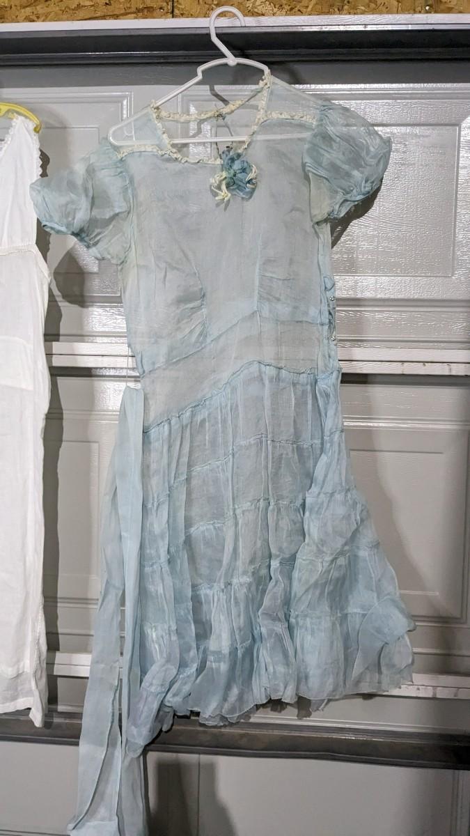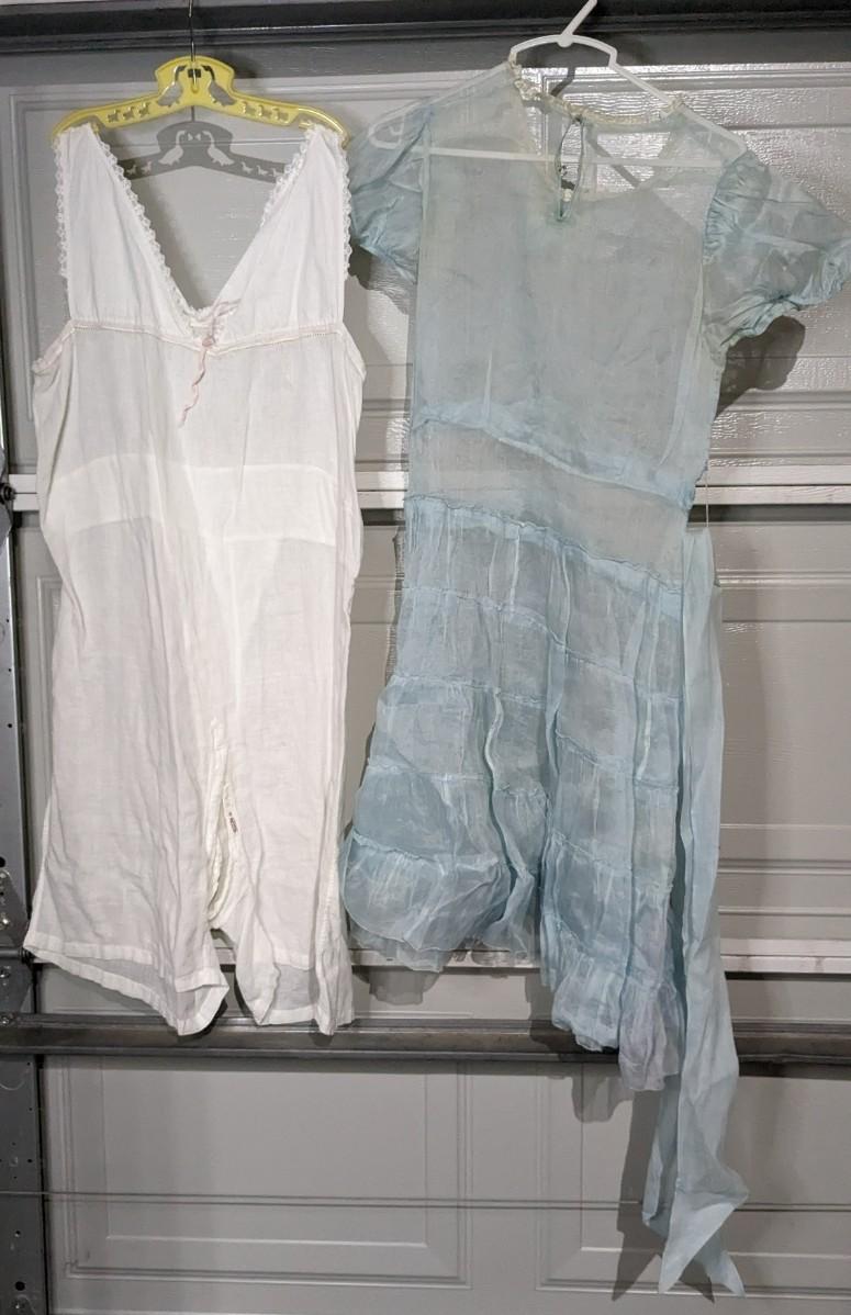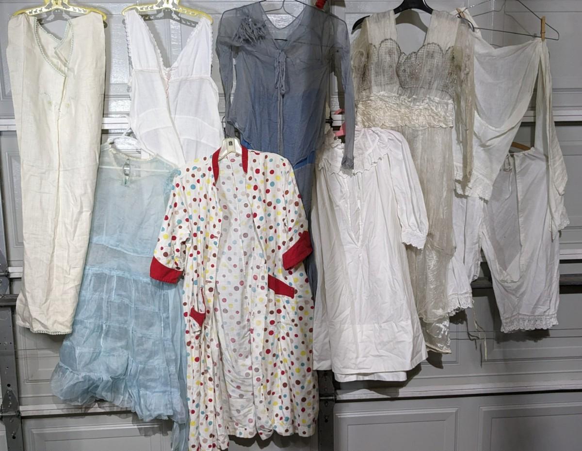 2 bloomers, 2 evening gowns that show significant wear to mesh and underarms, nightgown and housecoat with no buttons, lovely blue dress with sash, muslin full body apron with lovely needlework front, and linen Flax Nett size 42 full body underwear. Sizes best suited for 16-XS with exception to blue dress that is closer to a contemporary girls 10