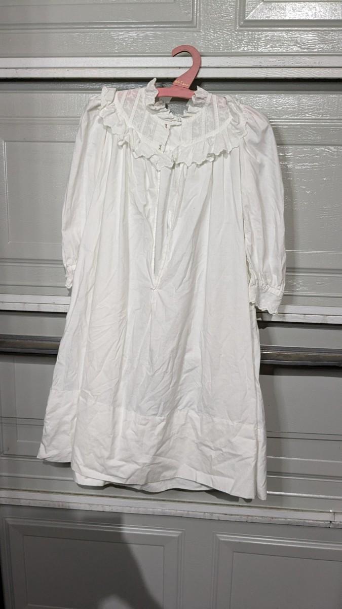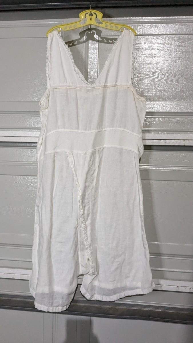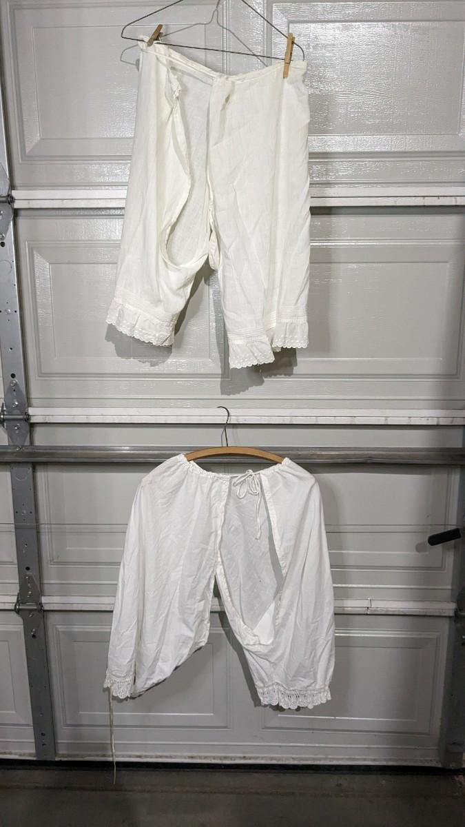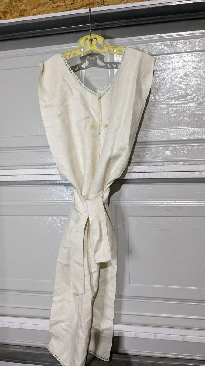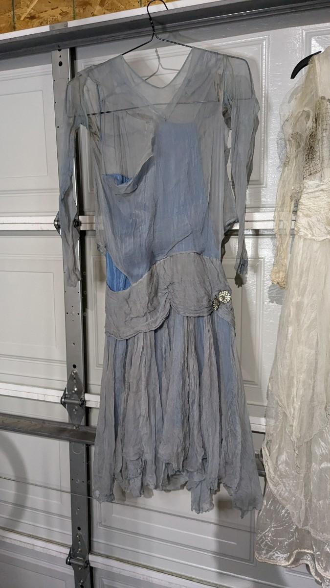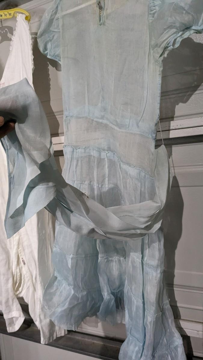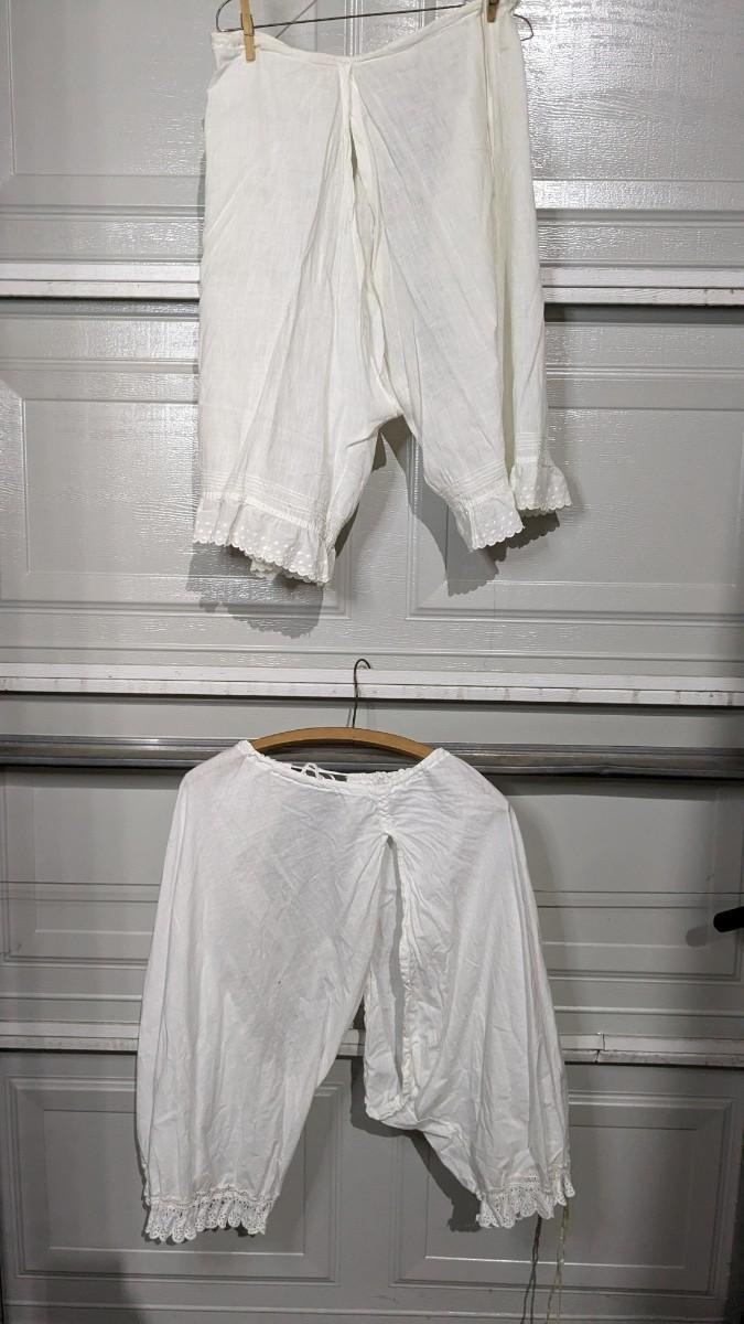 2 bloomers, 2 evening gowns that show significant wear to mesh and underarms, nightgown and housecoat with no buttons, lovely blue dress with sash, muslin full body apron with lovely needlework front, and linen Flax Nett size 42 full body underwear. Sizes best suited for 16-XS with exception to blue dress that is closer to a contemporary girls 10