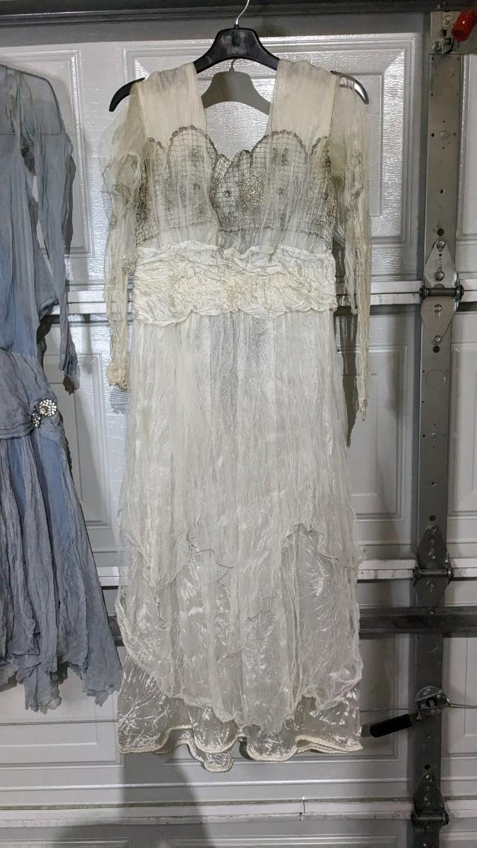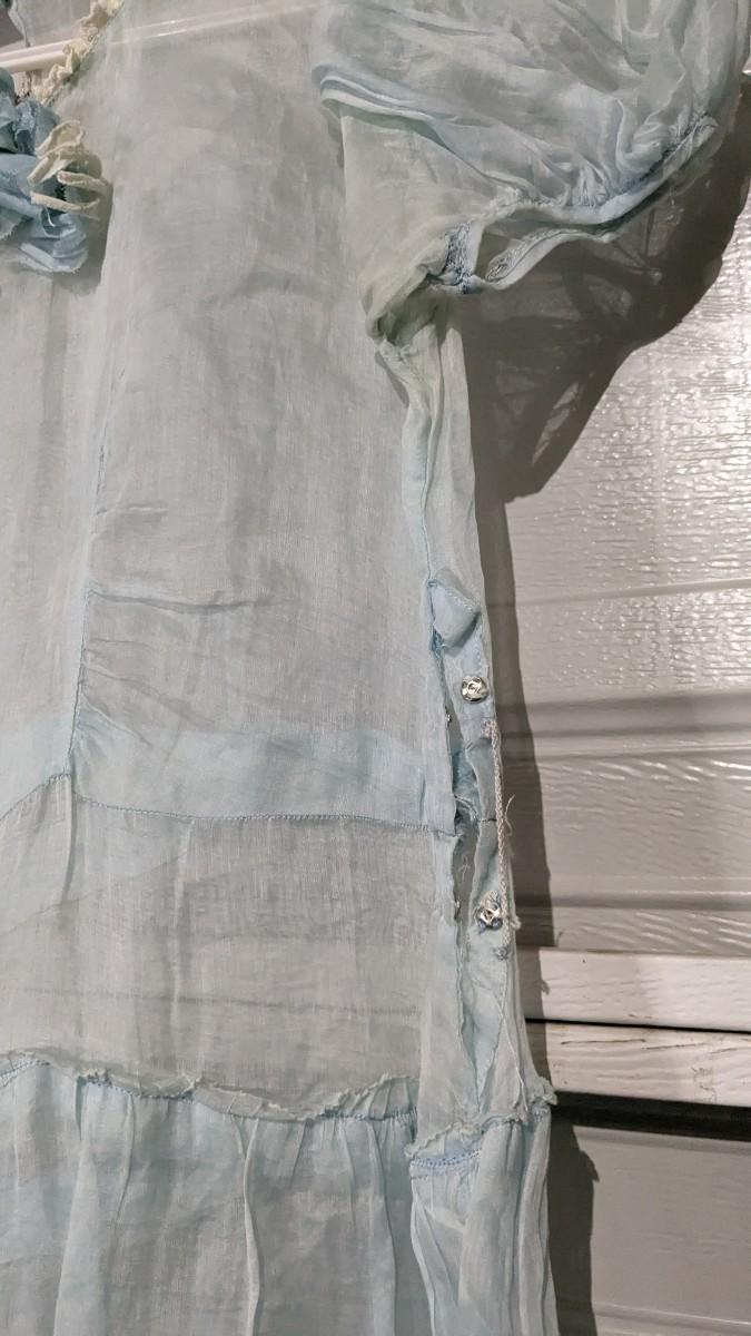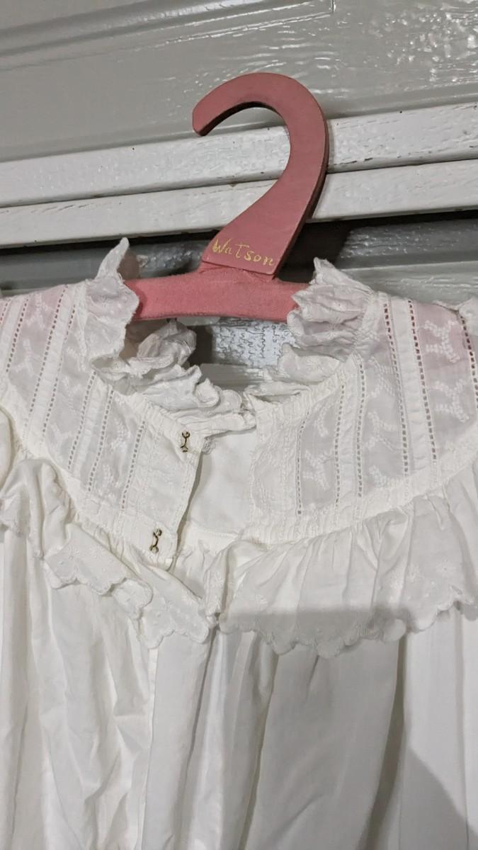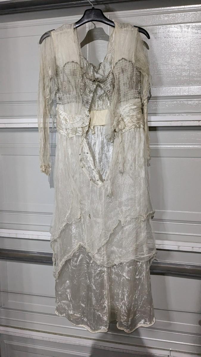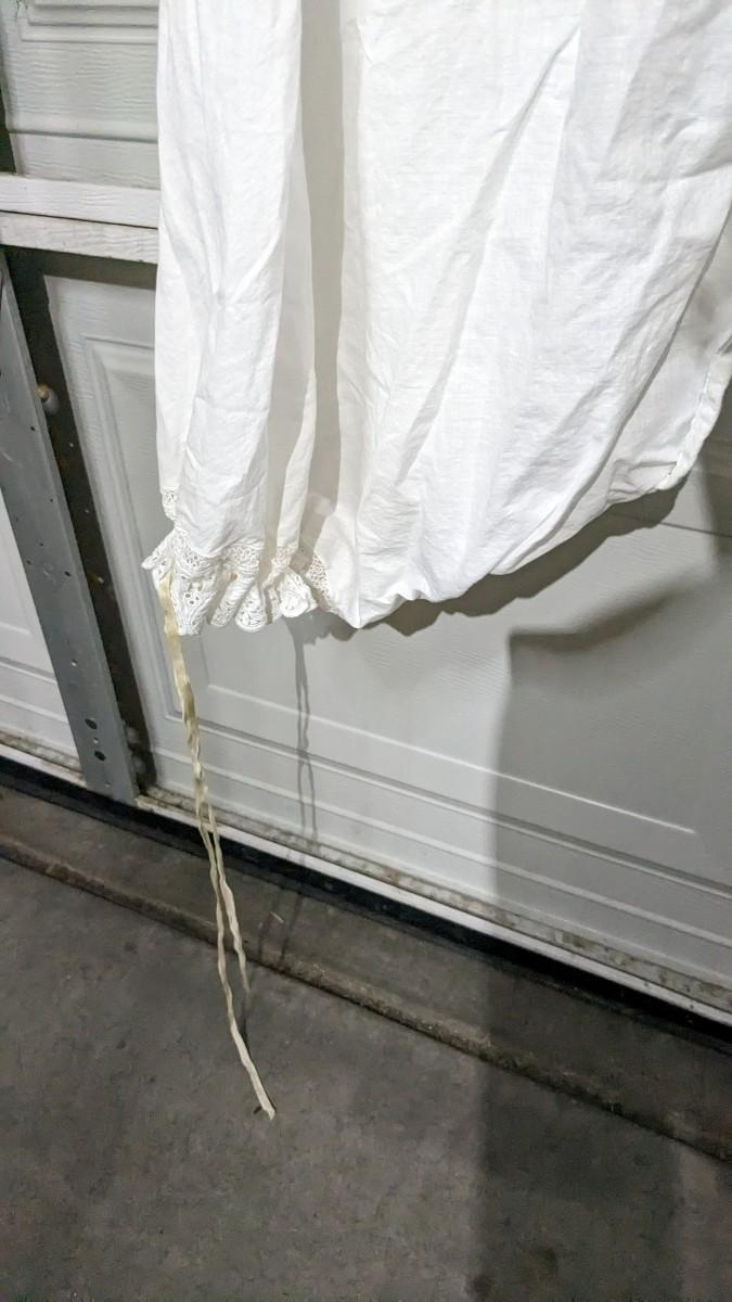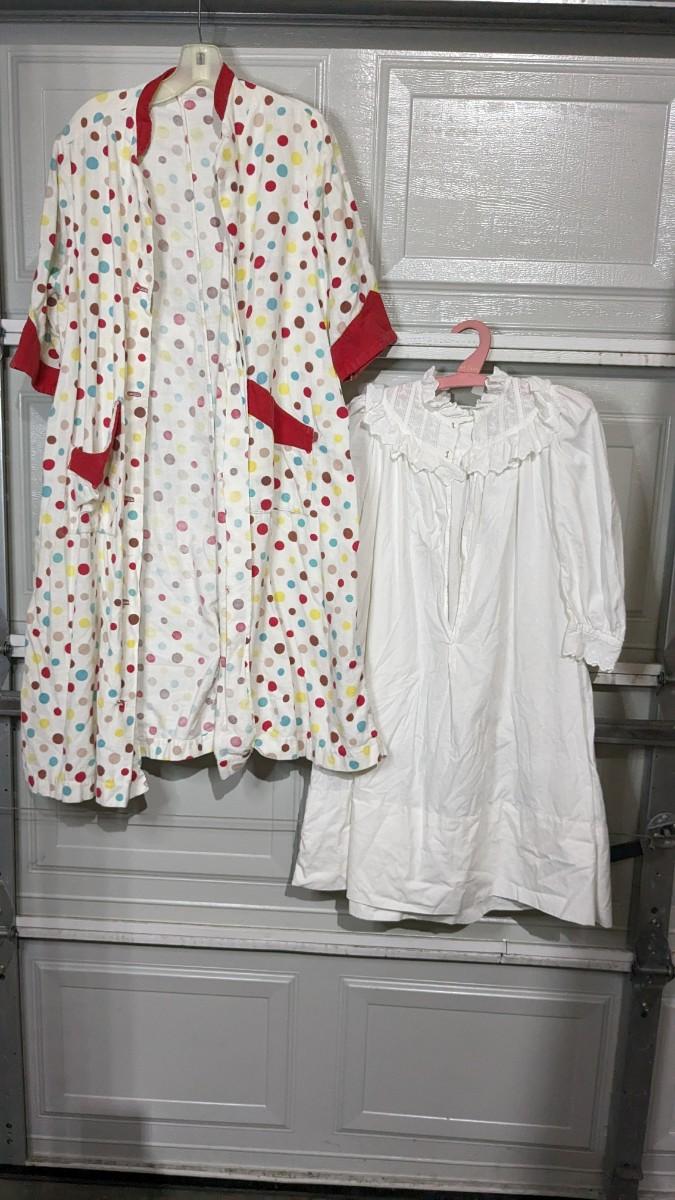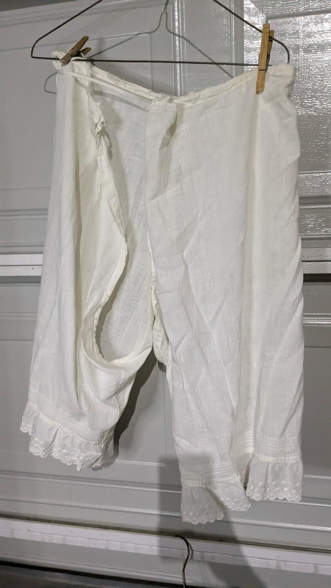 2 bloomers, 2 evening gowns that show significant wear to mesh and underarms, nightgown and housecoat with no buttons, lovely blue dress with sash, muslin full body apron with lovely needlework front, and linen Flax Nett size 42 full body underwear. Sizes best suited for 16-XS with exception to blue dress that is closer to a contemporary girls 10
