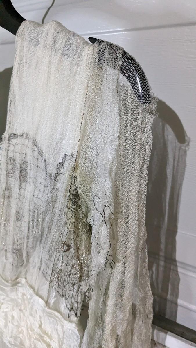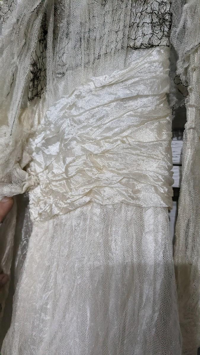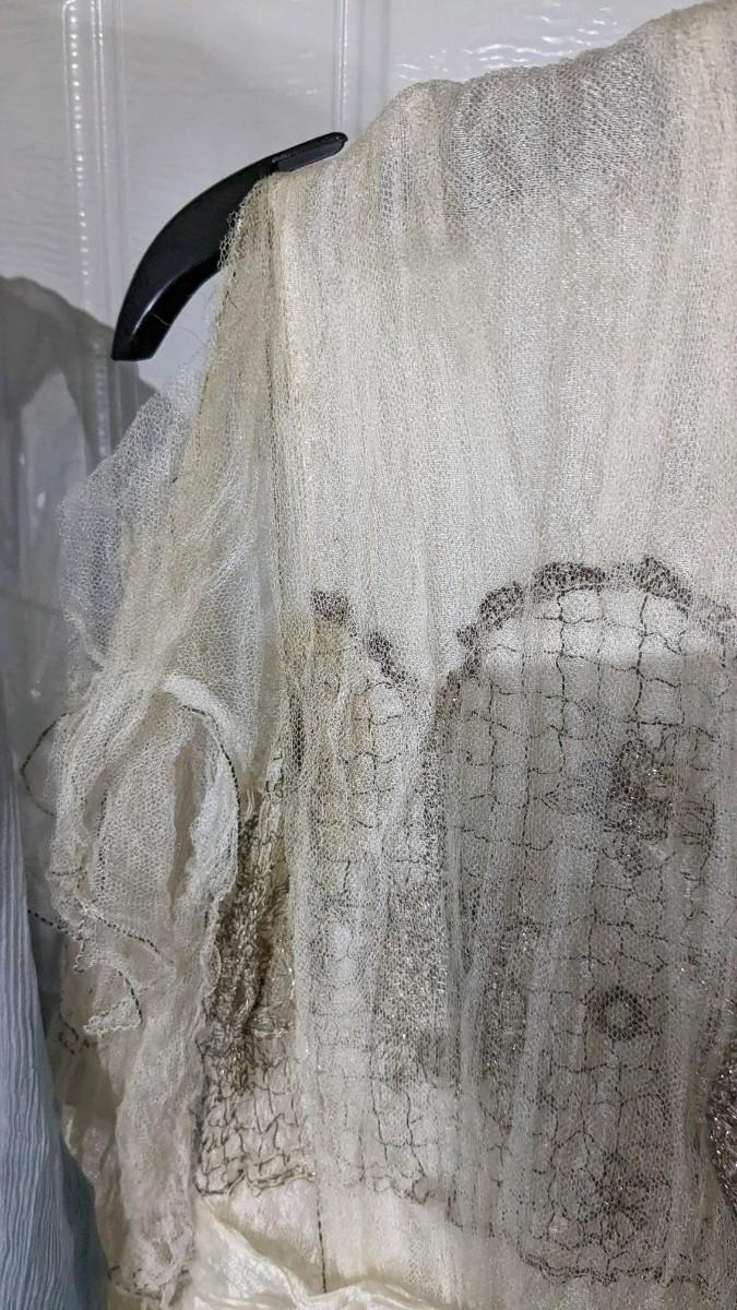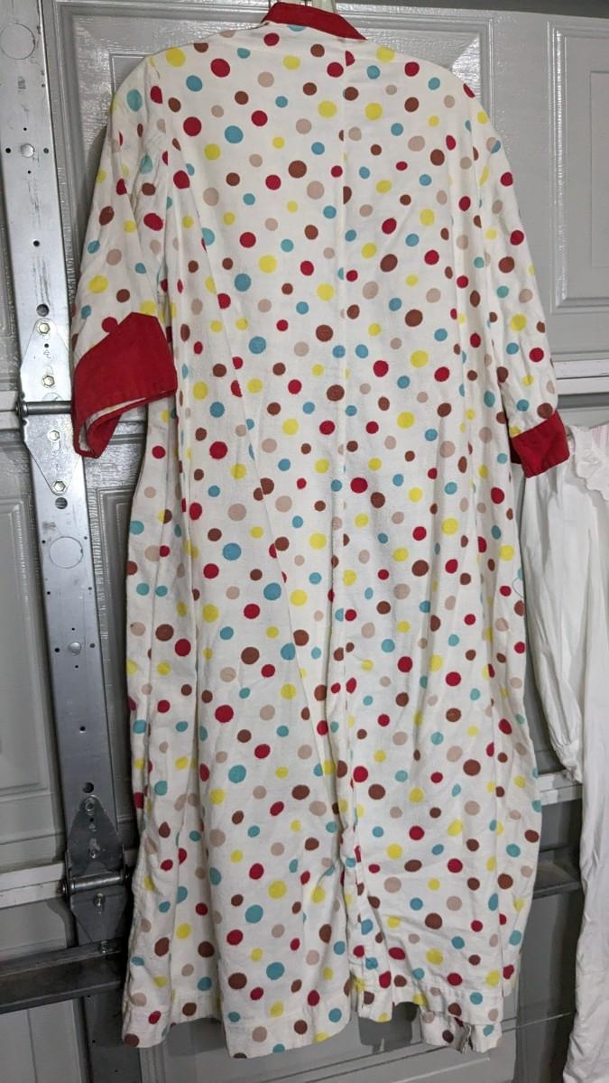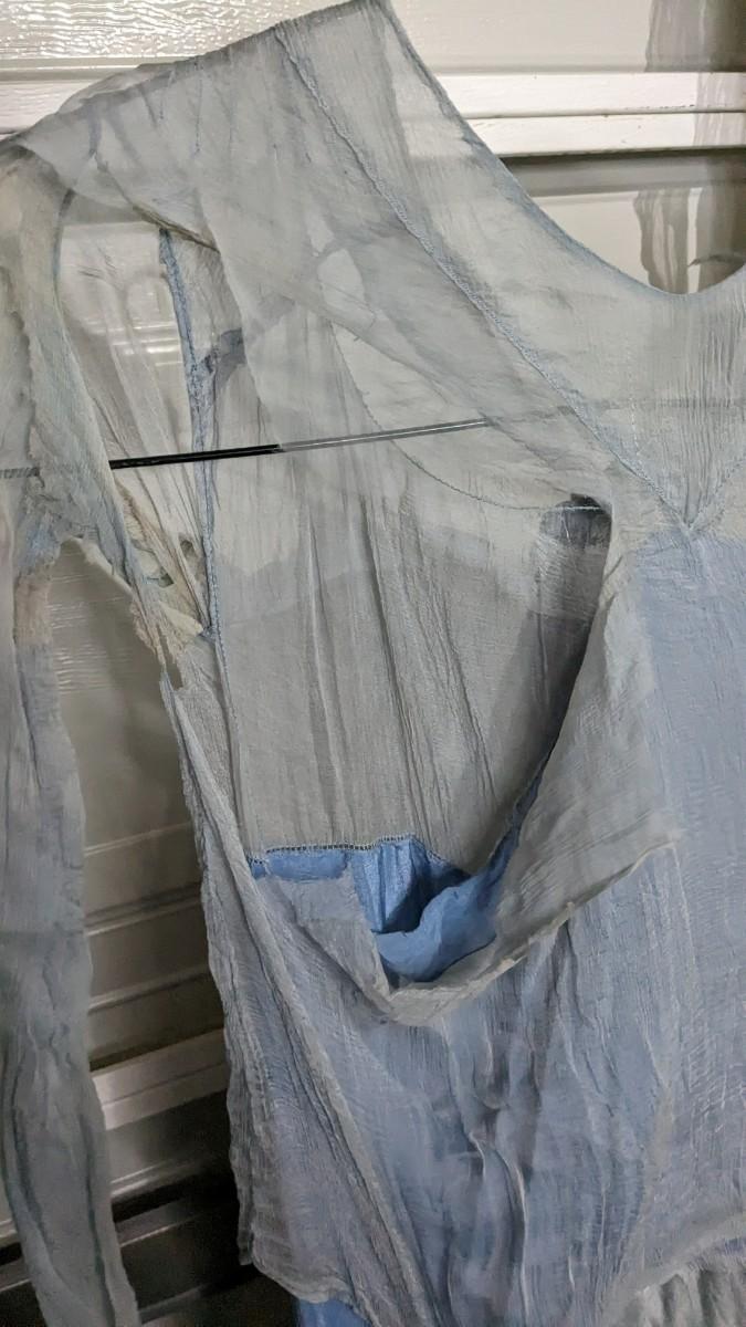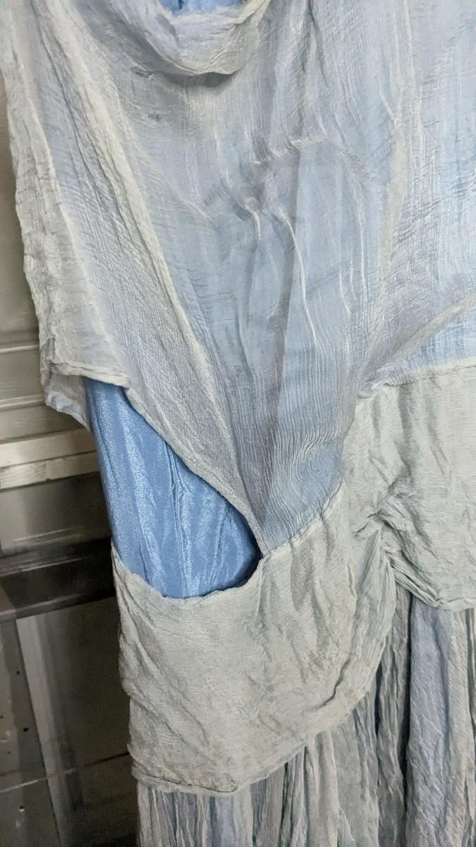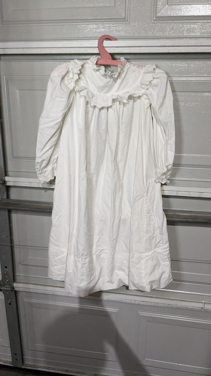 2 bloomers, 2 evening gowns that show significant wear to mesh and underarms, nightgown and housecoat with no buttons, lovely blue dress with sash, muslin full body apron with lovely needlework front, and linen Flax Nett size 42 full body underwear. Sizes best suited for 16-XS with exception to blue dress that is closer to a contemporary girls 10