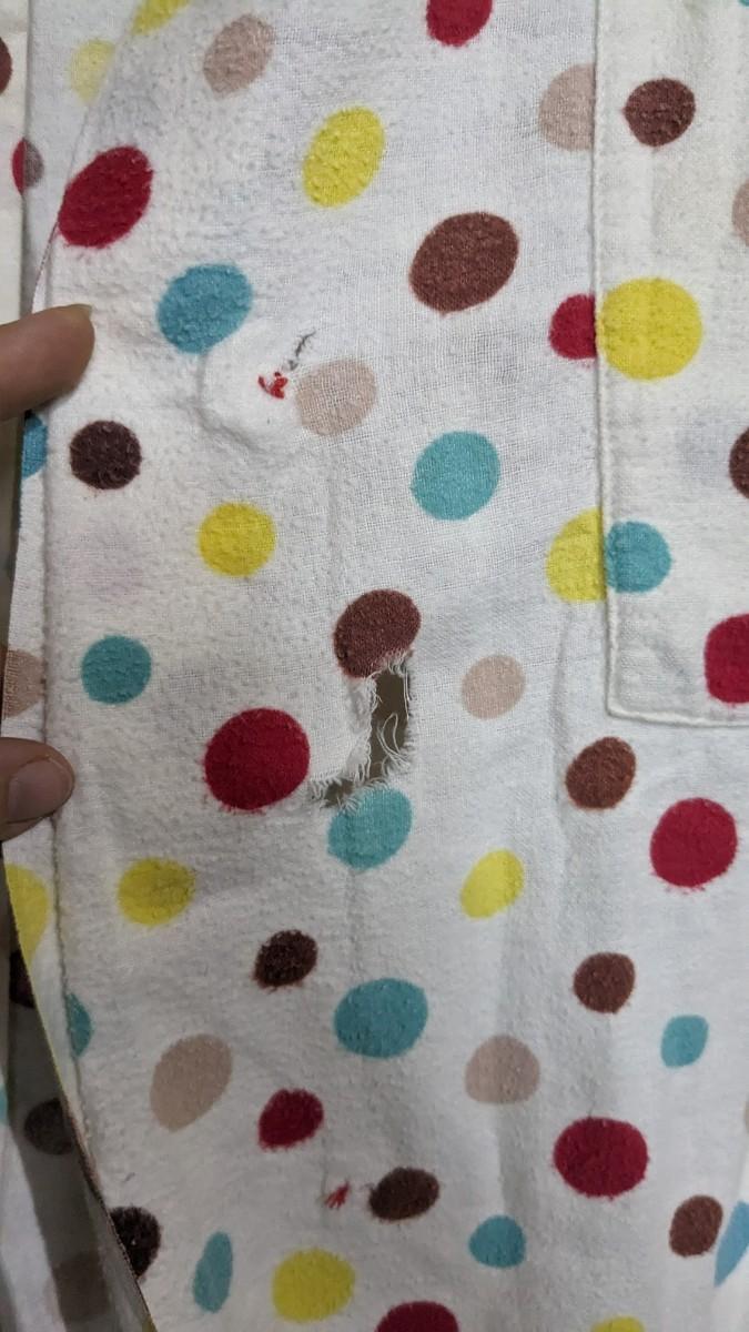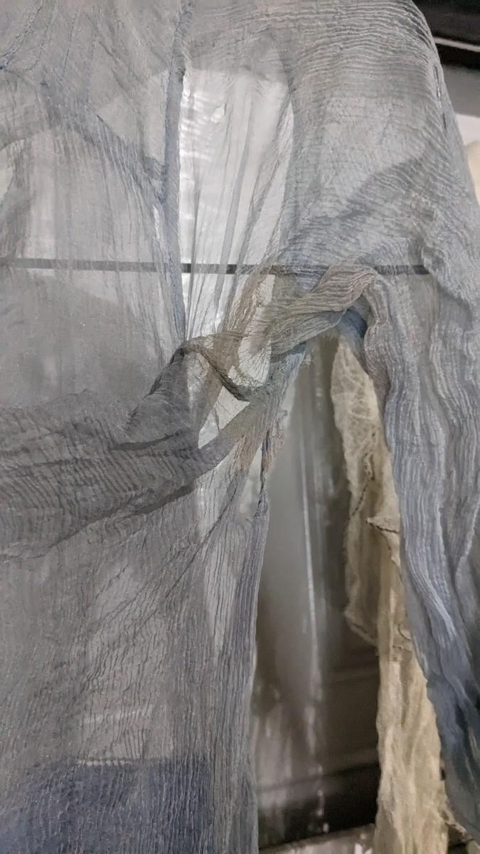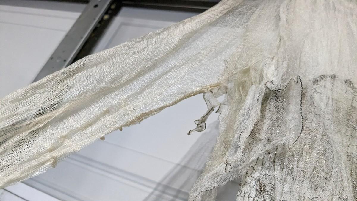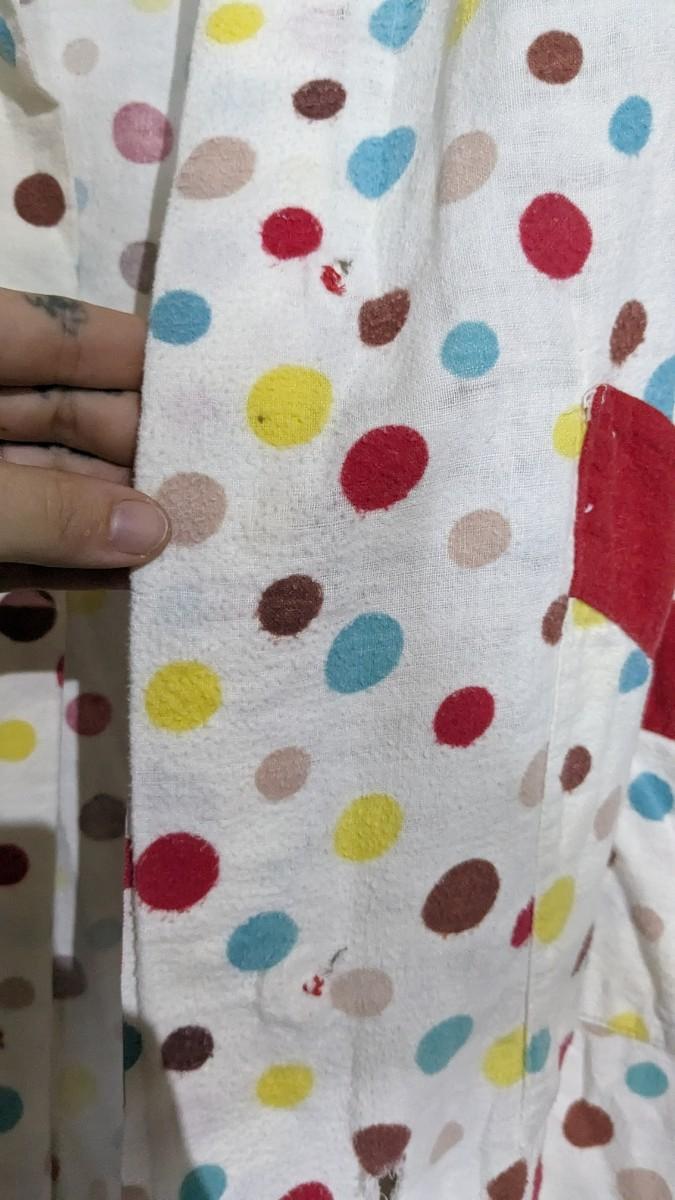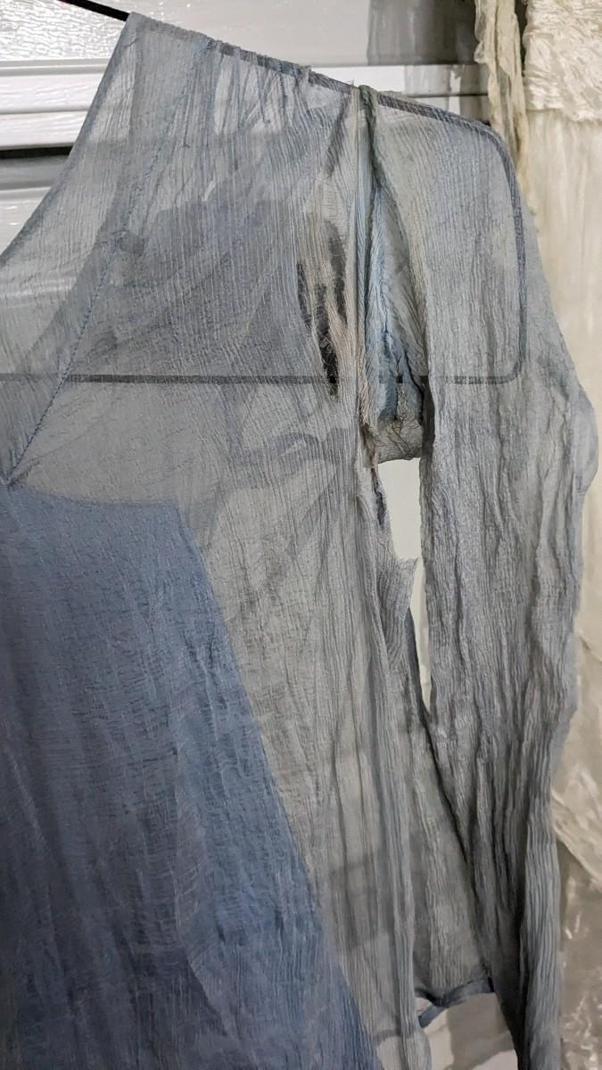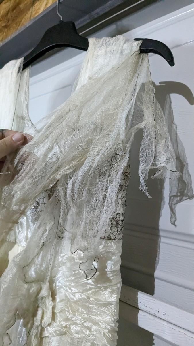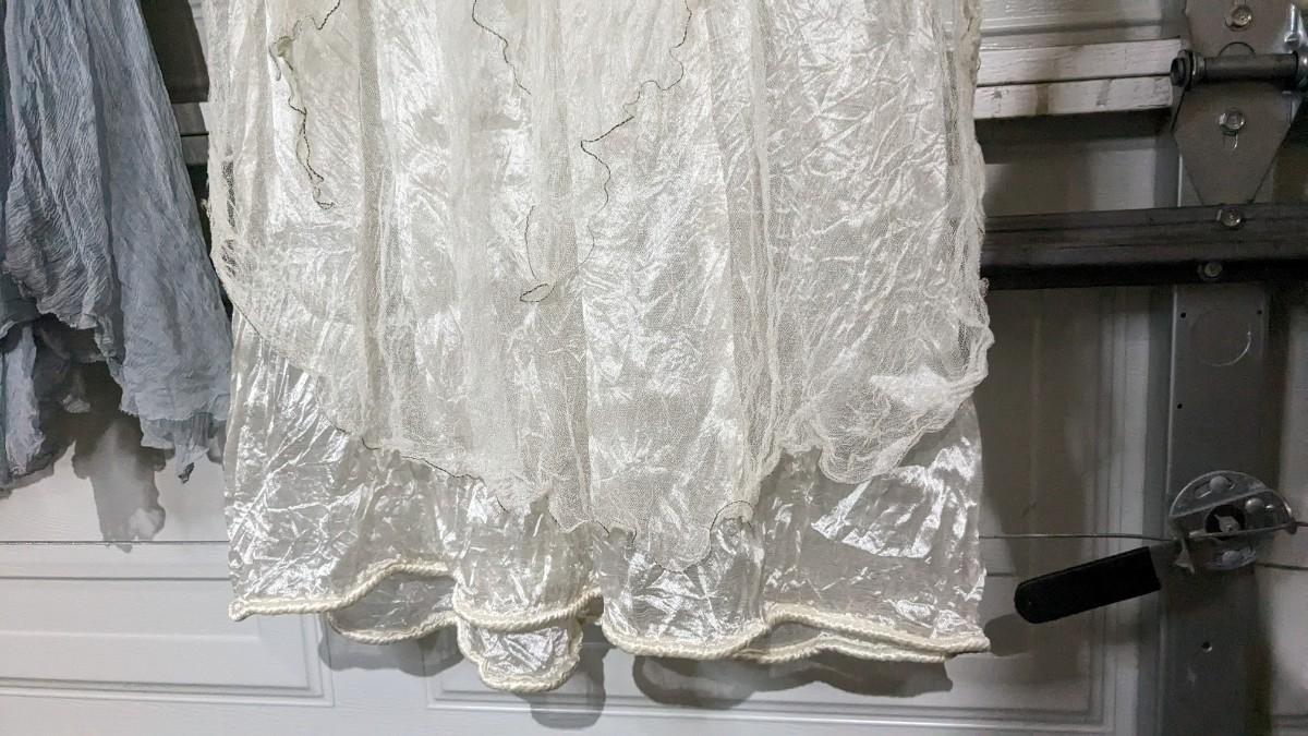 2 bloomers, 2 evening gowns that show significant wear to mesh and underarms, nightgown and housecoat with no buttons, lovely blue dress with sash, muslin full body apron with lovely needlework front, and linen Flax Nett size 42 full body underwear. Sizes best suited for 16-XS with exception to blue dress that is closer to a contemporary girls 10