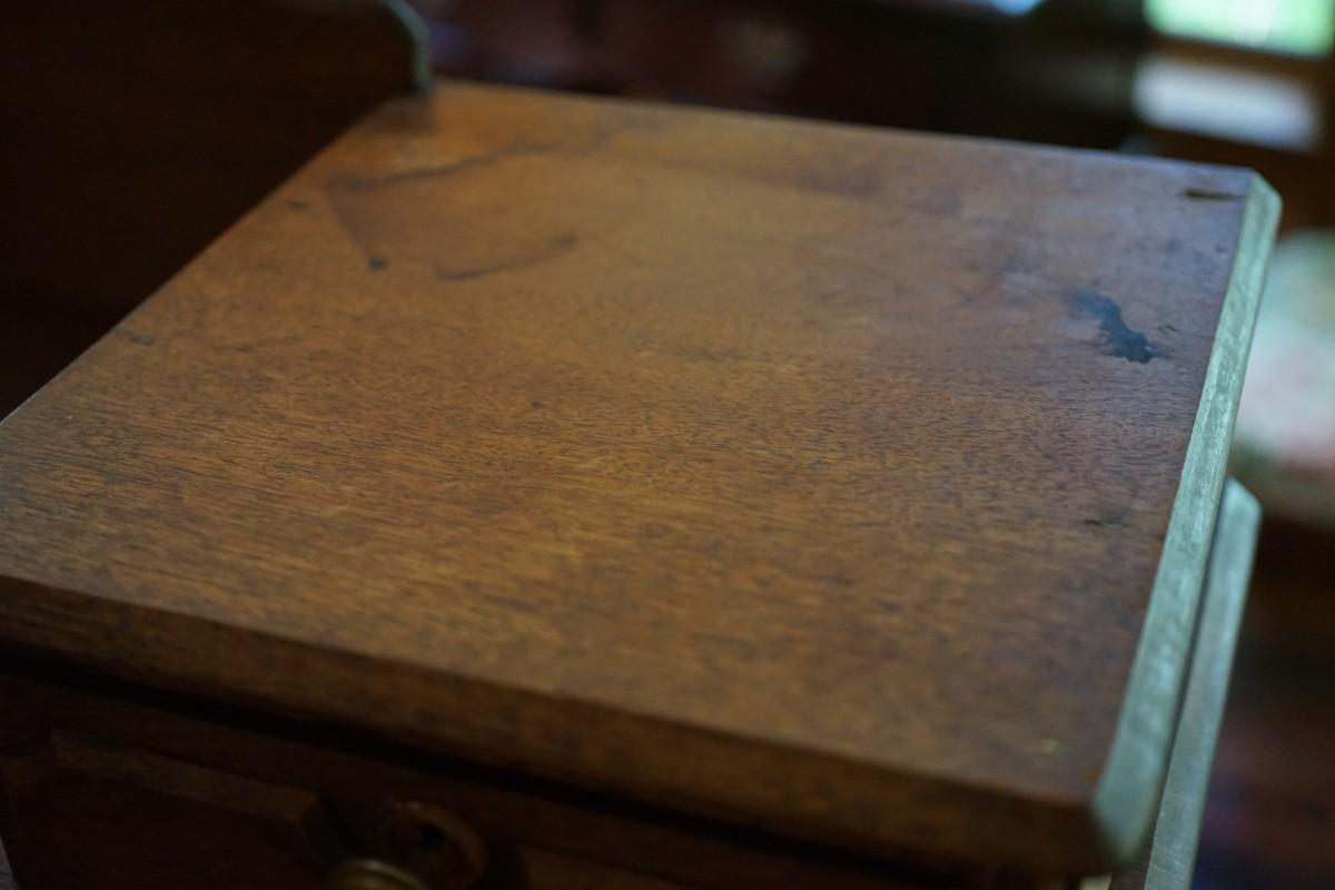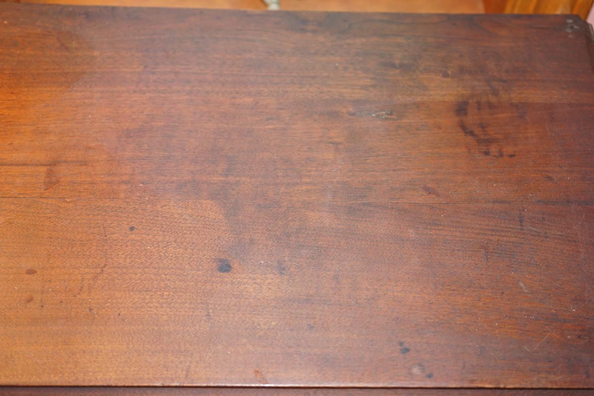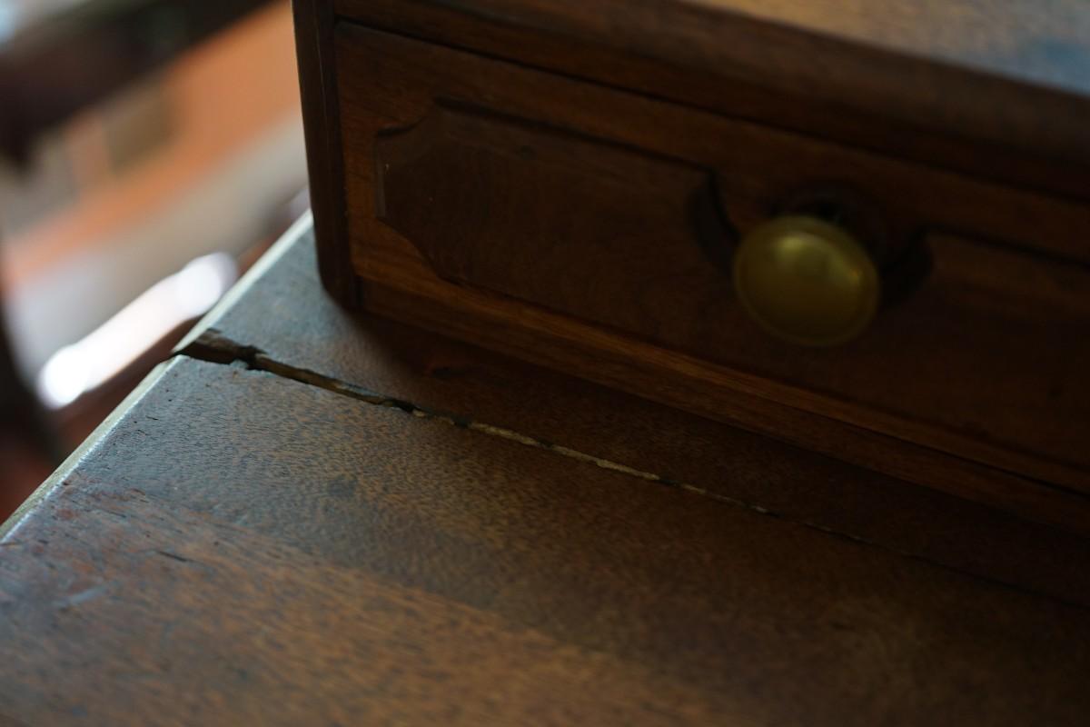 The dresser is in fair to good condition. On the top of one of the hankie drawers there is crack