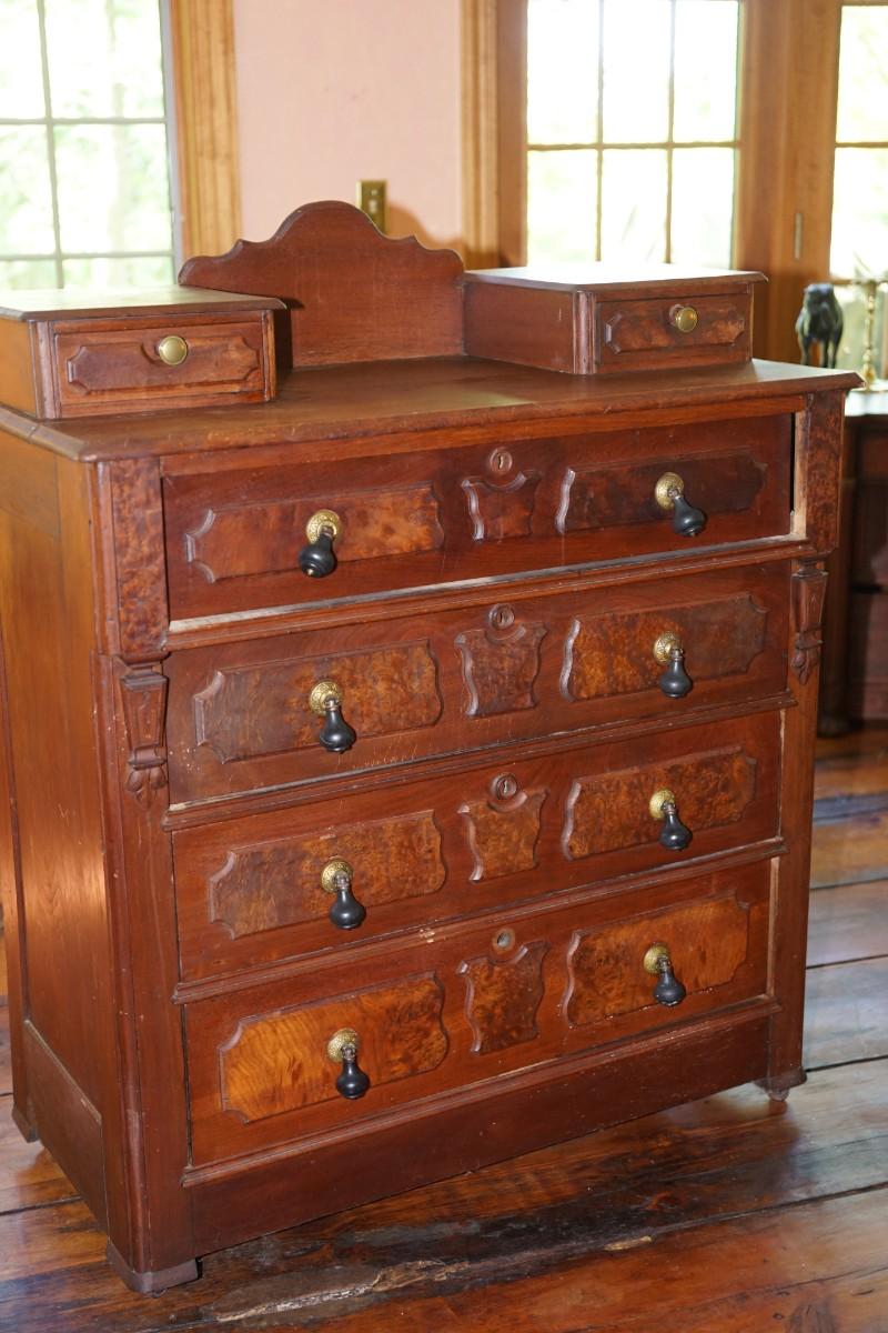antique 1880s four drawer walnut bureau with burled walnut accent on the drawers . original pulls on the drawers of drop with brass back plates, The hankie drawer pulls have been replaced or added. usually the hankie drawers just had key estocheons to lock up jewelry etc.