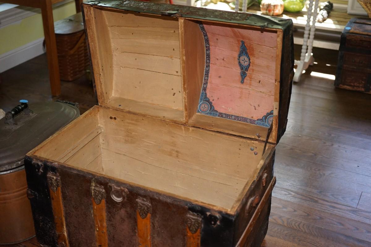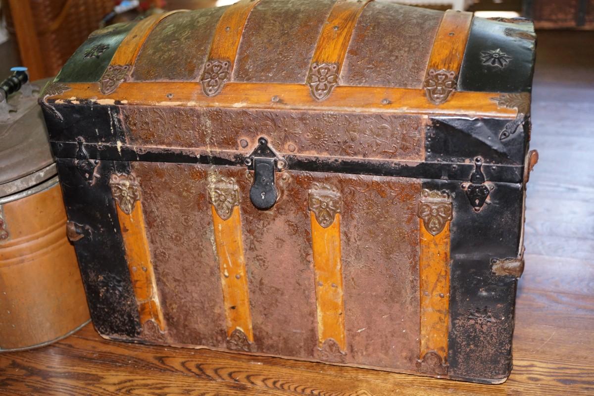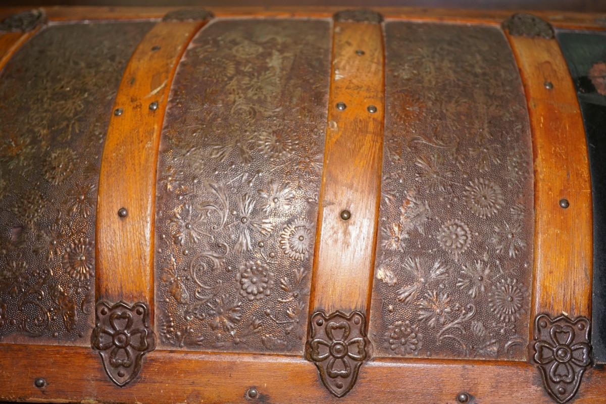 LATE 19TH CENTURY DOME TOP TRUNK W/PRESSED TIN FLORAL PATTERN AND OAK STRAPPING.