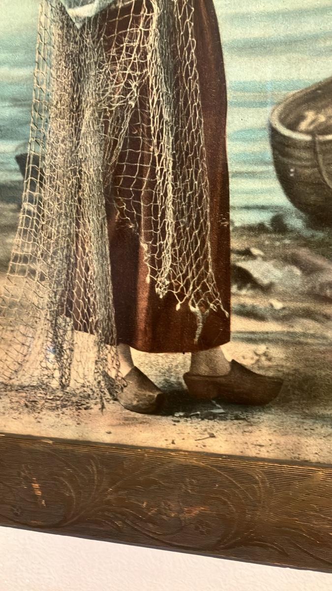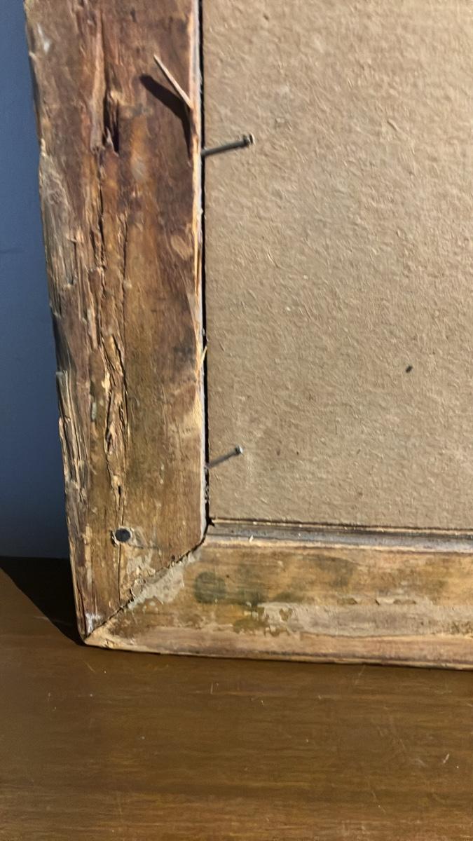 Condition: The print itself is in very good antique condition with no foxing, water stains, or significant damage noted. Colors remain bright and unfaded. There is some natural waviness to the paper (visible in photos), common in prints of this age due to historical mounting and environmental exposure. The frame shows minor wear commensurate with age, including light rubbing to the gilding and slight imperfections, but remains structurally sound and highly decorative.