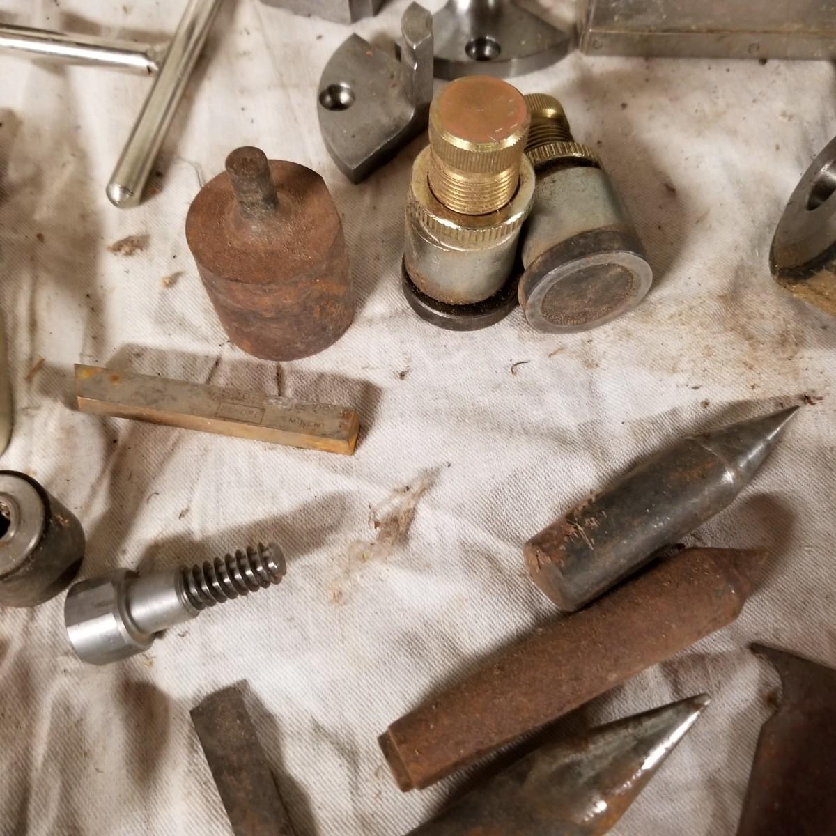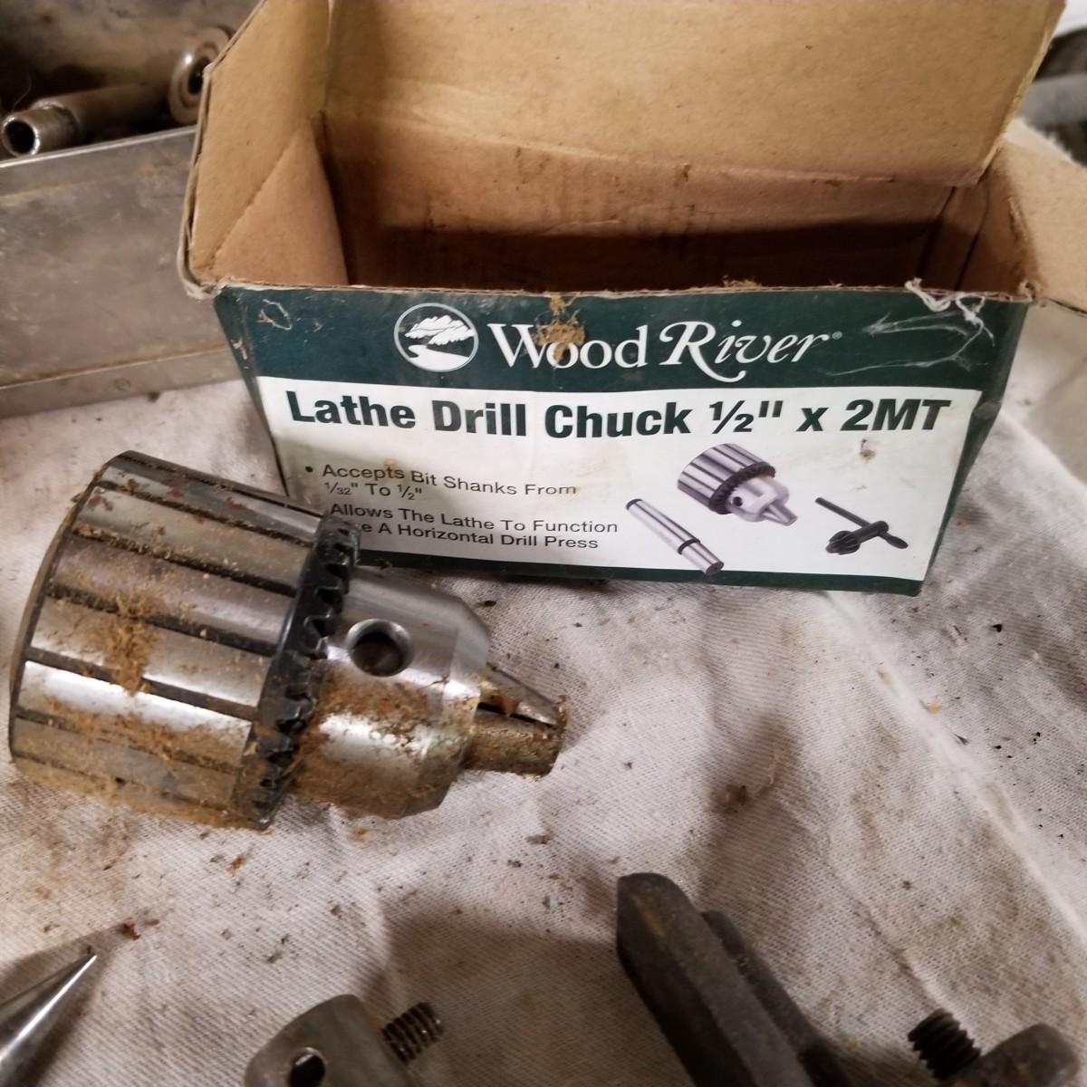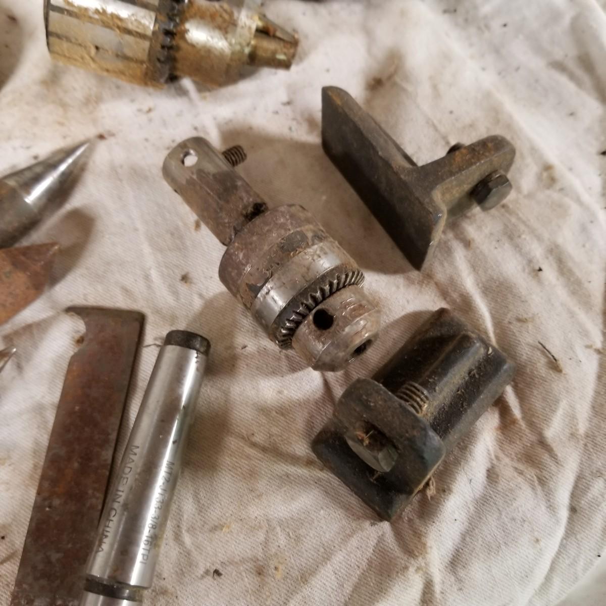 Various pieces to use with a lathe or drill press.   Drill chucks, followers , tool rests, pins, cutters and more.  Most items used, need some cleaning.  Local pickup only.