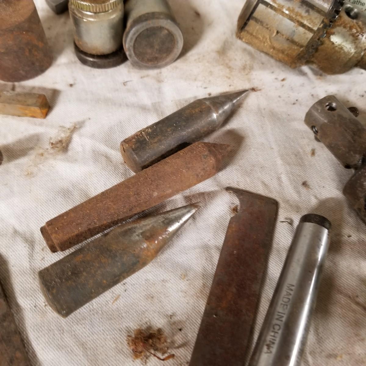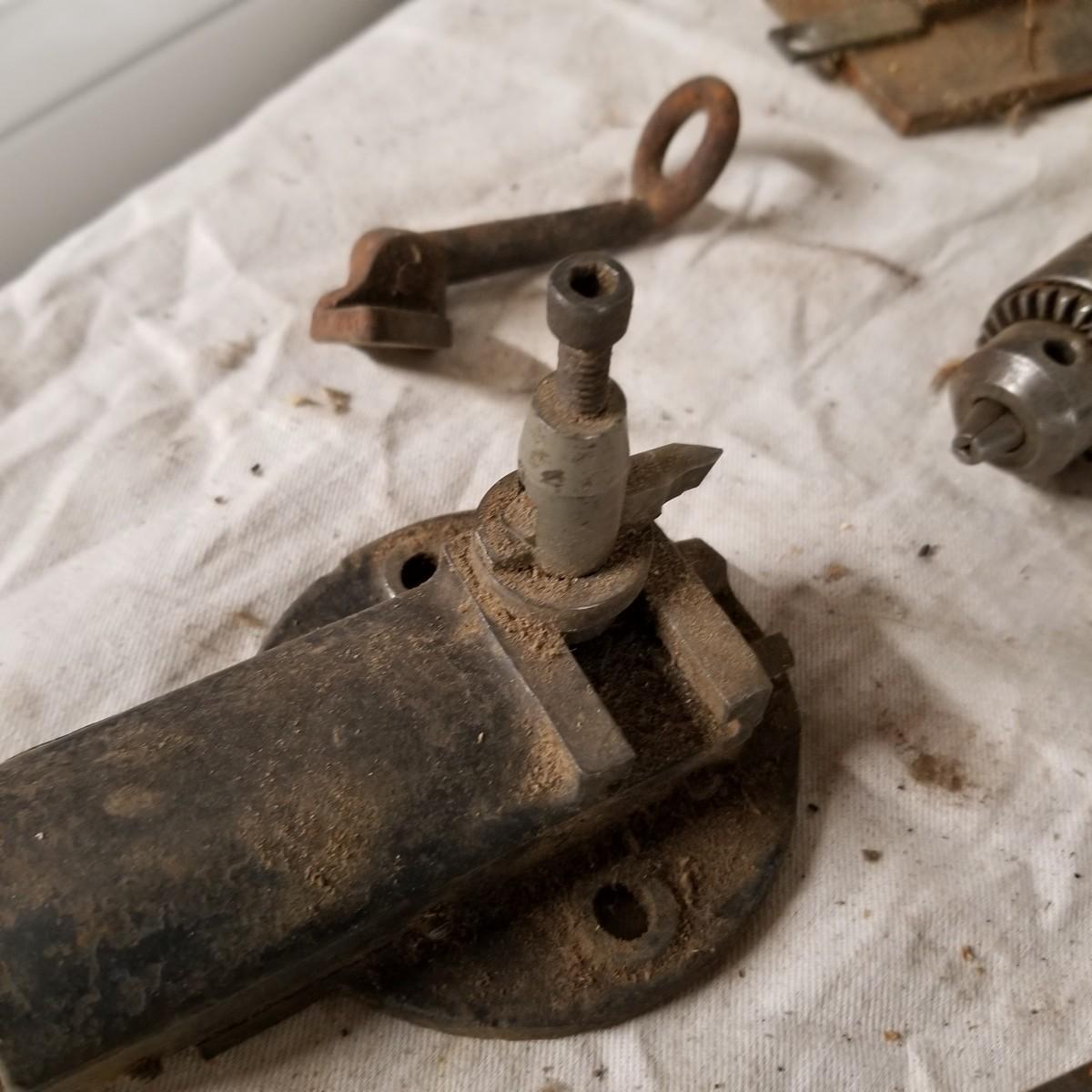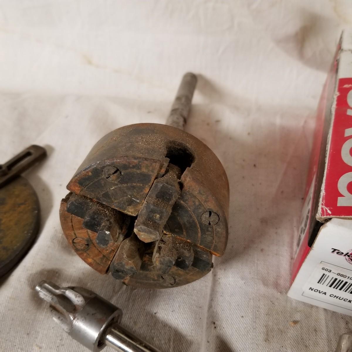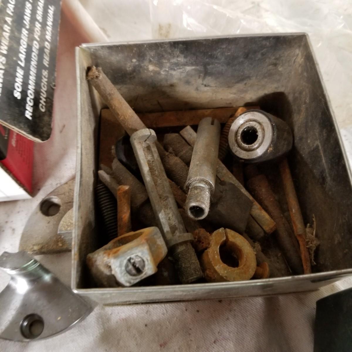 Various pieces to use with a lathe or drill press.   Drill chucks, followers , tool rests, pins, cutters and more.  Most items used, need some cleaning.  Local pickup only.