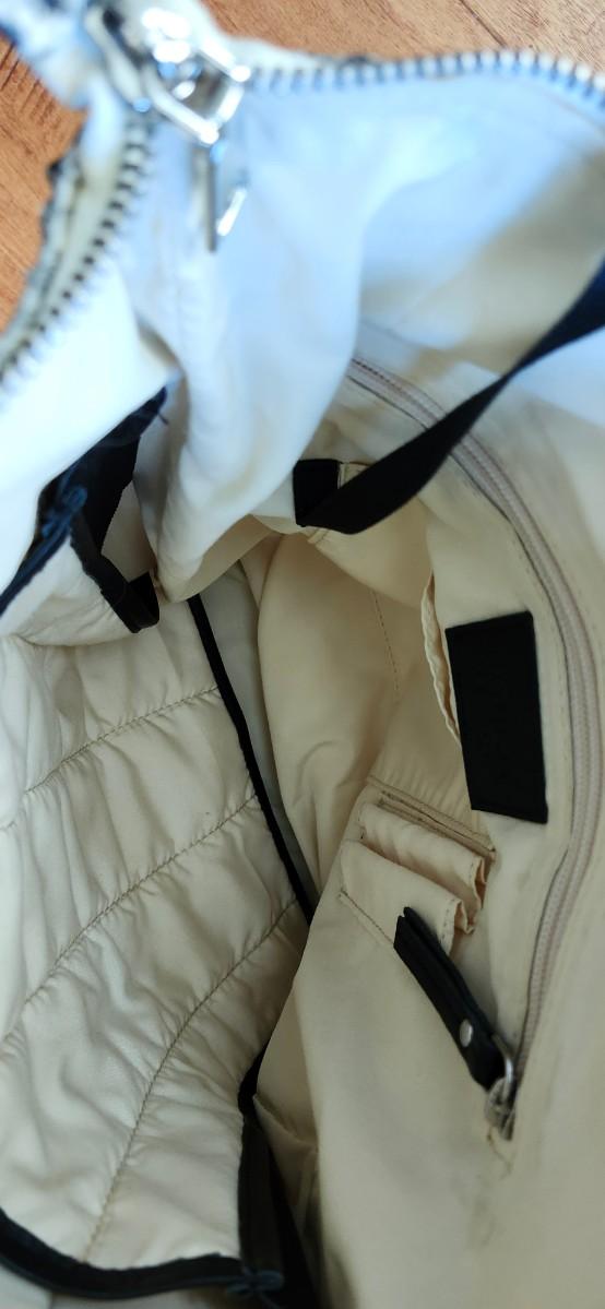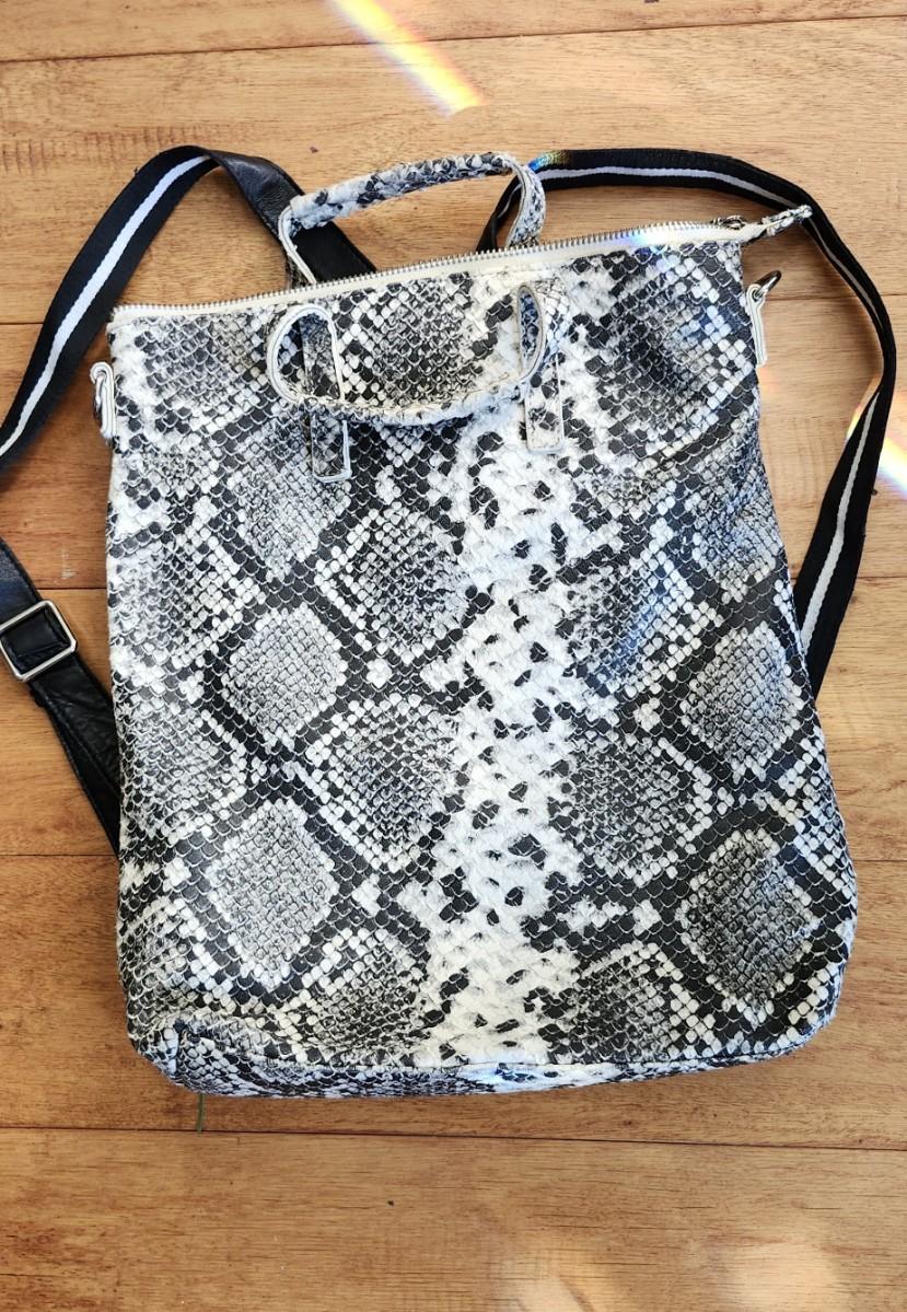 Snakeprint leather, color = python. Wear it 4 ways, shoulder, crossbody, backpack, handheld.