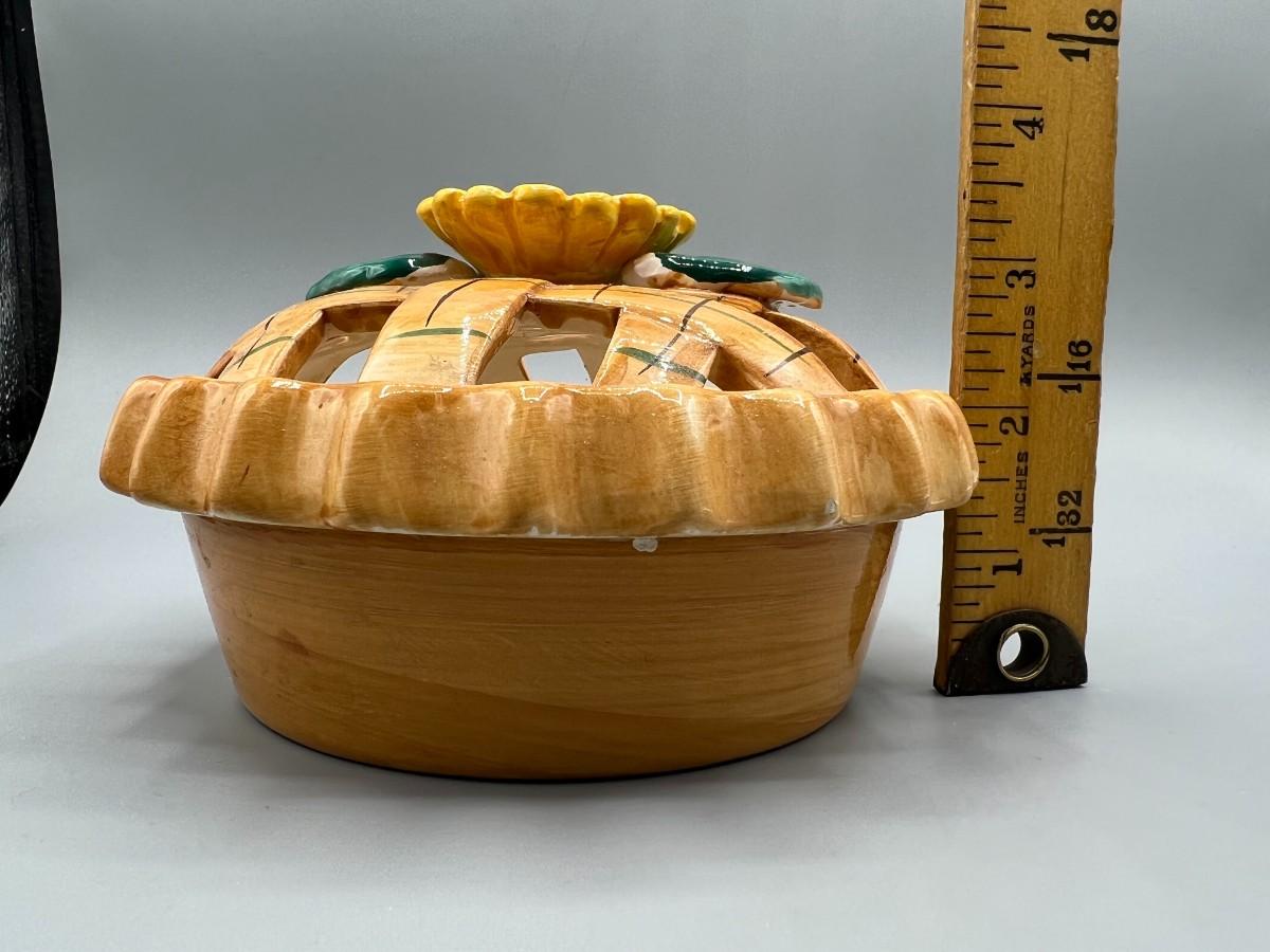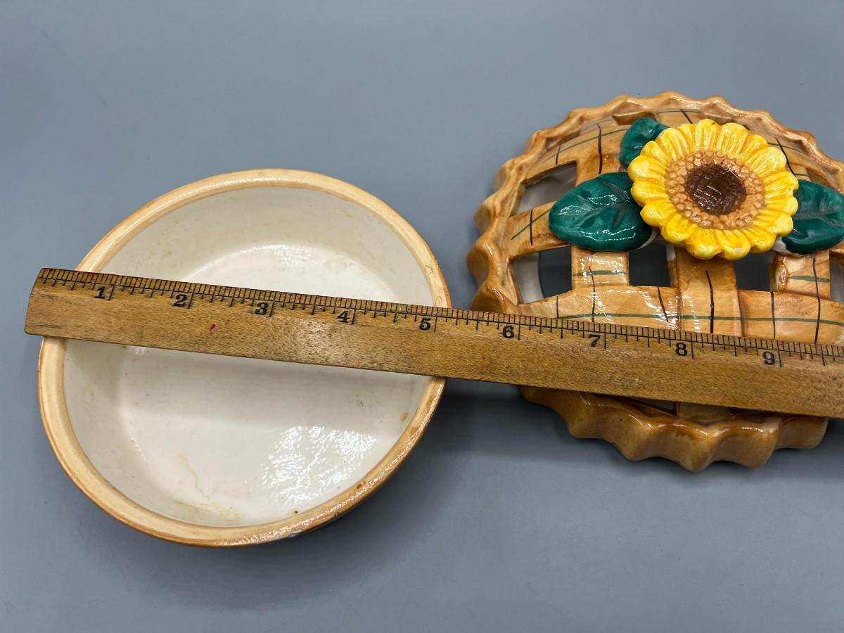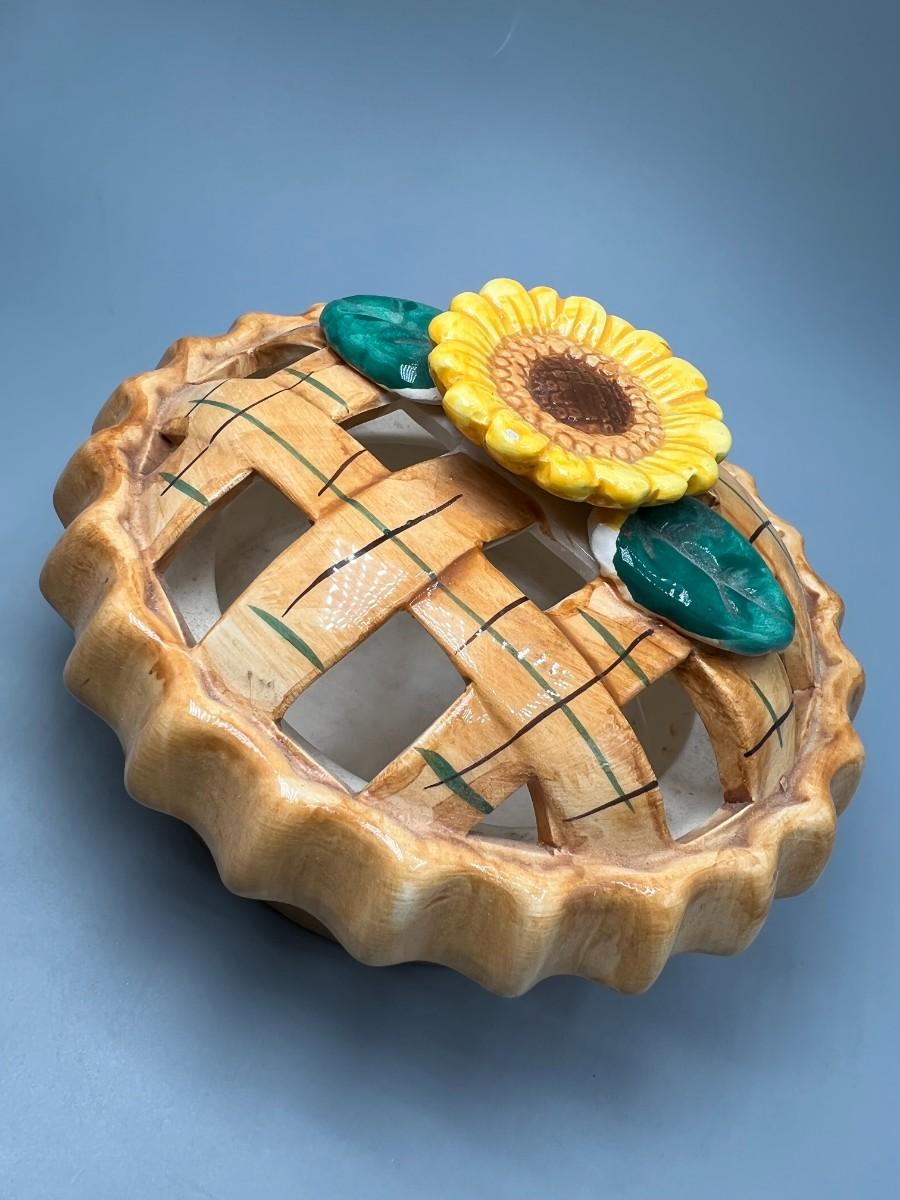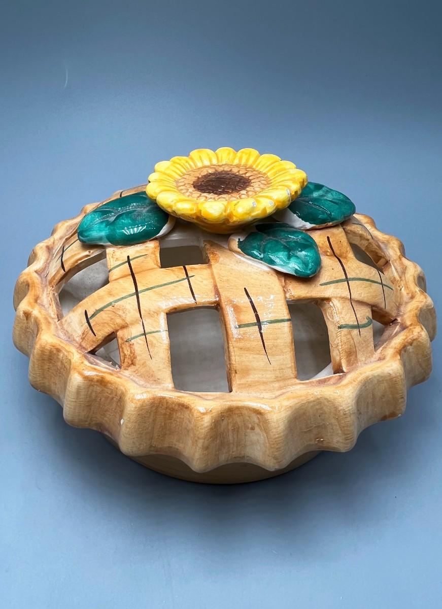 Lattice Pie Ceramic Dish with Sunflower on Top. About 5" diameter. Great for display or as a trinket dish. Small chip along the edge.