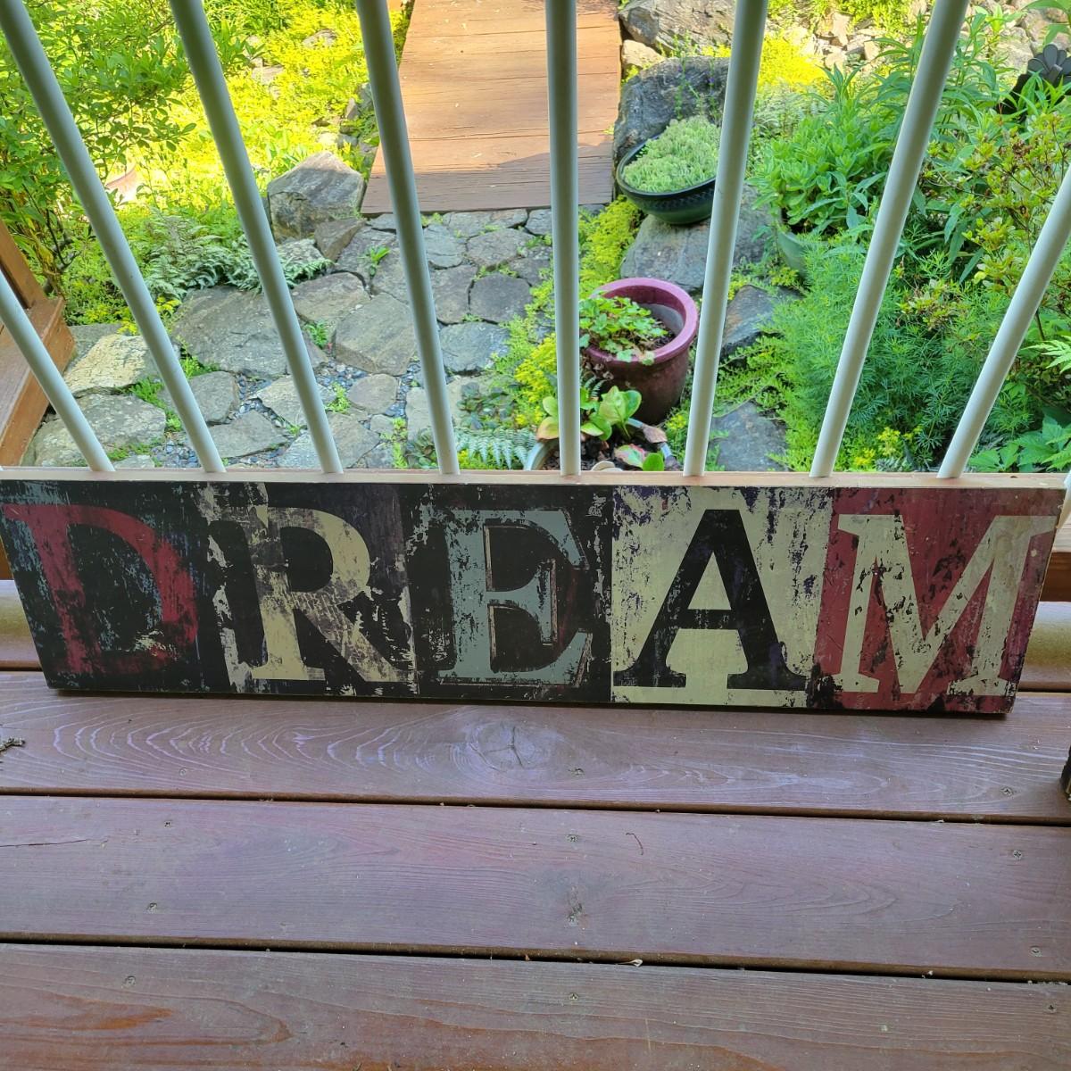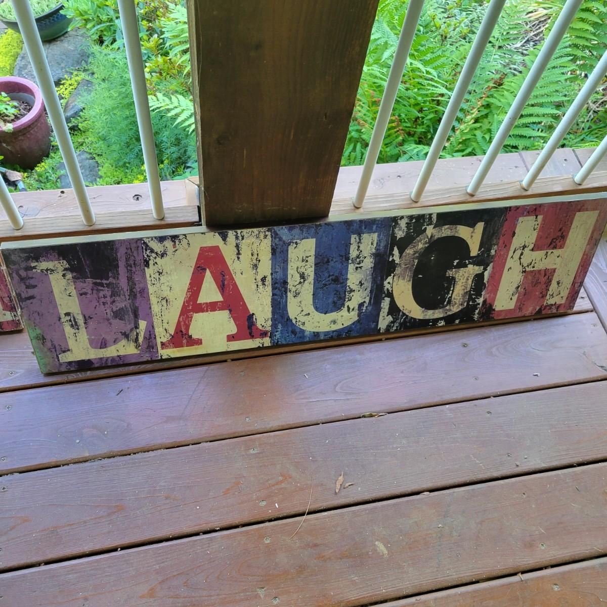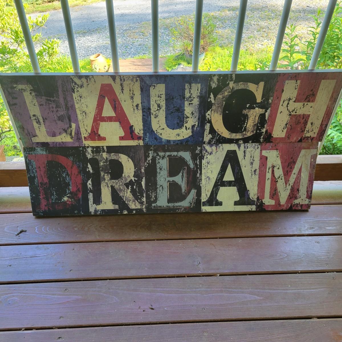 Two pieces of wall art that say Laugh and Dream. These pieces are printed on engineered wood to have the look of peeling paint. They each measure approximately 39.5" x 1" x 10". Shipping available