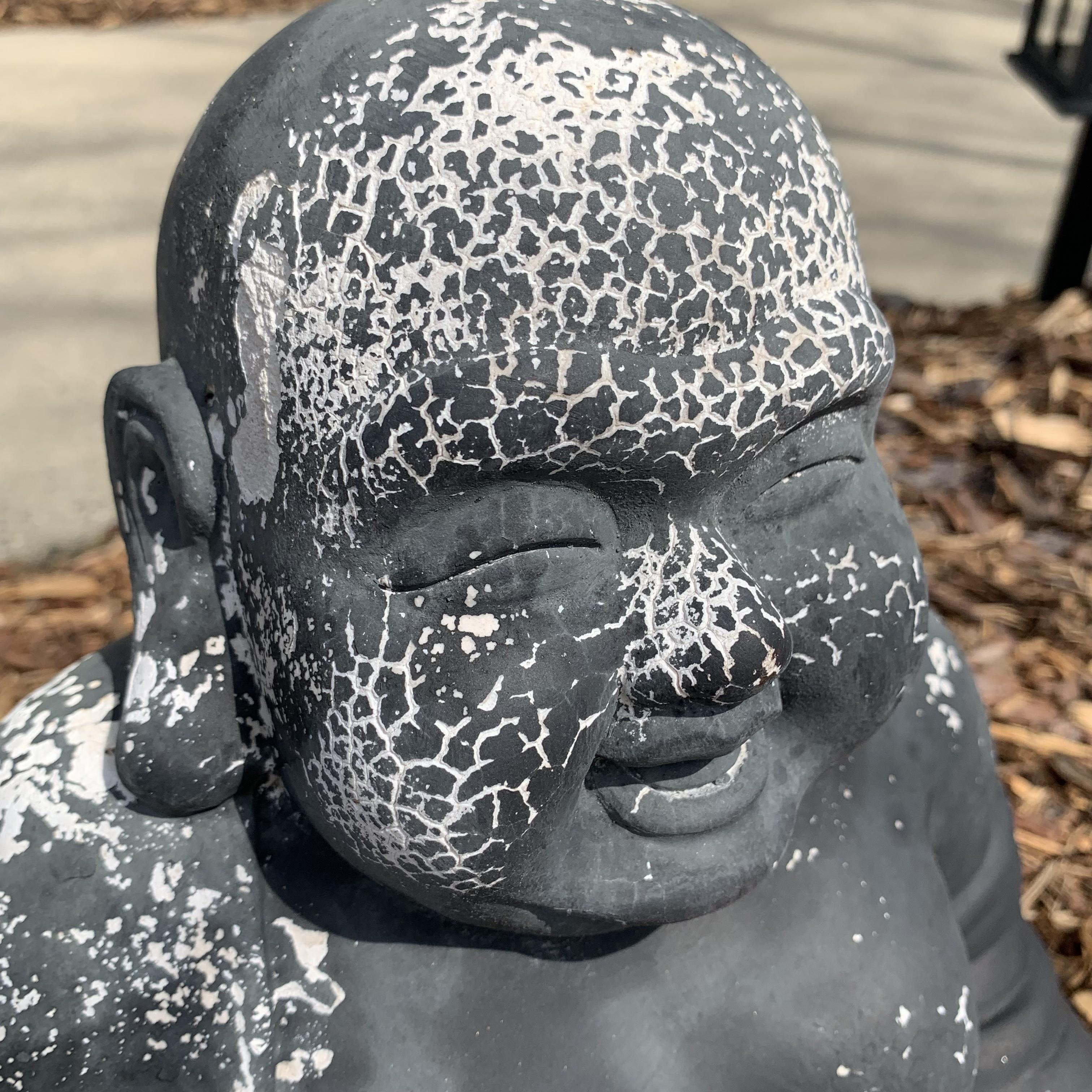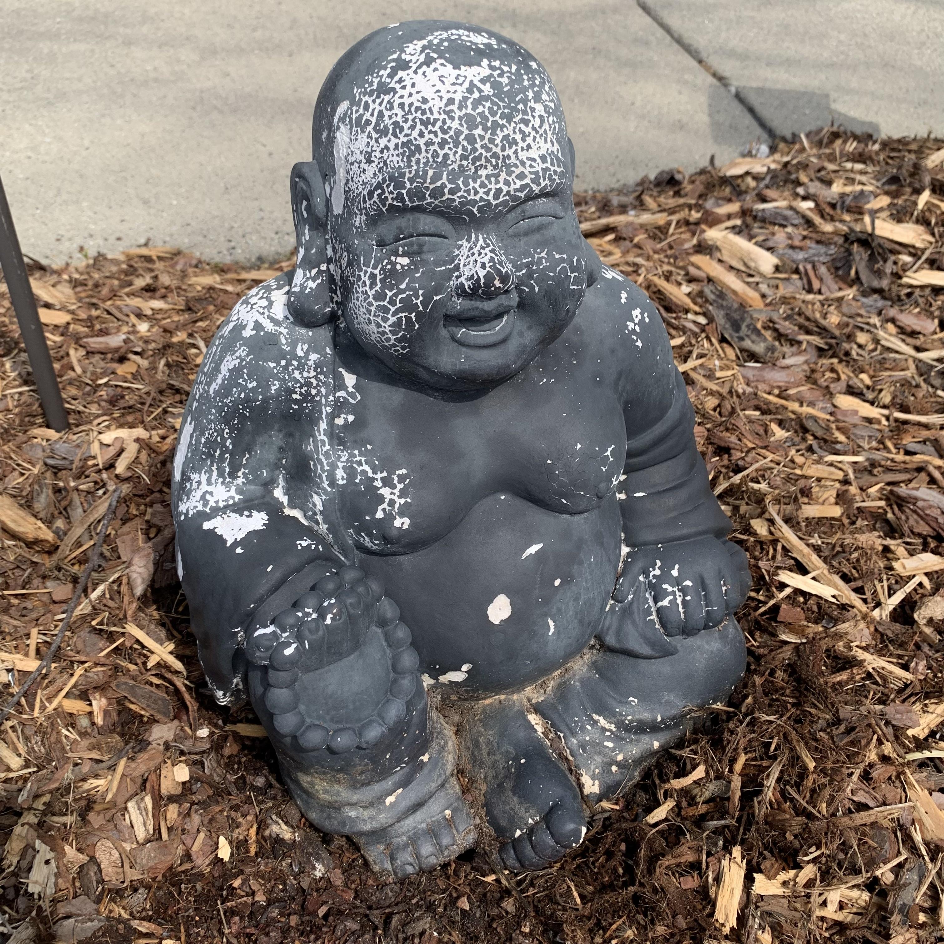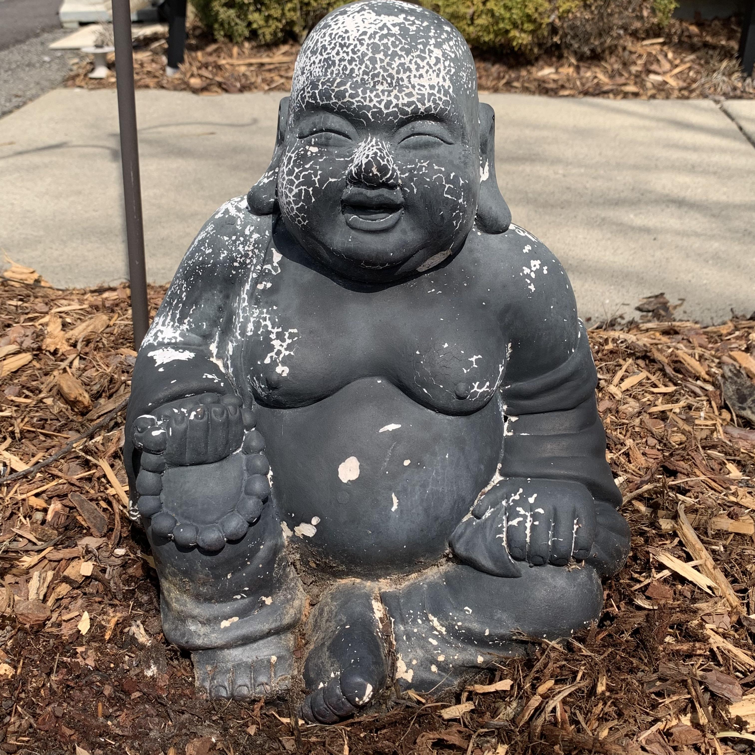 Laughing Buddha plaster garden statue. Shows a bit of crackling and wear on its gray exterior. It measures approximately 11” x 9” x 12”H. It is fairly lightweight.