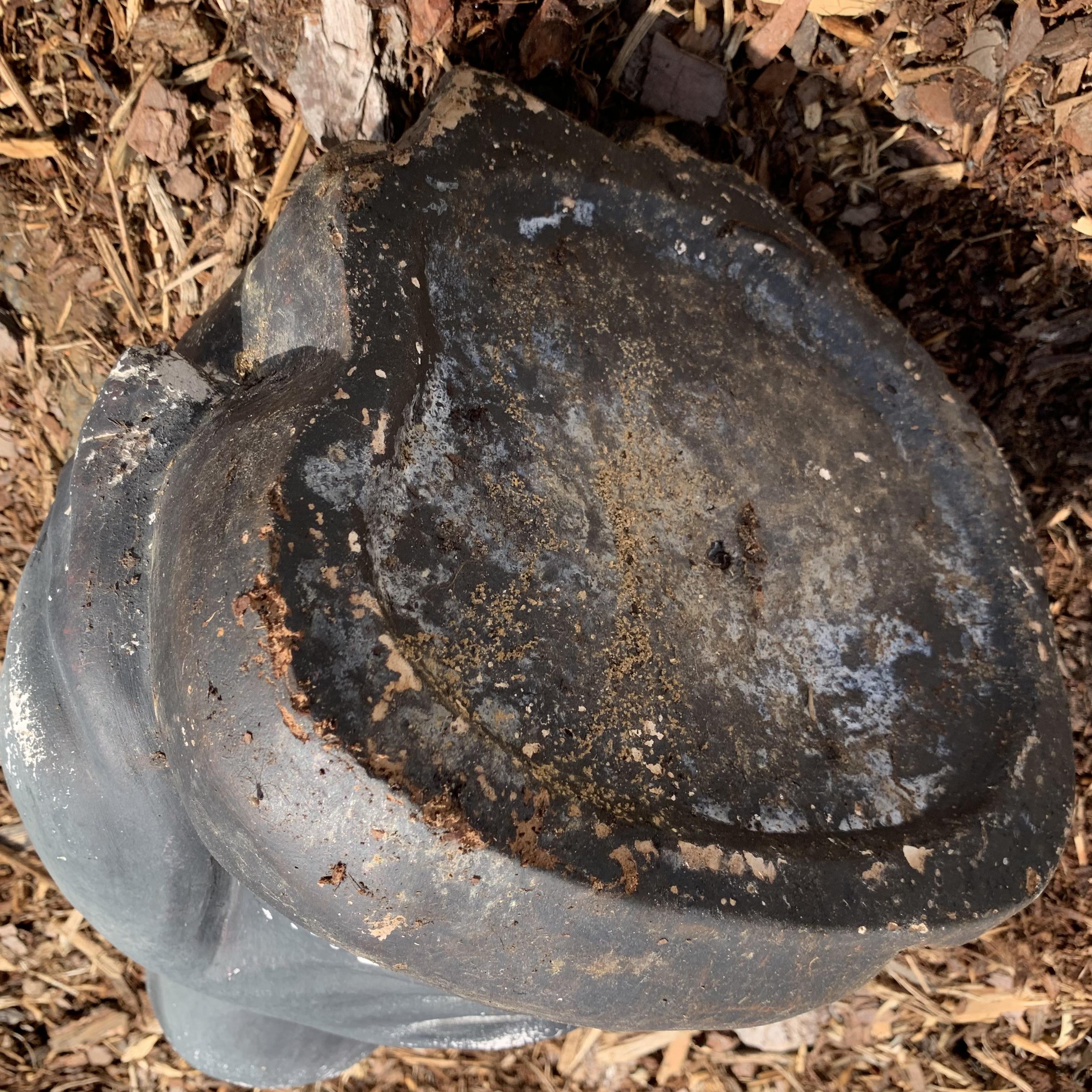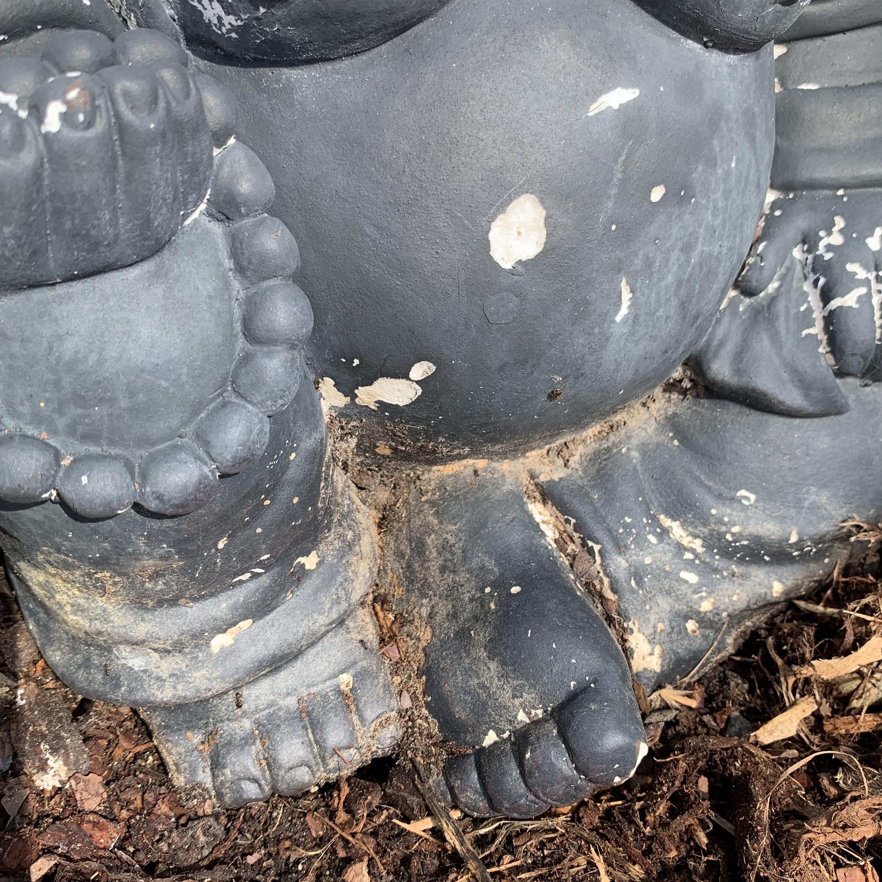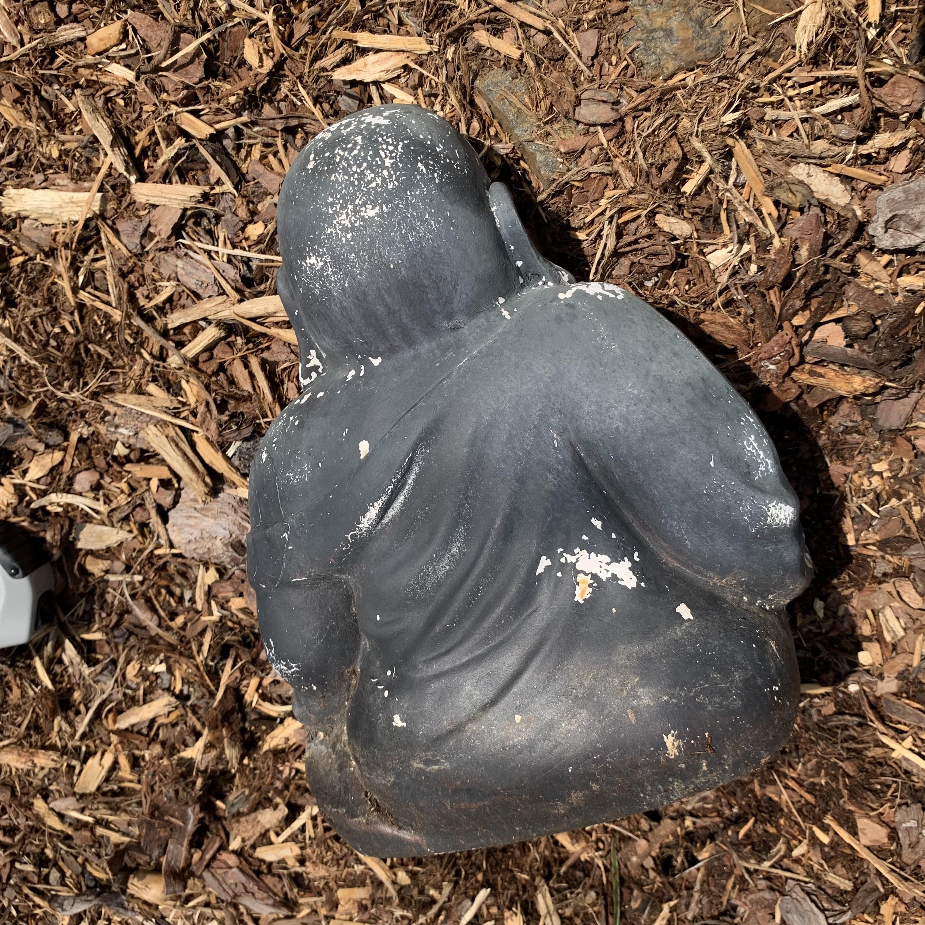 Laughing Buddha plaster garden statue. Shows a bit of crackling and wear on its gray exterior. It measures approximately 11” x 9” x 12”H. It is fairly lightweight.
