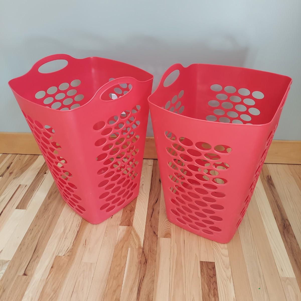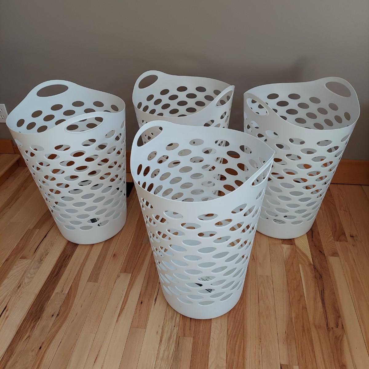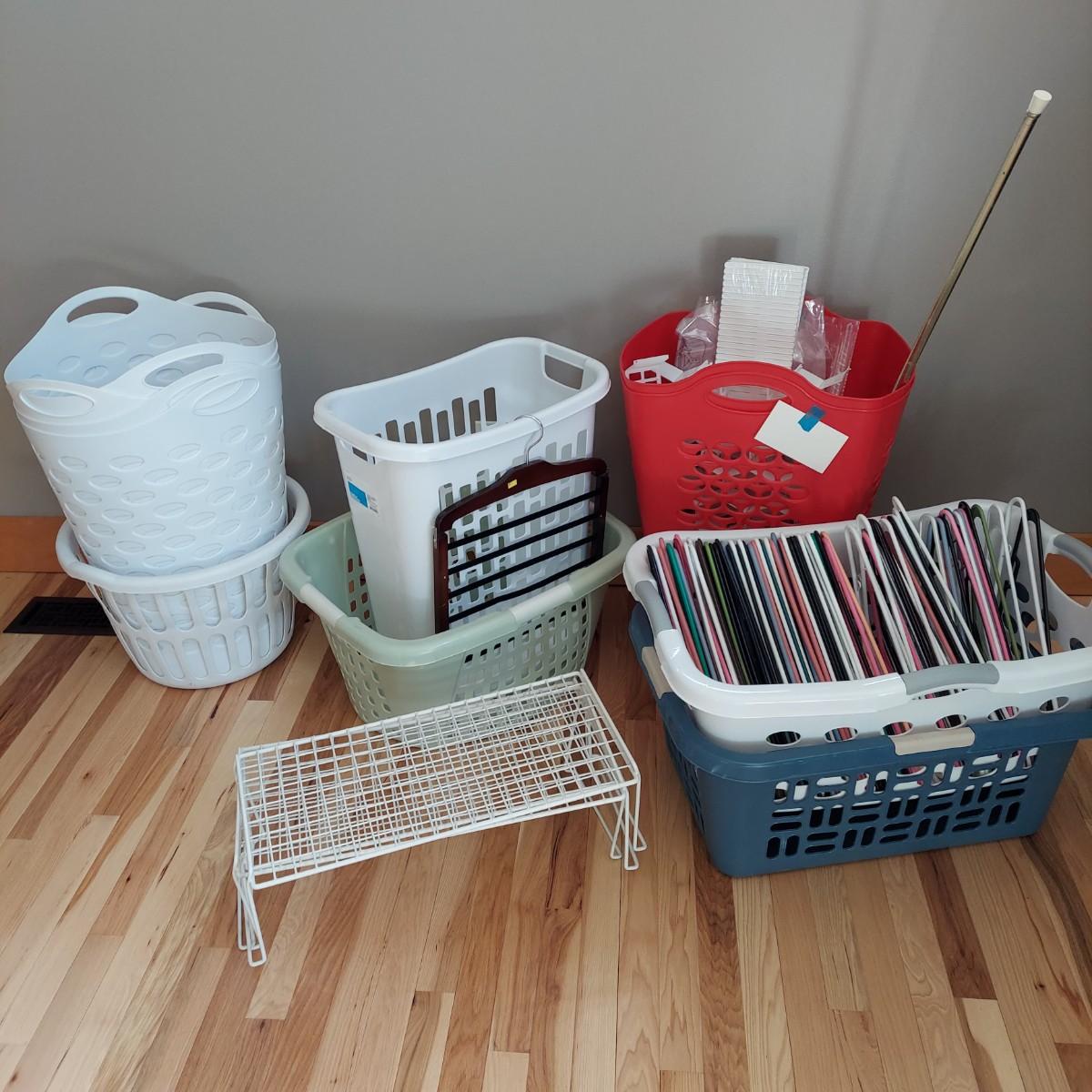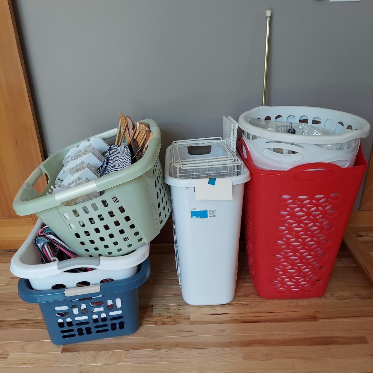Large lot of laundry and closet organizing items that includes four laundry baskets, eight laundry hampers, three space saver vacuum bags, a fabric depiller and assorted hangers and organizing systems. Four plastic coated wire shelves that are stackable. Each shelf is approximately 24 x 10 x 7"H. The depiller is battery operated and powered on with the current batteries. There is a small melted mark on one side that does not interfere with its functioning. There are quite a few larger or bulky items in this lot. Local Pickup Only.