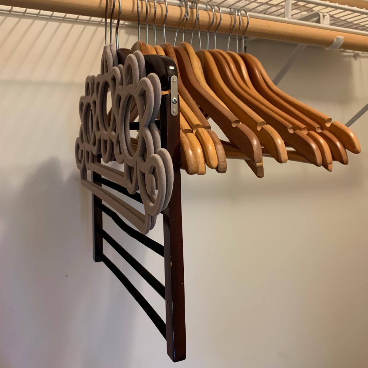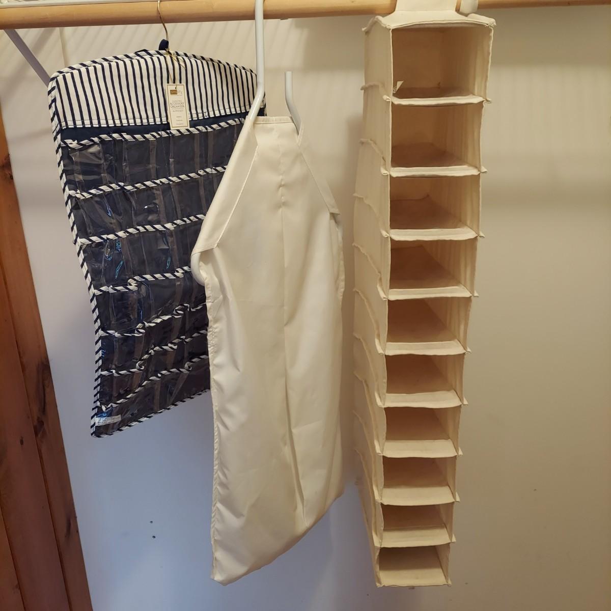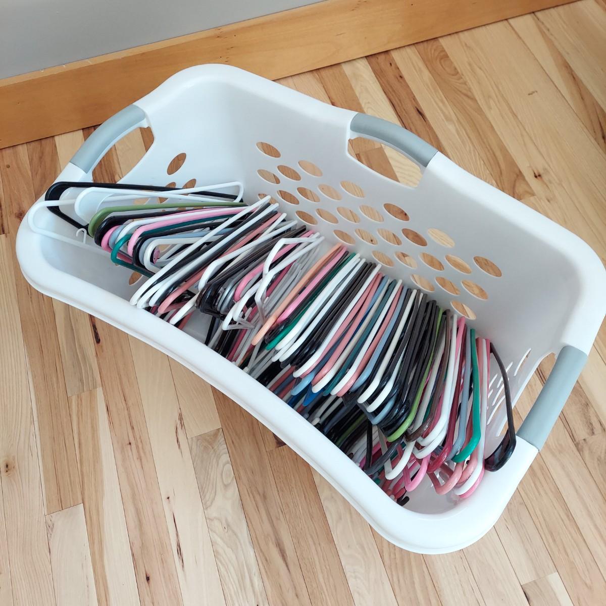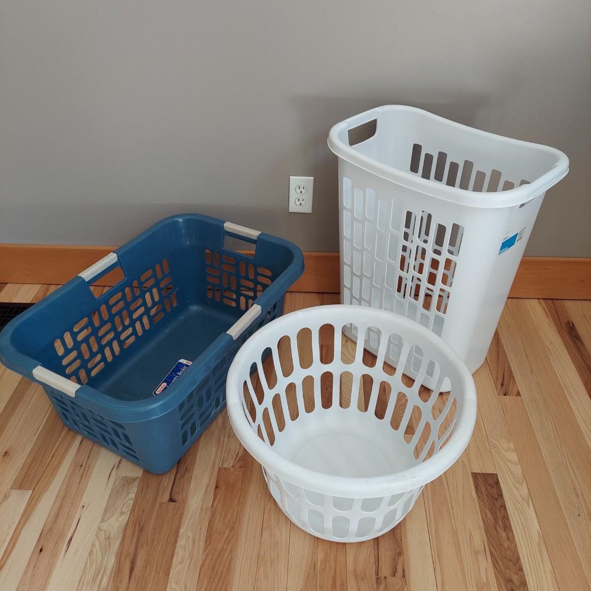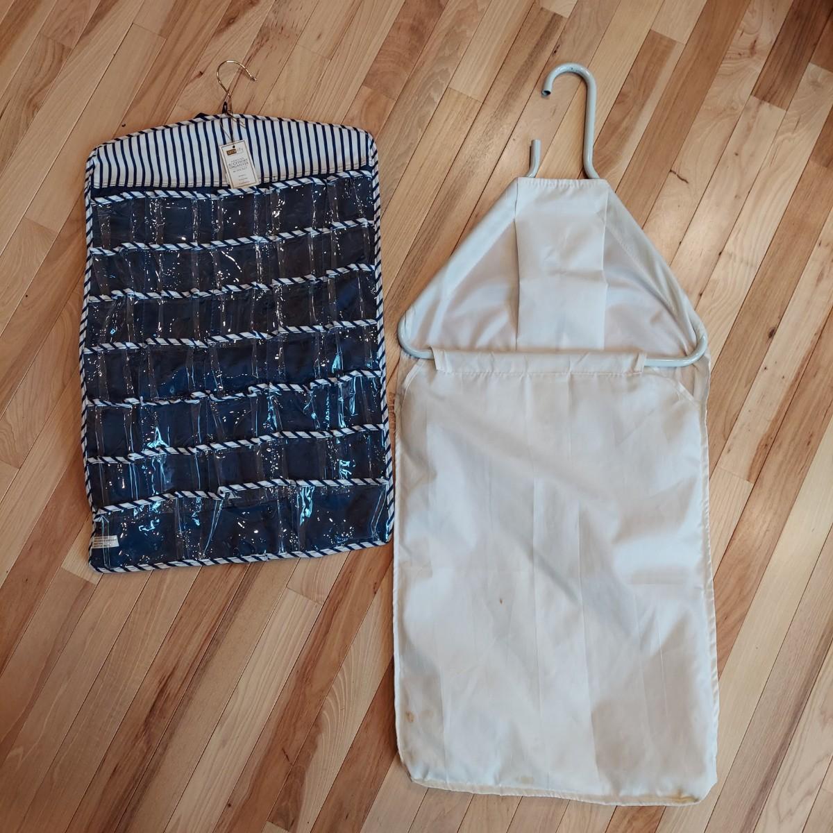 Large lot of laundry and closet organizing items that includes four laundry baskets, eight laundry hampers, three space saver vacuum bags, a fabric depiller and assorted hangers and organizing systems. Four plastic coated wire shelves that are stackable. Each shelf is approximately 24 x 10 x 7"H. The depiller is battery operated and powered on with the current batteries. There is a small melted mark on one side that does not interfere with its functioning. There are quite a few larger or bulky items in this lot. Local Pickup Only.