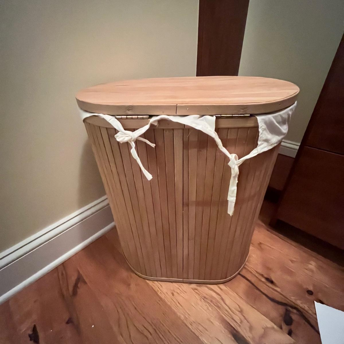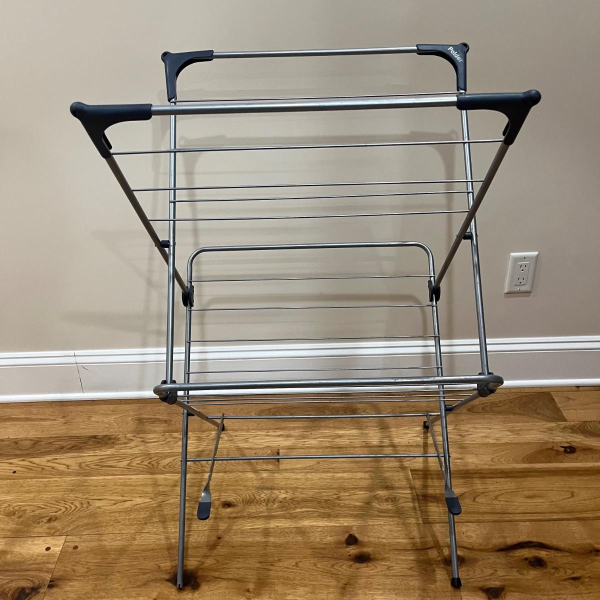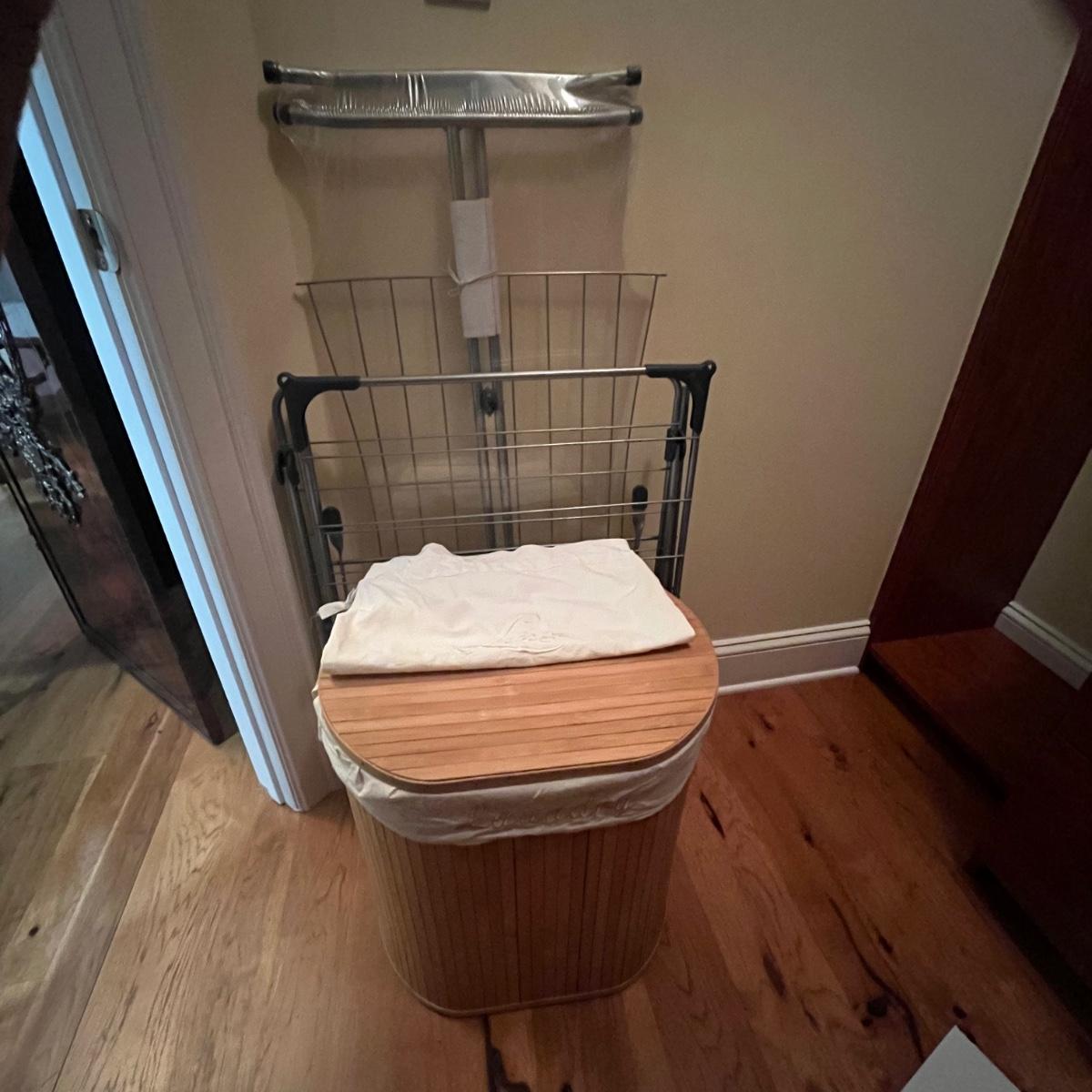 Lot includes a wooden laundry basket with a removable canvas liner. Also includes two drying racks with one still sealed in plastic. Basket measures 18” x 14” x 20.5”H.