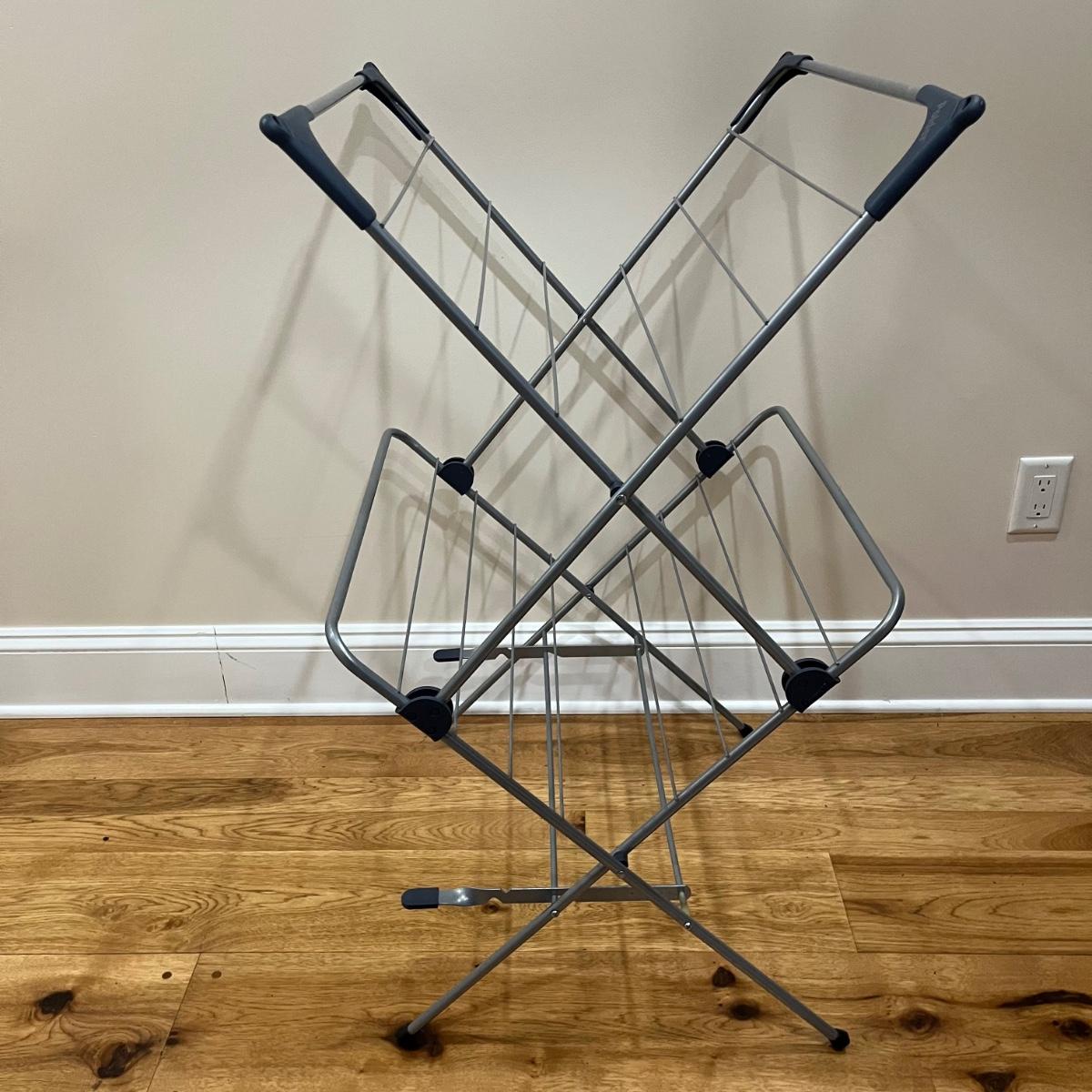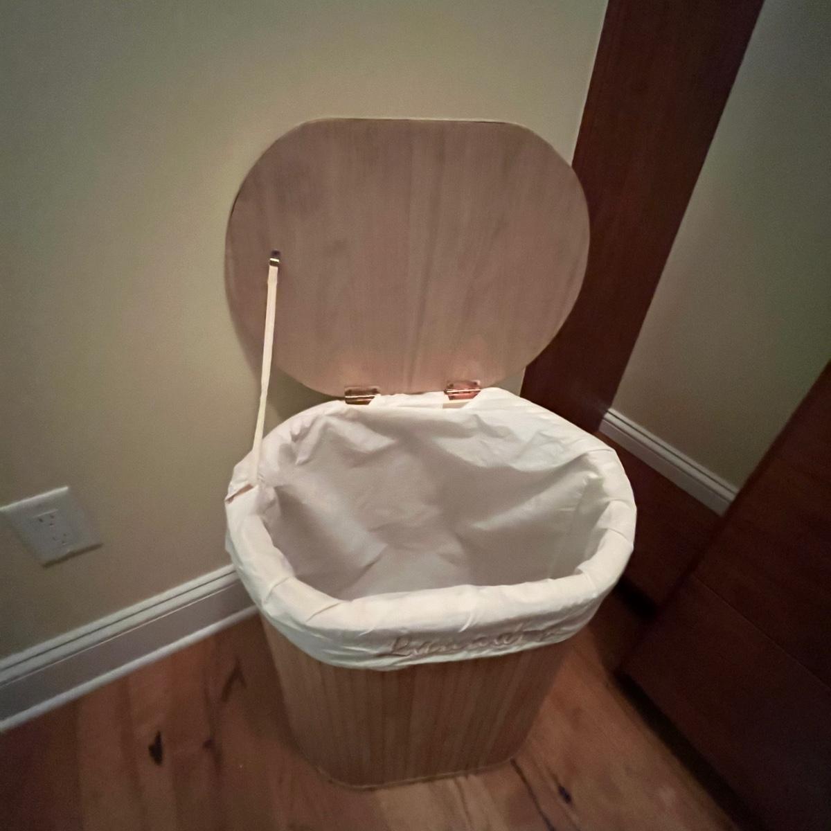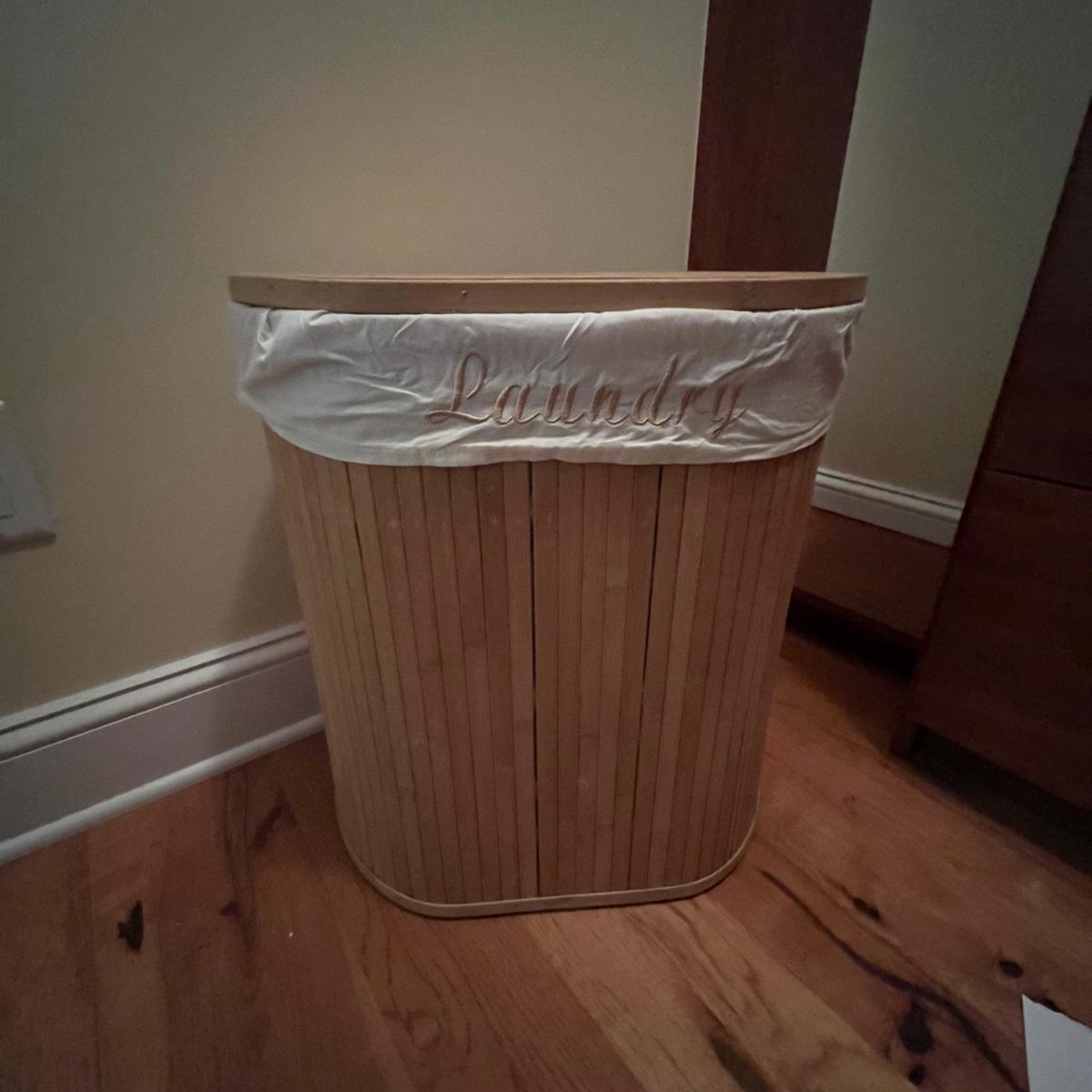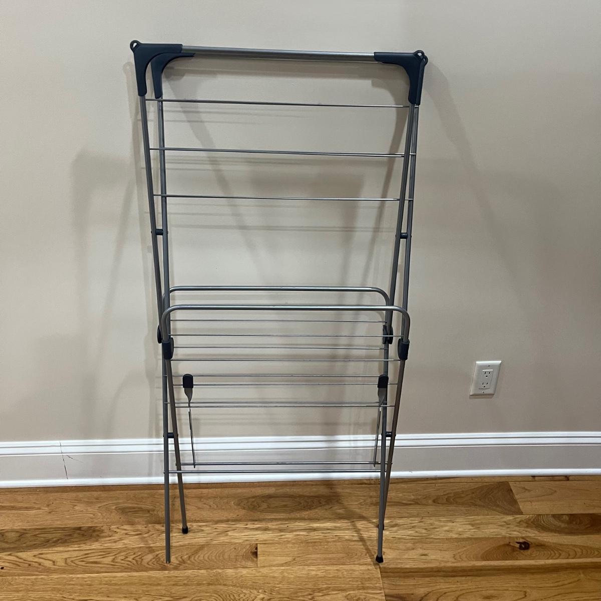 Lot includes a wooden laundry basket with a removable canvas liner. Also includes two drying racks with one still sealed in plastic. Basket measures 18” x 14” x 20.5”H.