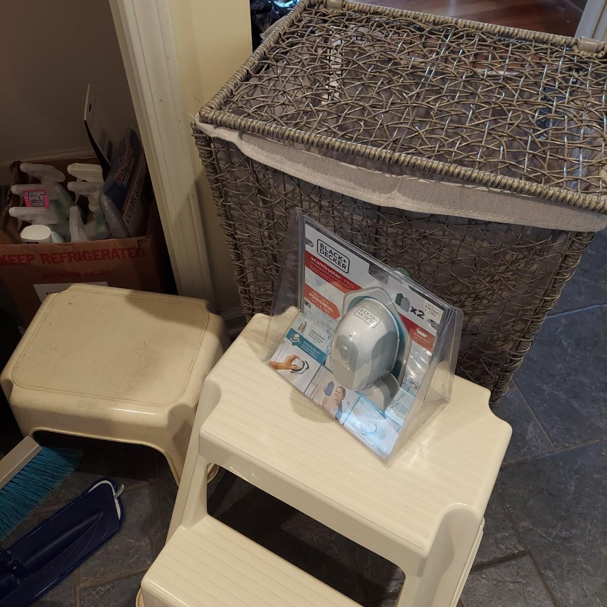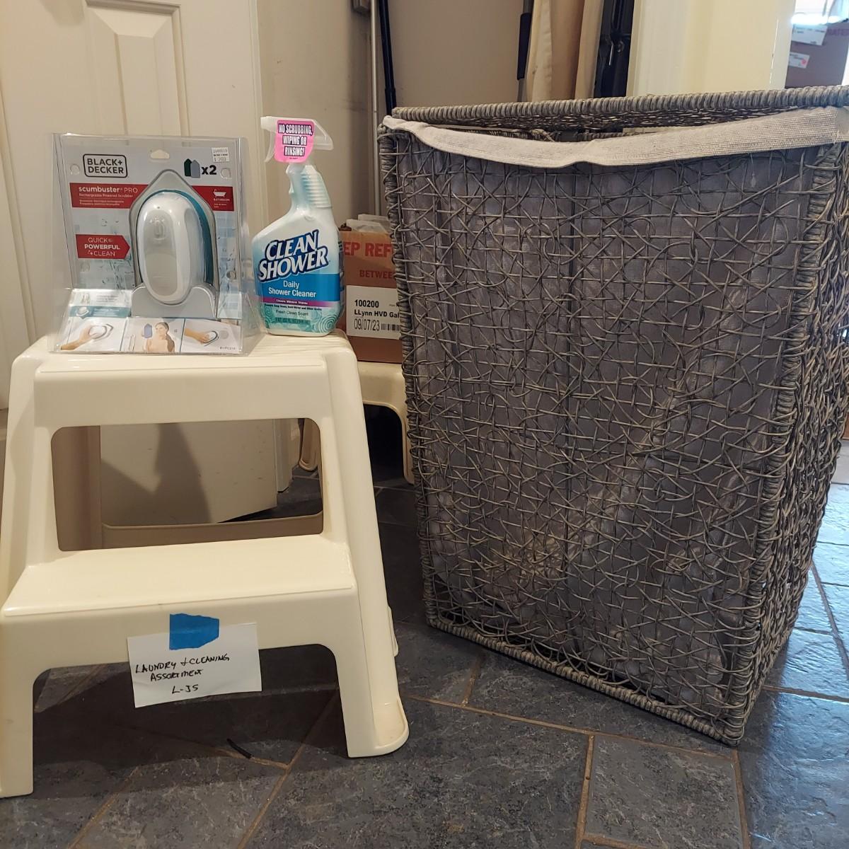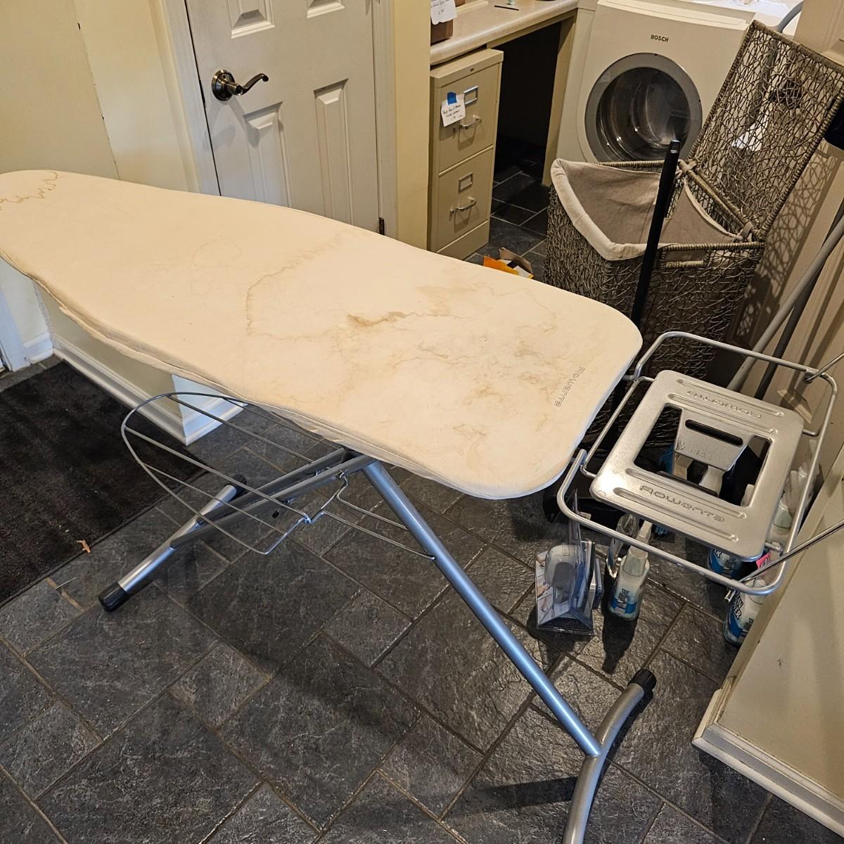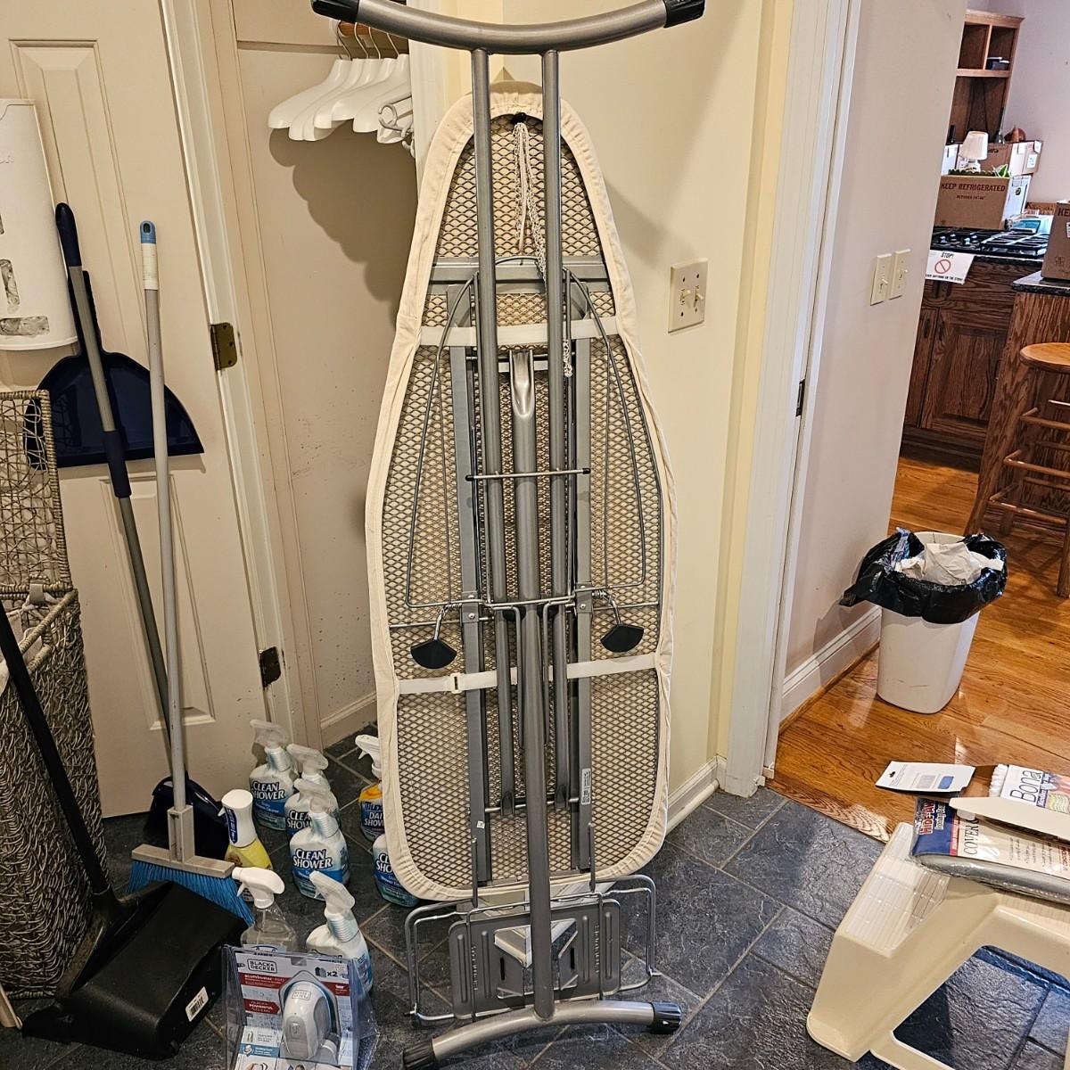 Cleaners, brooms, laundry hamper, ironing board, more. Bottles of shower clean spray, Lysol, Swiffer dusters, broom/dustpan combo. Laundry hamper is 20" x 15" x 27"H, has flip lid. Rowenta ironing board is 19" x 65" x up to 38"H. Cover spotted. Includes assorted hangers and two plastic step stools. See photos for details. Local pickup only.