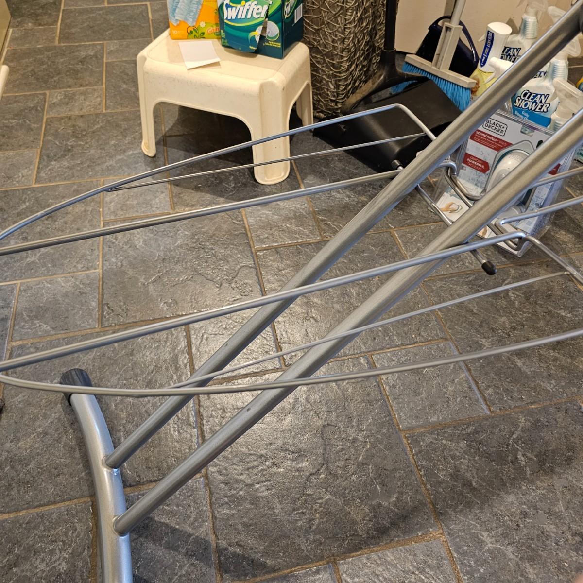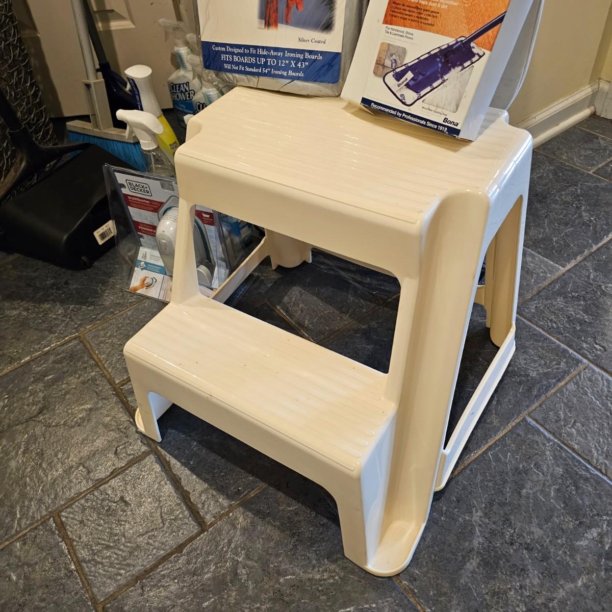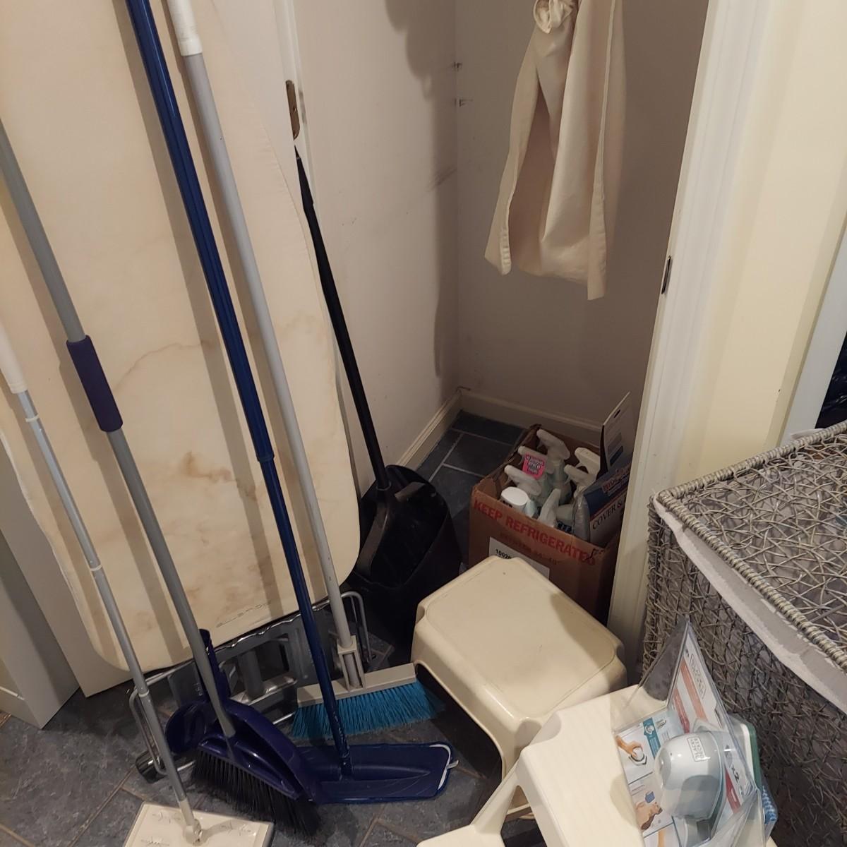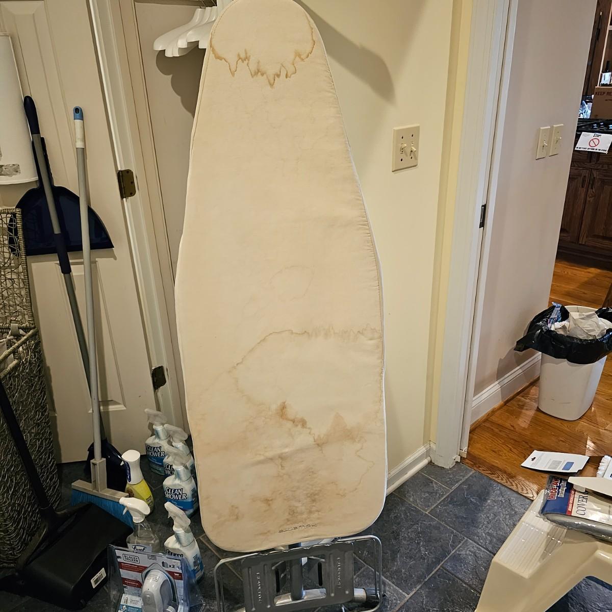 Cleaners, brooms, laundry hamper, ironing board, more. Bottles of shower clean spray, Lysol, Swiffer dusters, broom/dustpan combo. Laundry hamper is 20" x 15" x 27"H, has flip lid. Rowenta ironing board is 19" x 65" x up to 38"H. Cover spotted. Includes assorted hangers and two plastic step stools. See photos for details. Local pickup only.